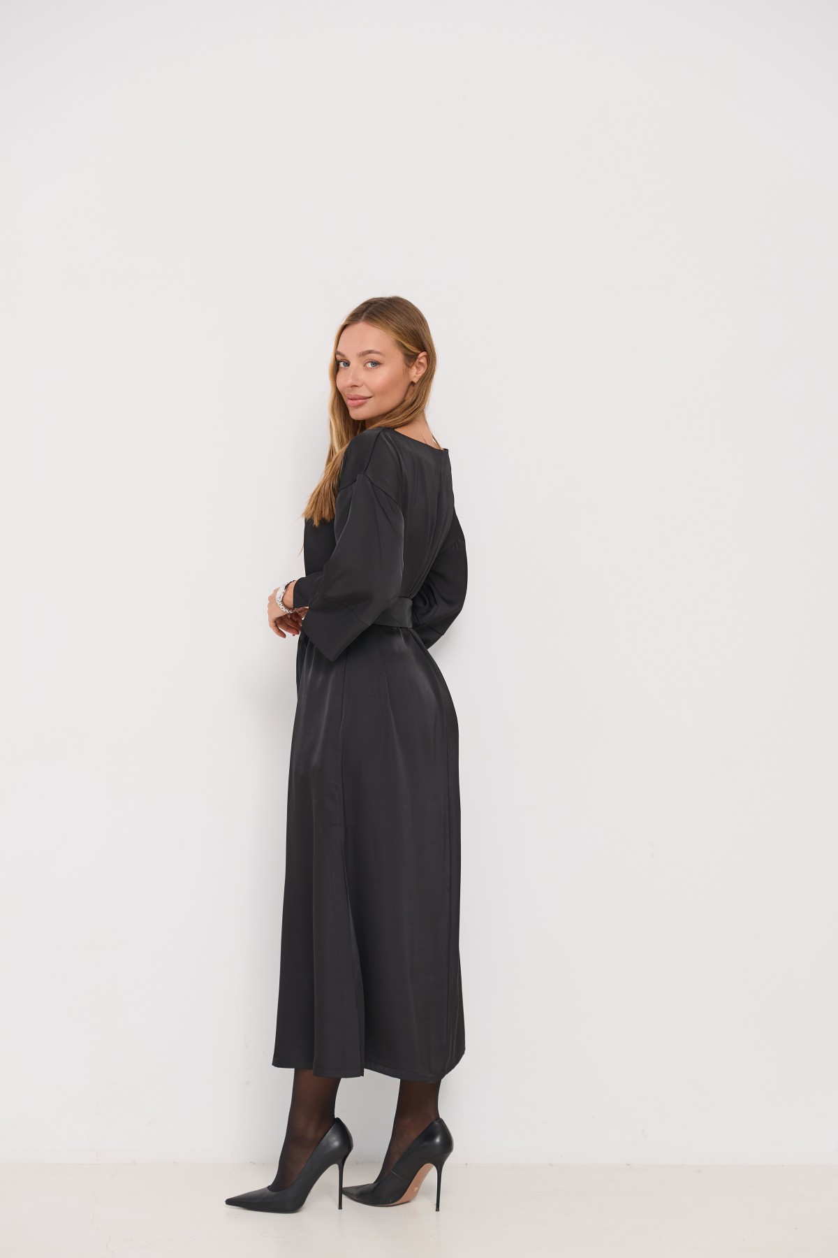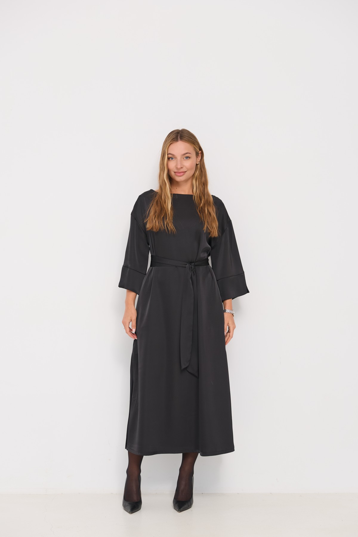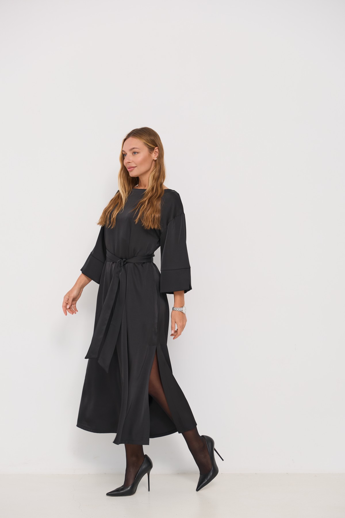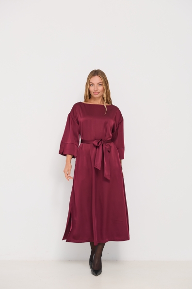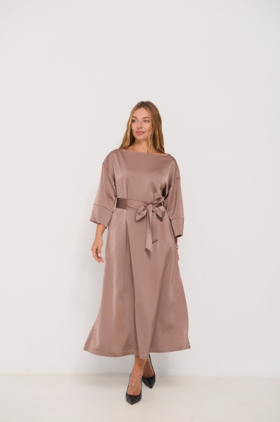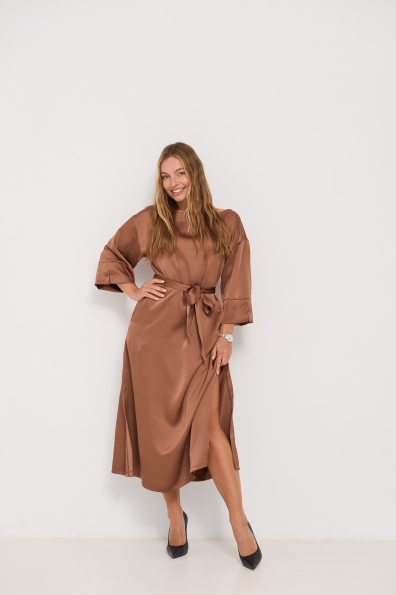 Сукня напівприлеглого силуету, з клешем по низу виробу та розрізами по бокових швах. Довжина сукні до щиколотки. Ціліснокроєний рукав по низу закінчується не регульованим манжетом. Кишені розташовані у бічному шві. Знімний пояс з основної тканини, фіксується по бічному шву шлевками. Актуальне цього сезону універсальне відмінно підійде як повсякденний одяг, і як варіант для особливих випадків.