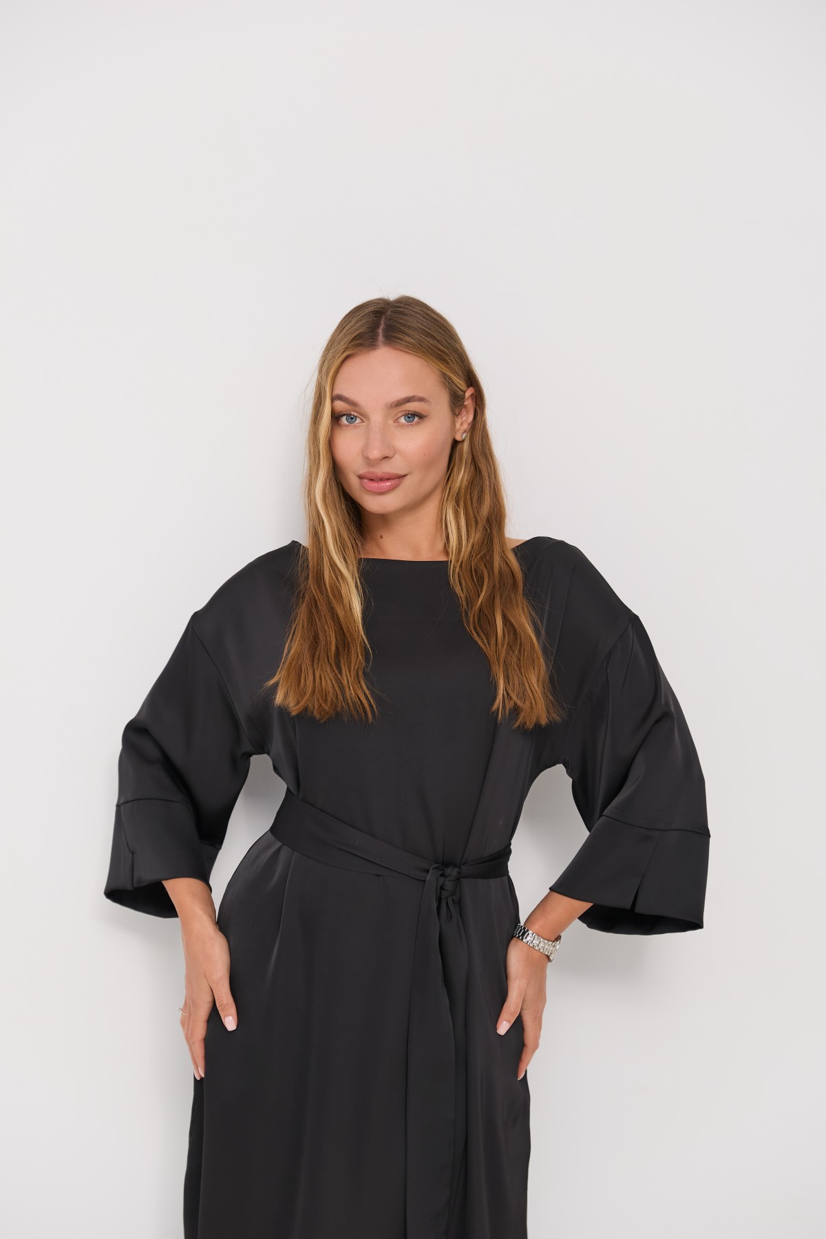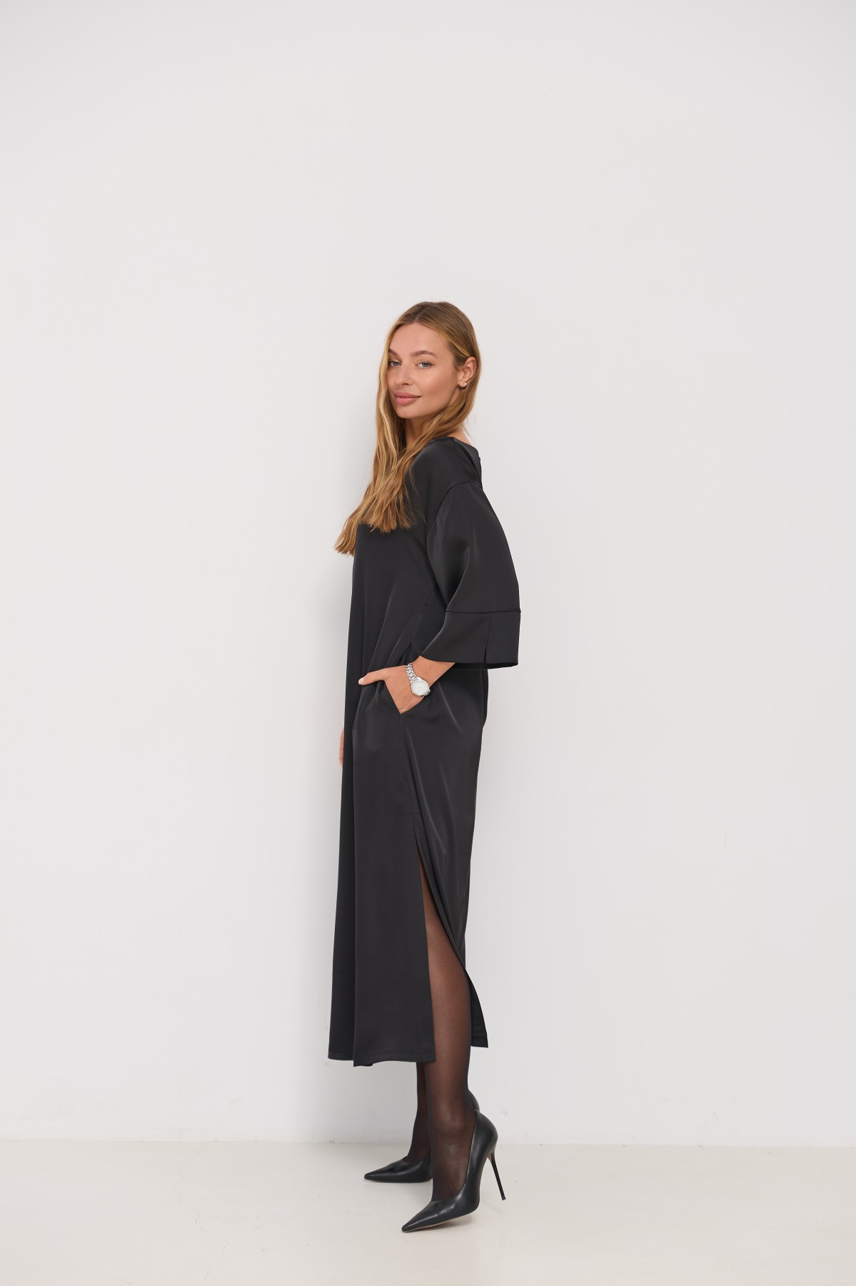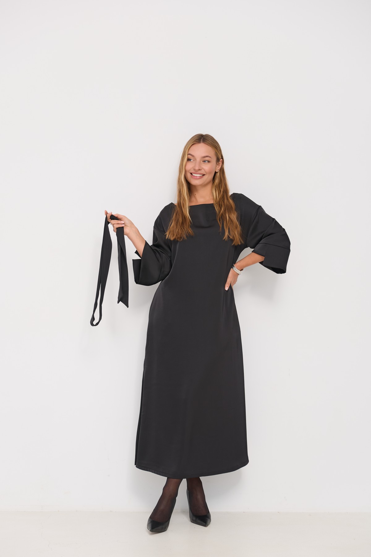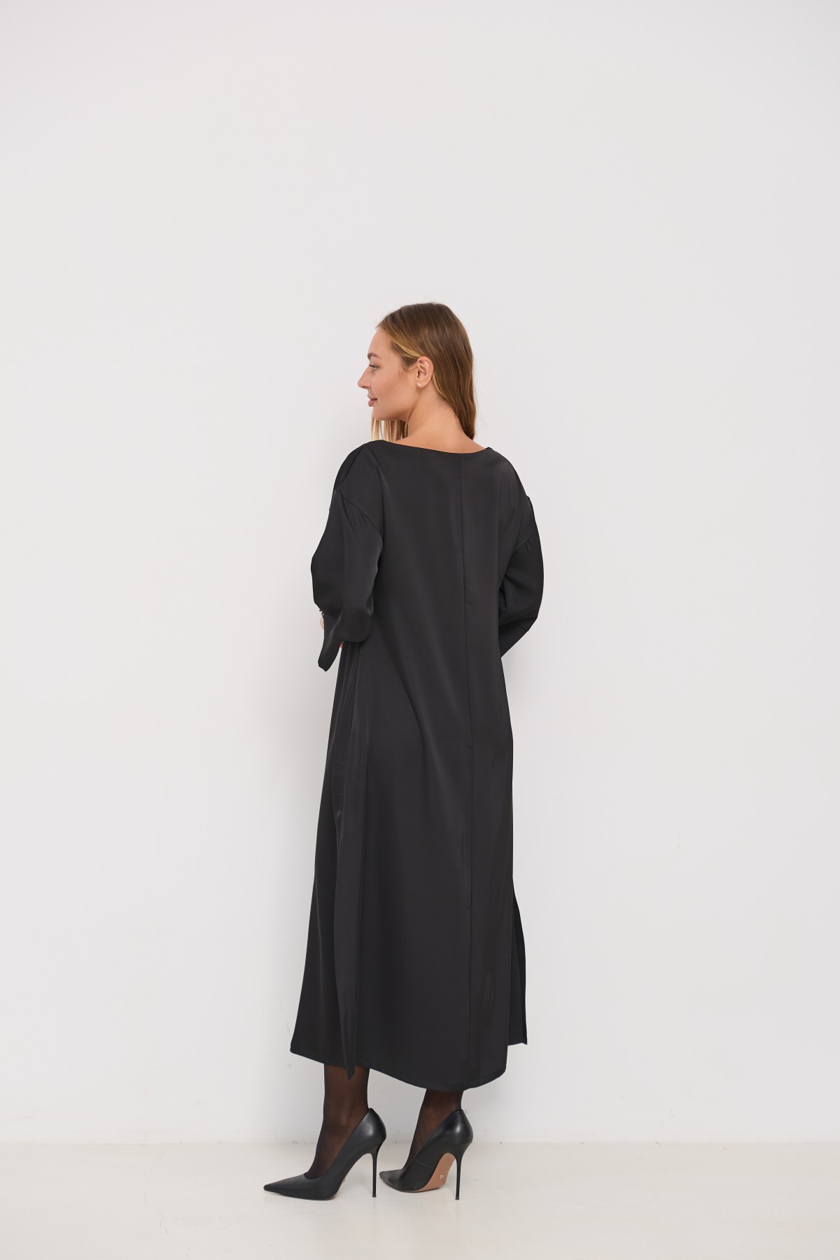 Сукня напівприлеглого силуету, з клешем по низу виробу та розрізами по бокових швах. Довжина сукні до щиколотки. Ціліснокроєний рукав по низу закінчується не регульованим манжетом. Кишені розташовані у бічному шві. Знімний пояс з основної тканини, фіксується по бічному шву шлевками. Актуальне цього сезону універсальне відмінно підійде як повсякденний одяг, і як варіант для особливих випадків.