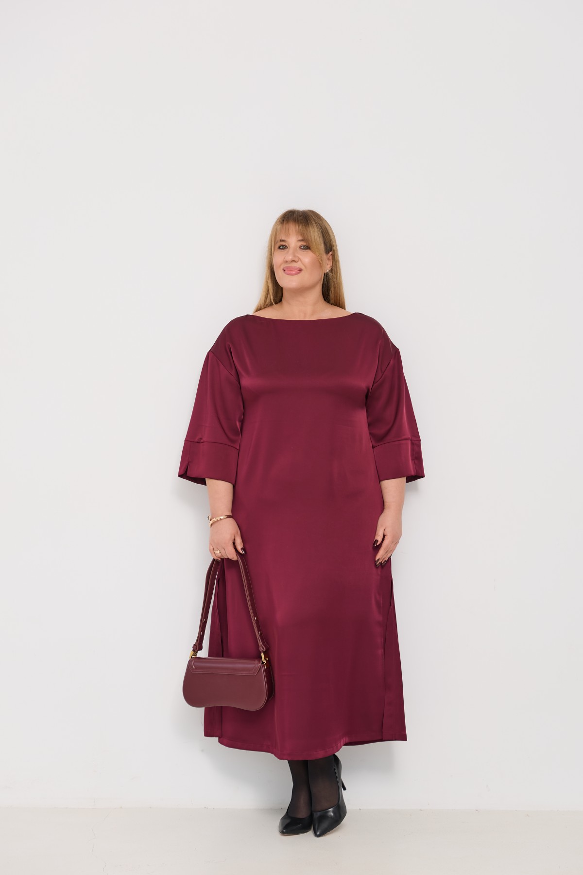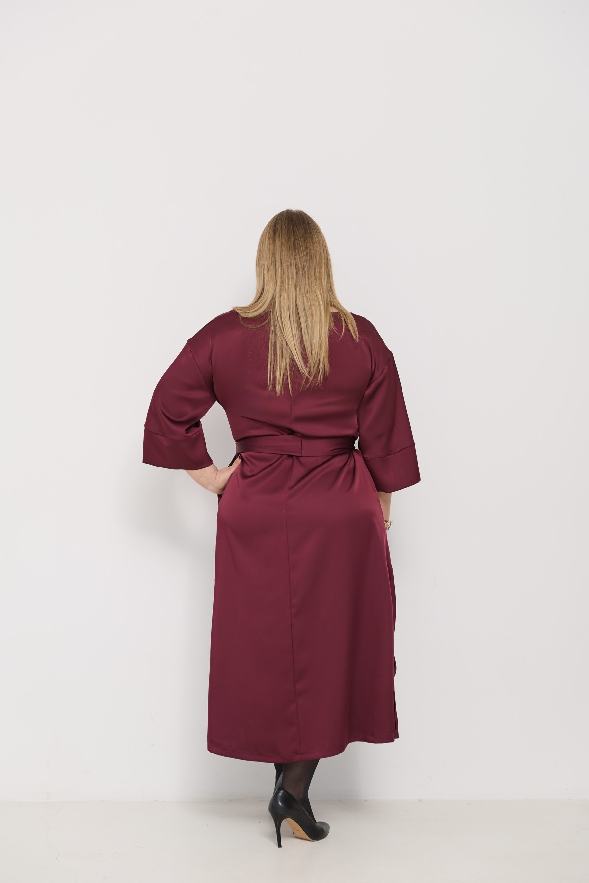 Сукня напівприлеглого силуету, з клешем по низу виробу та розрізами по бокових швах. Довжина сукні до щиколотки. Ціліснокроєний рукав по низу закінчується не регульованим манжетом. Кишені розташовані у бічному шві. Знімний пояс з основної тканини, фіксується по бічному шву шлевками. Актуальне цього сезону універсальне відмінно підійде як повсякденний одяг, і як варіант для особливих випадків.