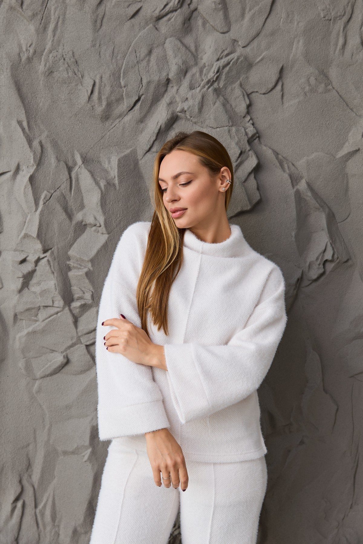 Трикотажний костюм з брюк прямого класичного крою із застроченою стрілкою по центру переднього полотнища, та кофти вільного сілуету легка трикотажна кофта з цільною стійкою під горло, з довгим рукавом 7/8, рукав по низу має широкий манжет, по боках блузи є розрізи, довжина блузи до бедра. На брюках вшита еластична резинка по талії, на брюках кишені зручно розташовані у підрізному бочці.Практичний трикотажний костюм з мякого трикотажу класичного стилю.