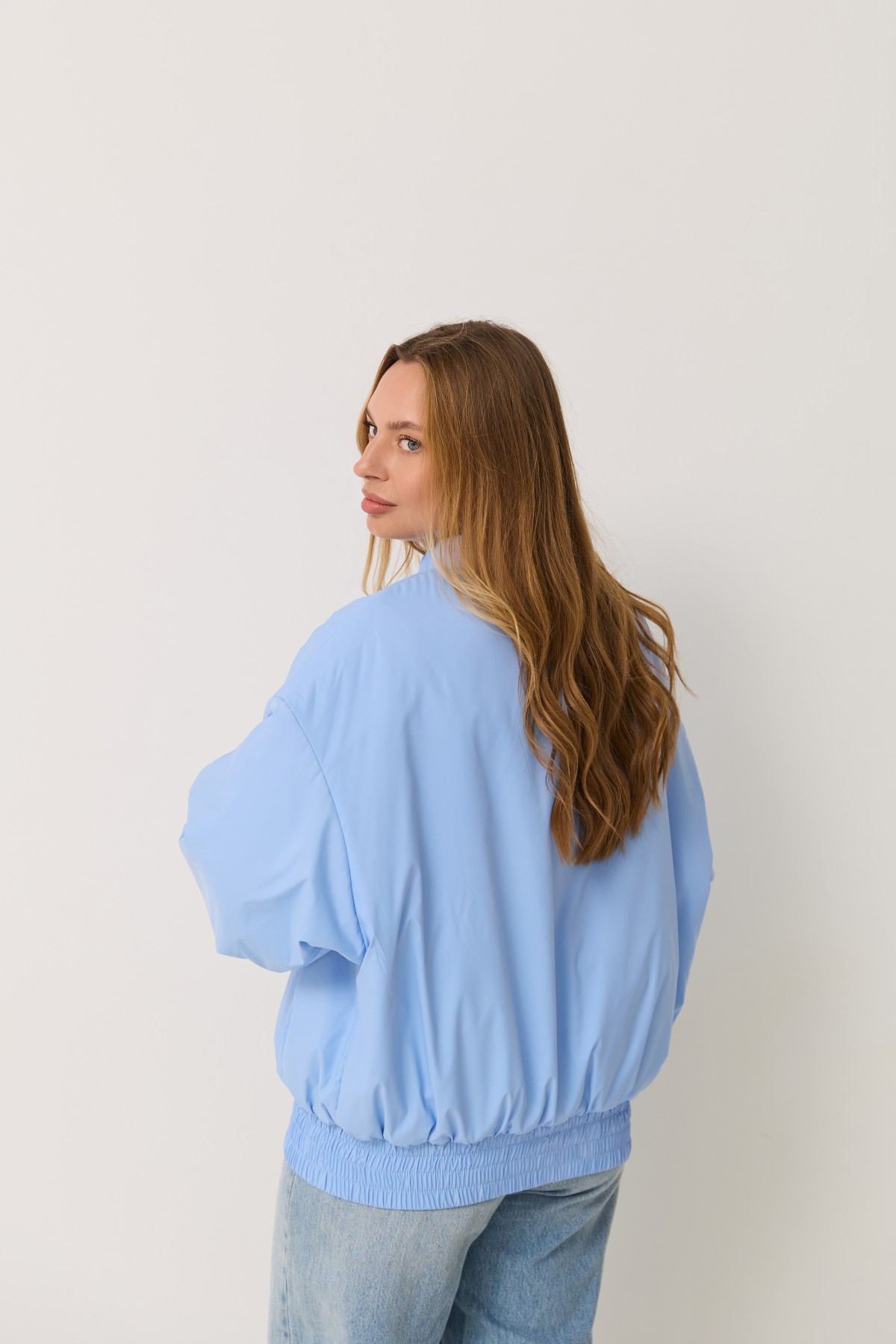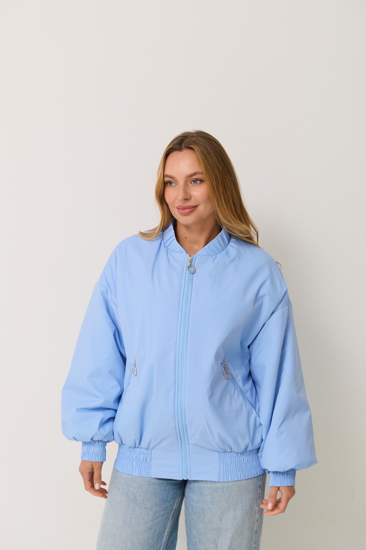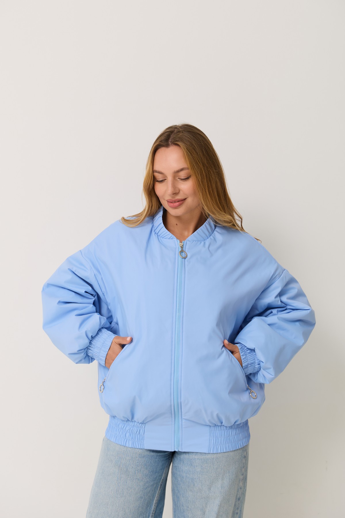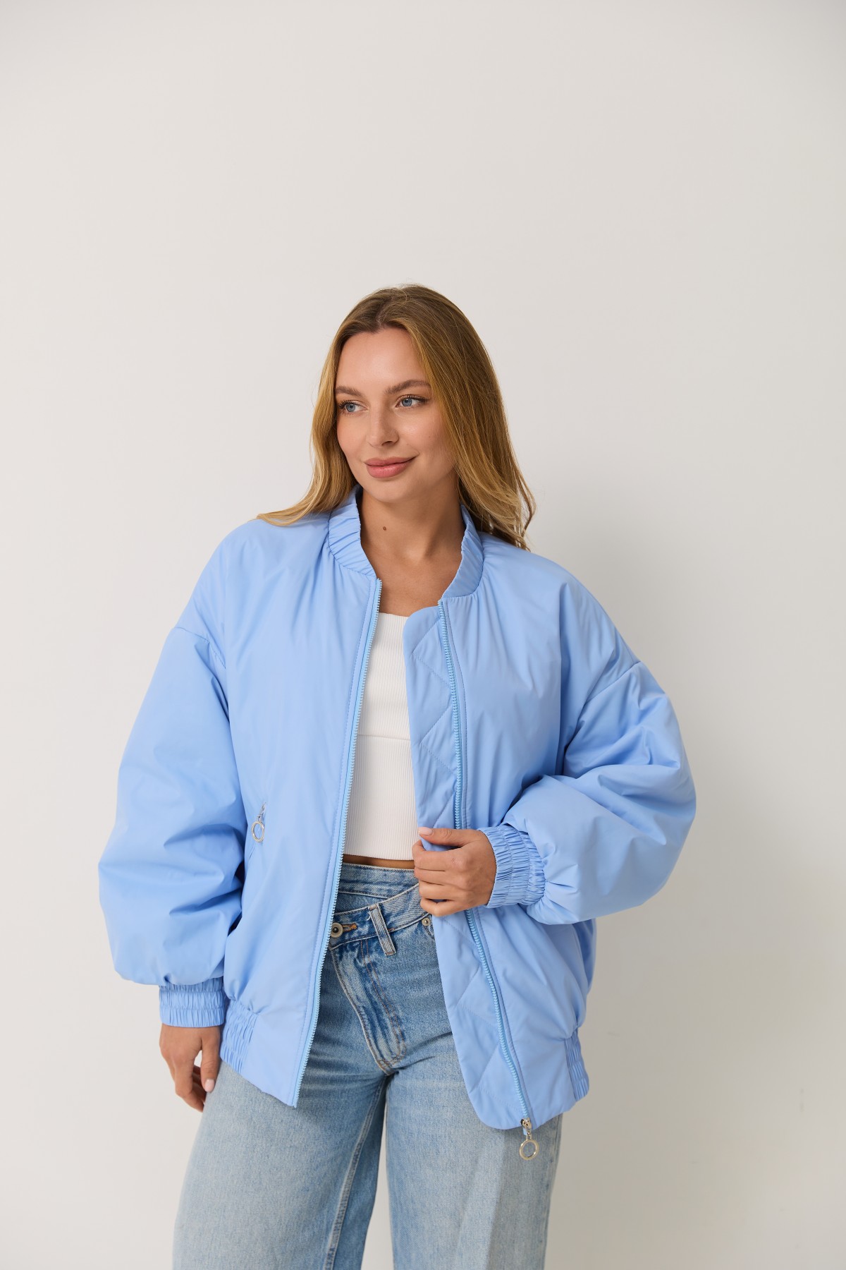 Стильна куртка-бомбер прямого підходить під стиль "спорт шик" та "кежуал". Застібка по борту на блискавці, для комфорту передбачений вітровик. Довжина куртки на рівні стегна. Низ виробу закінчується широким манжетом на гумці, що надає зручності в експлуатації. Комір-стійка еластичний завдяки гумці, можна носити як худі з капюшоном так і футболку. Втачний одношовний рукав, низ рукава закінчується манжетом на резинці.
