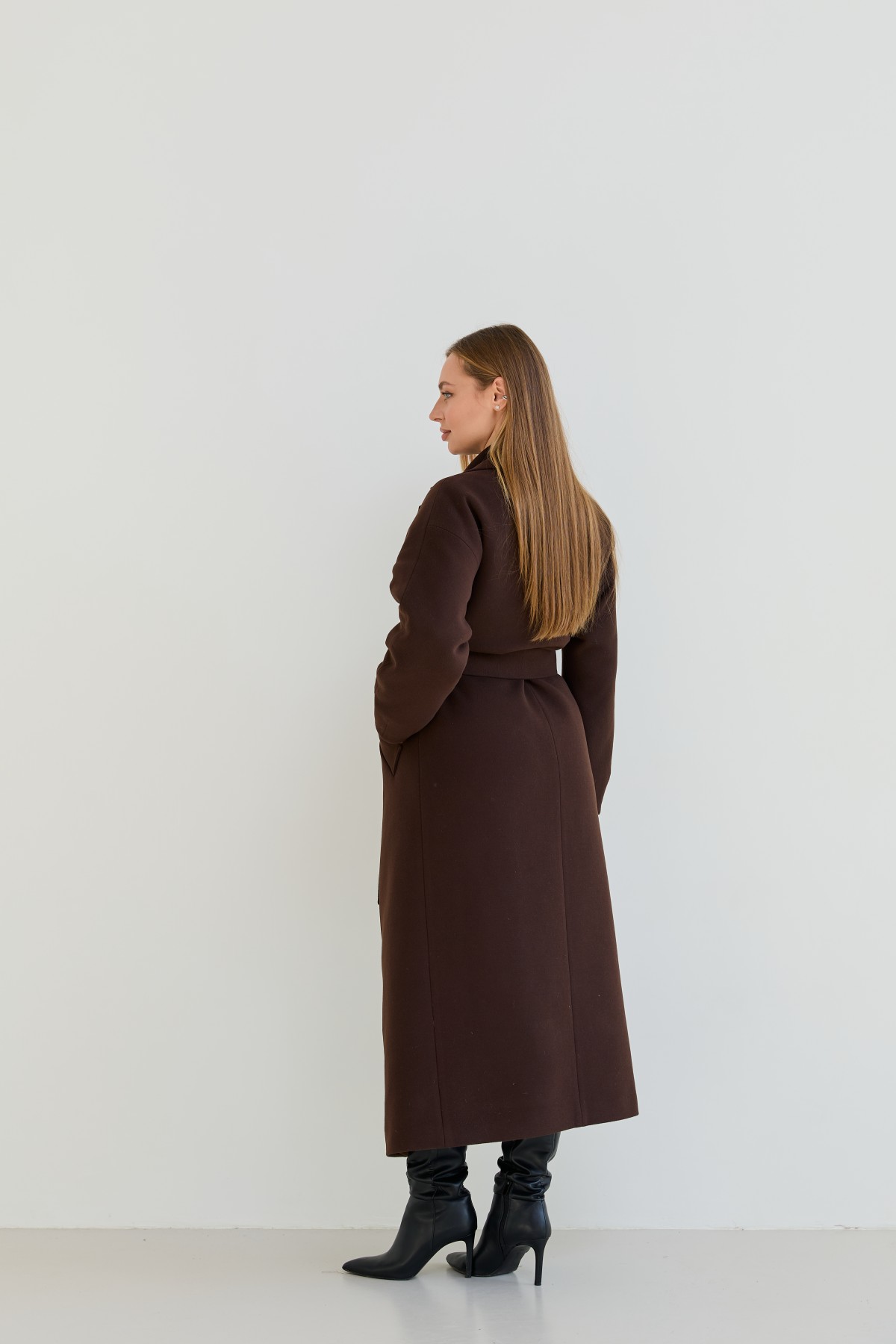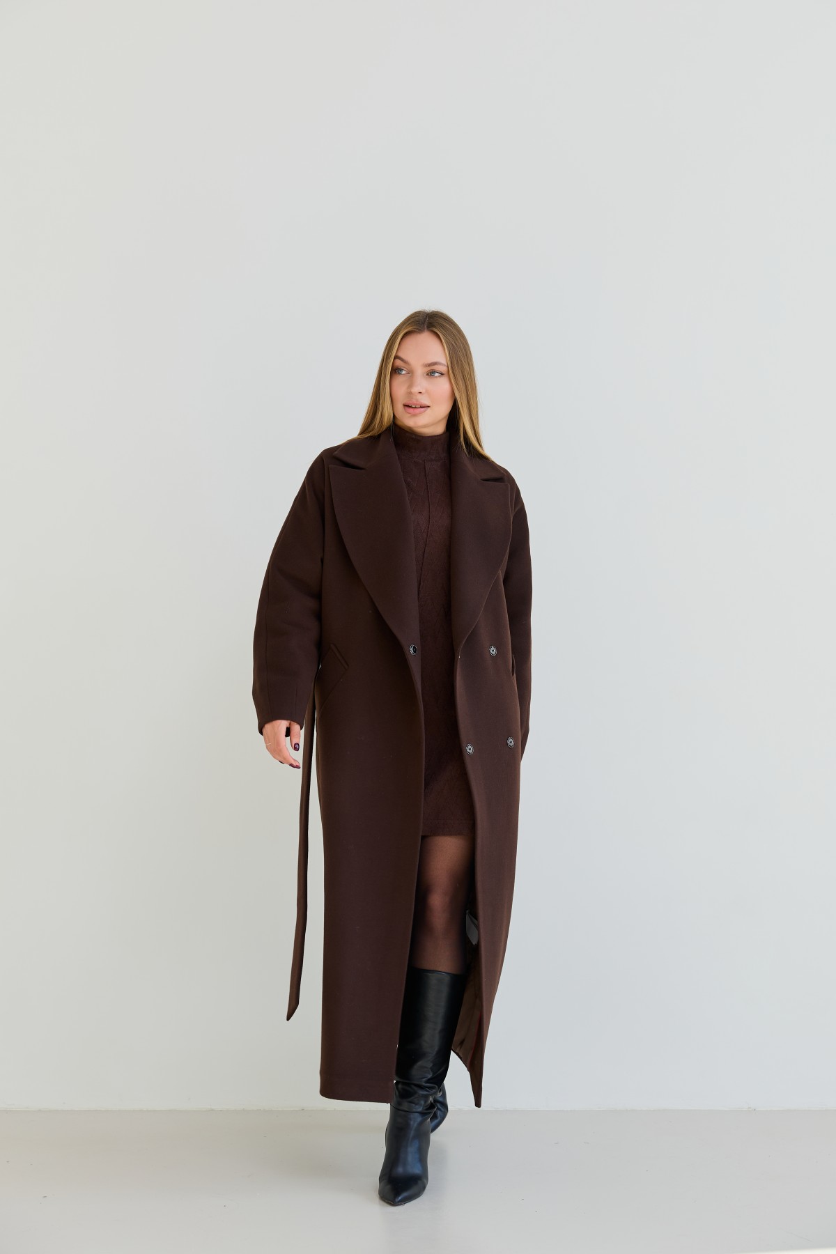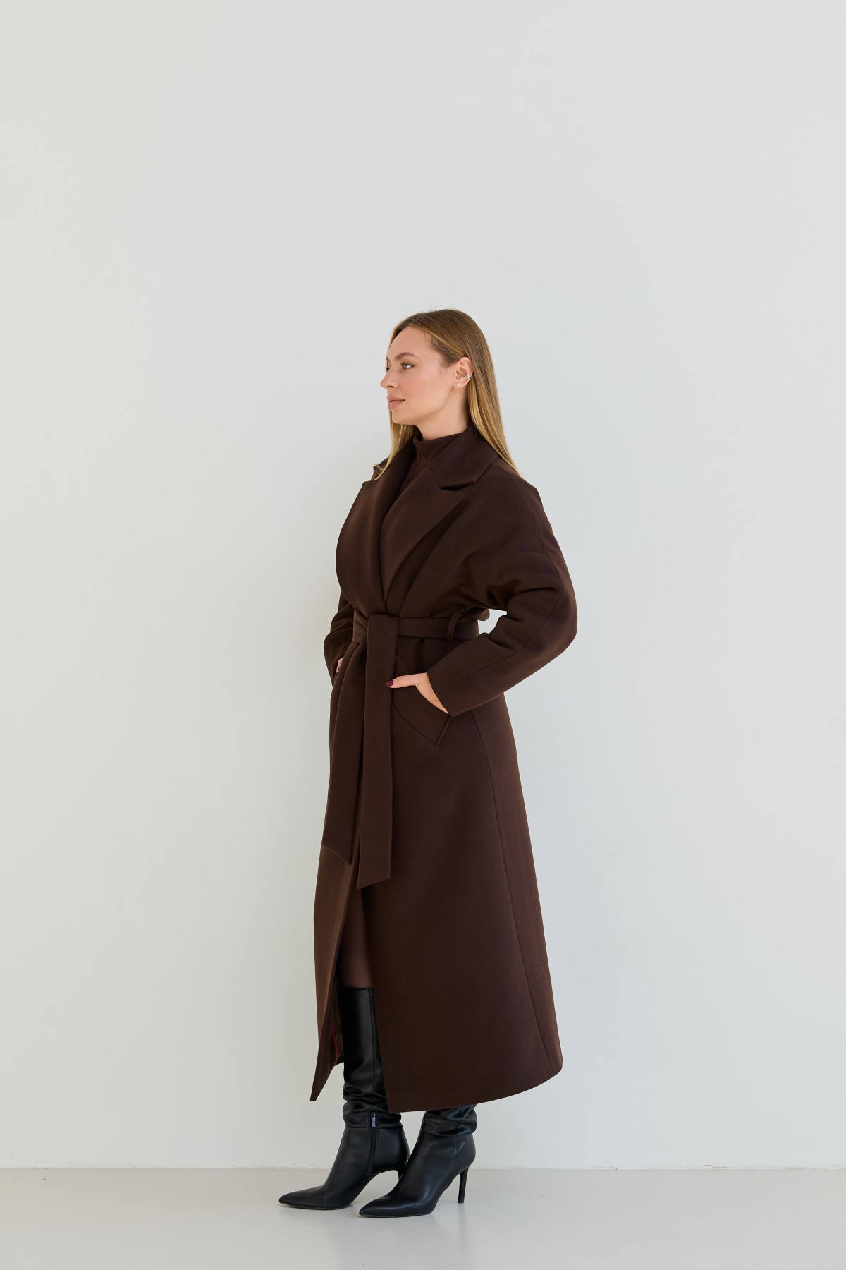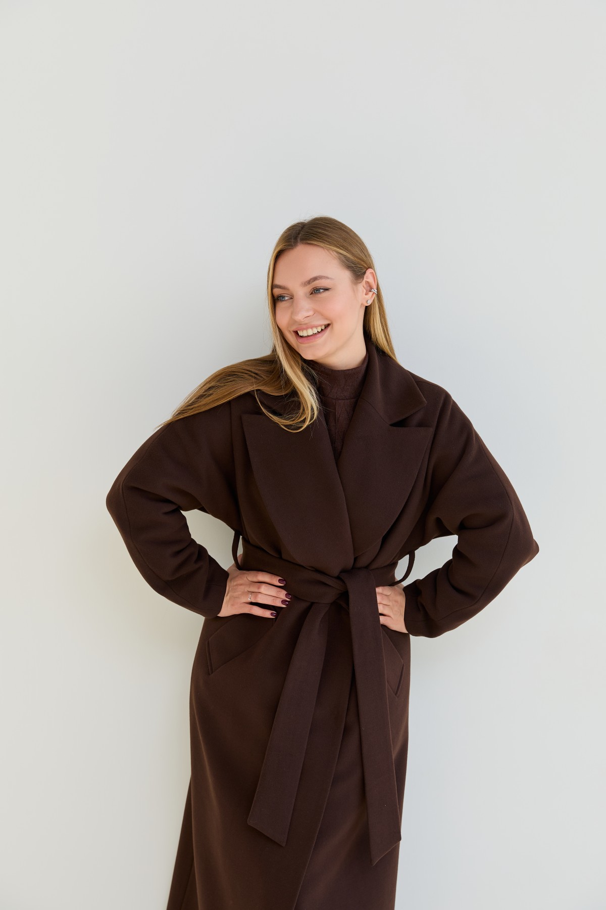 Універсальне "пальто-сорочка" прямого силуету в стилі "кежуал". Довжина пальто нижче лінії стегна. Застібка по борту полички на петлі та гудзики. Комір відкладний. Одношовний рукав. Низ рукава закінчується манжетом із декоративним елементом у вигляді хлястика на якому розташована петля.Нагрудна накладна кишеня з клапаном. Кишеня листочка. Лінія талії фіксується знімним поясом на шльовках. Новинка цього сезону – стильне пальто. Чудово підходить на кожен день. Його можна носити як під класичне взуття, так і міксувати зі спортивним стилем.