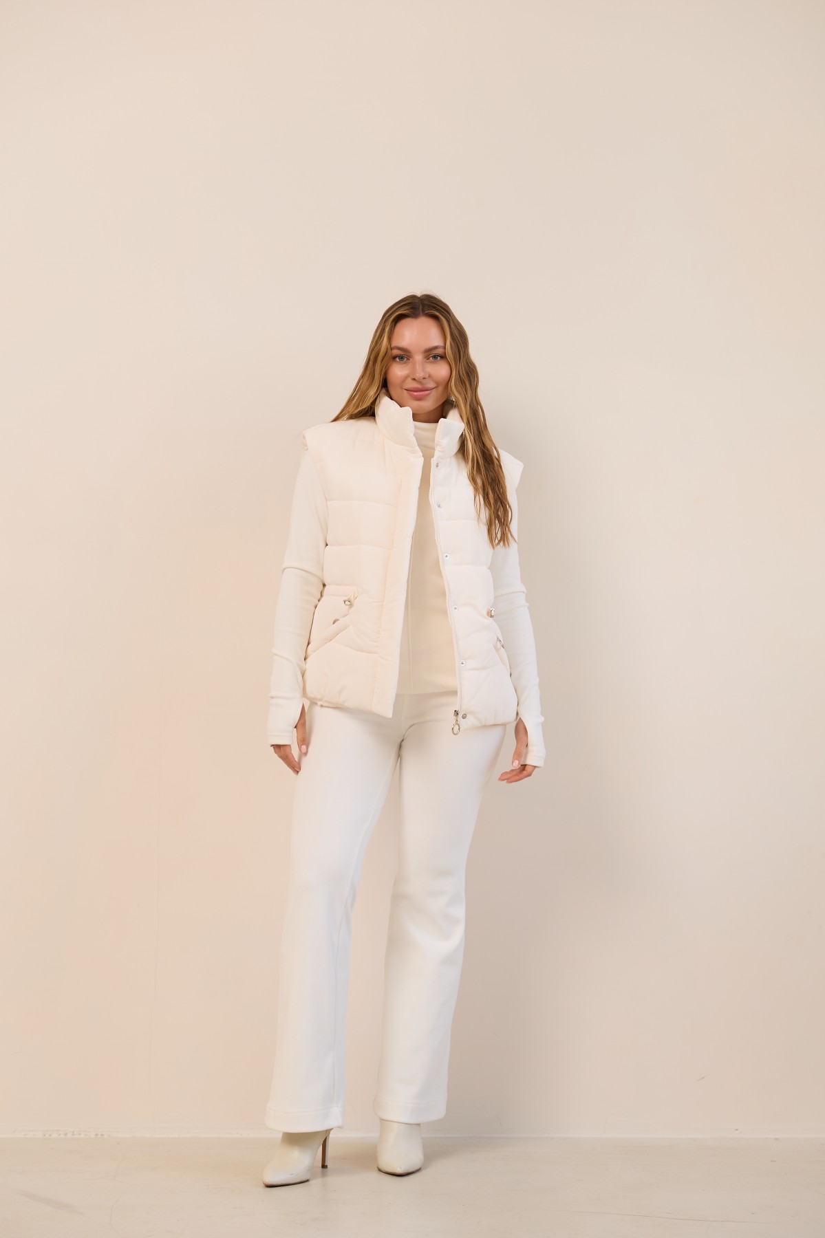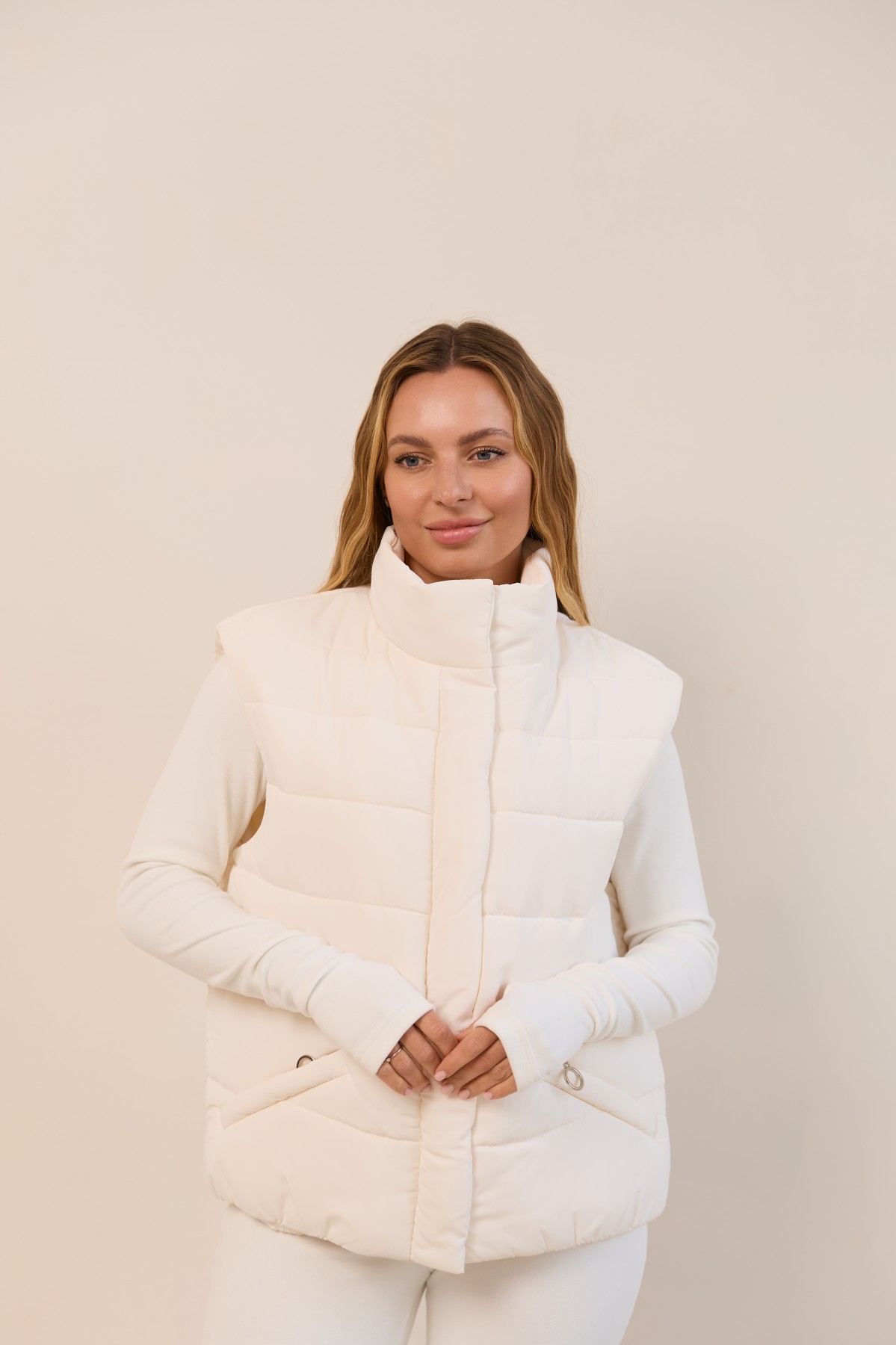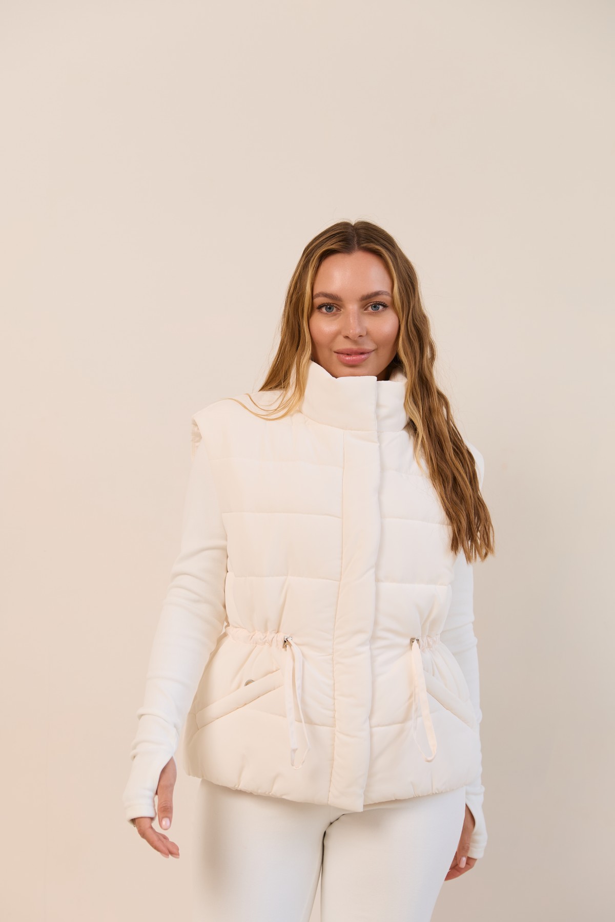 Універсальний стьобаний жилет прямого силуету в класичному стилі. Довжина вище лінії стегон. Застібка по борту полички на блискавці та планці з кнопками. Комір-стійка із застібкою на магніті. Кишеня-листочка на блискавці, зручно розташована. Куліса по лінії талії фіксується тонким пояском із фіксатором. Хіт цього сезону універсальний стьобаний жилет