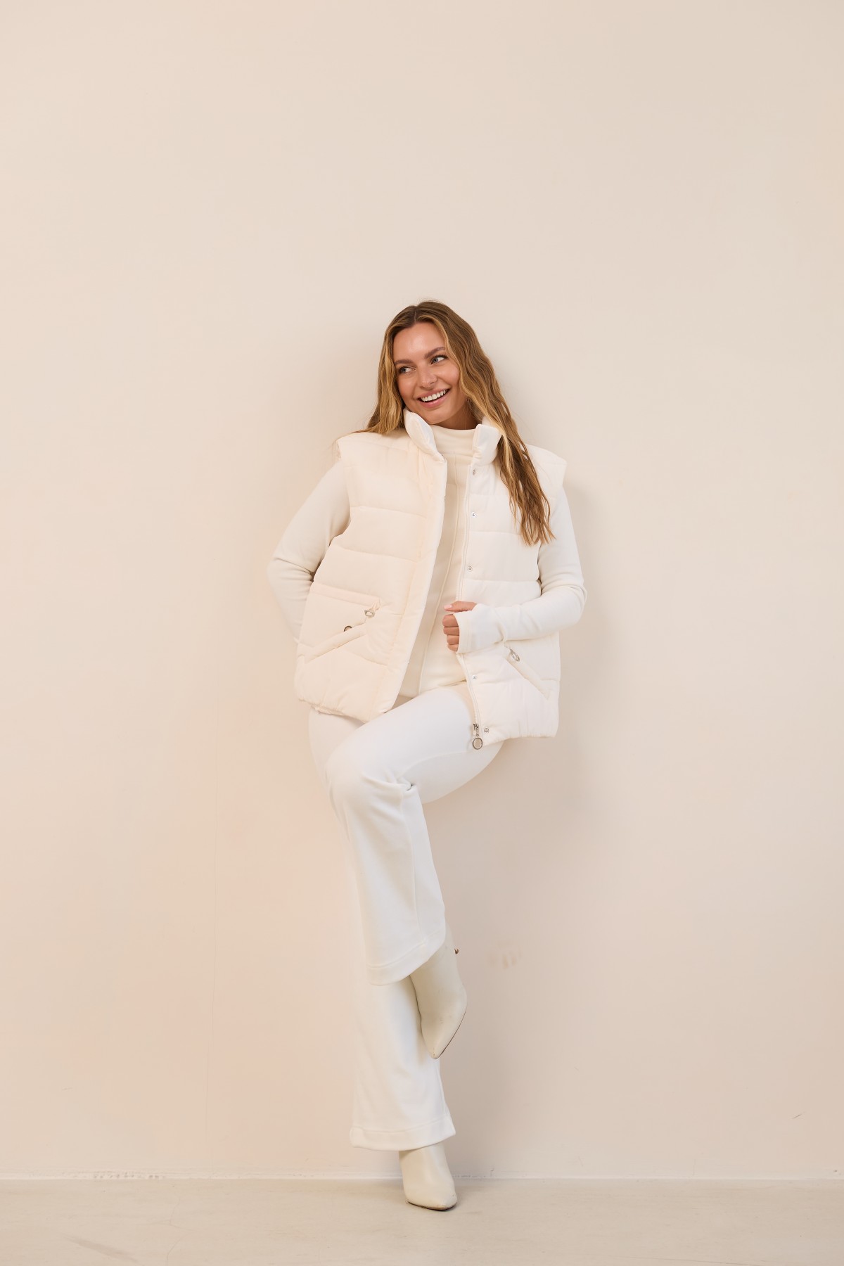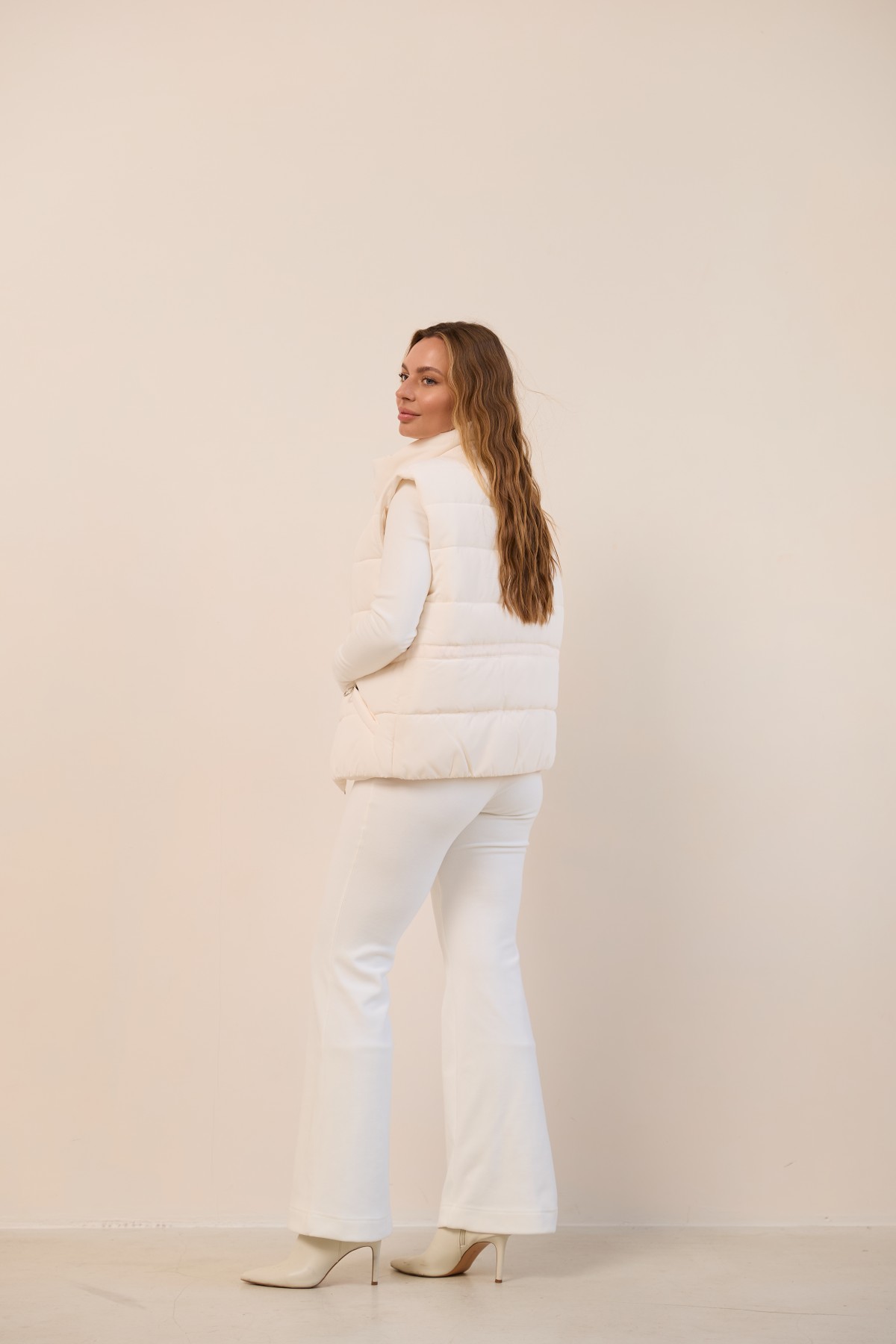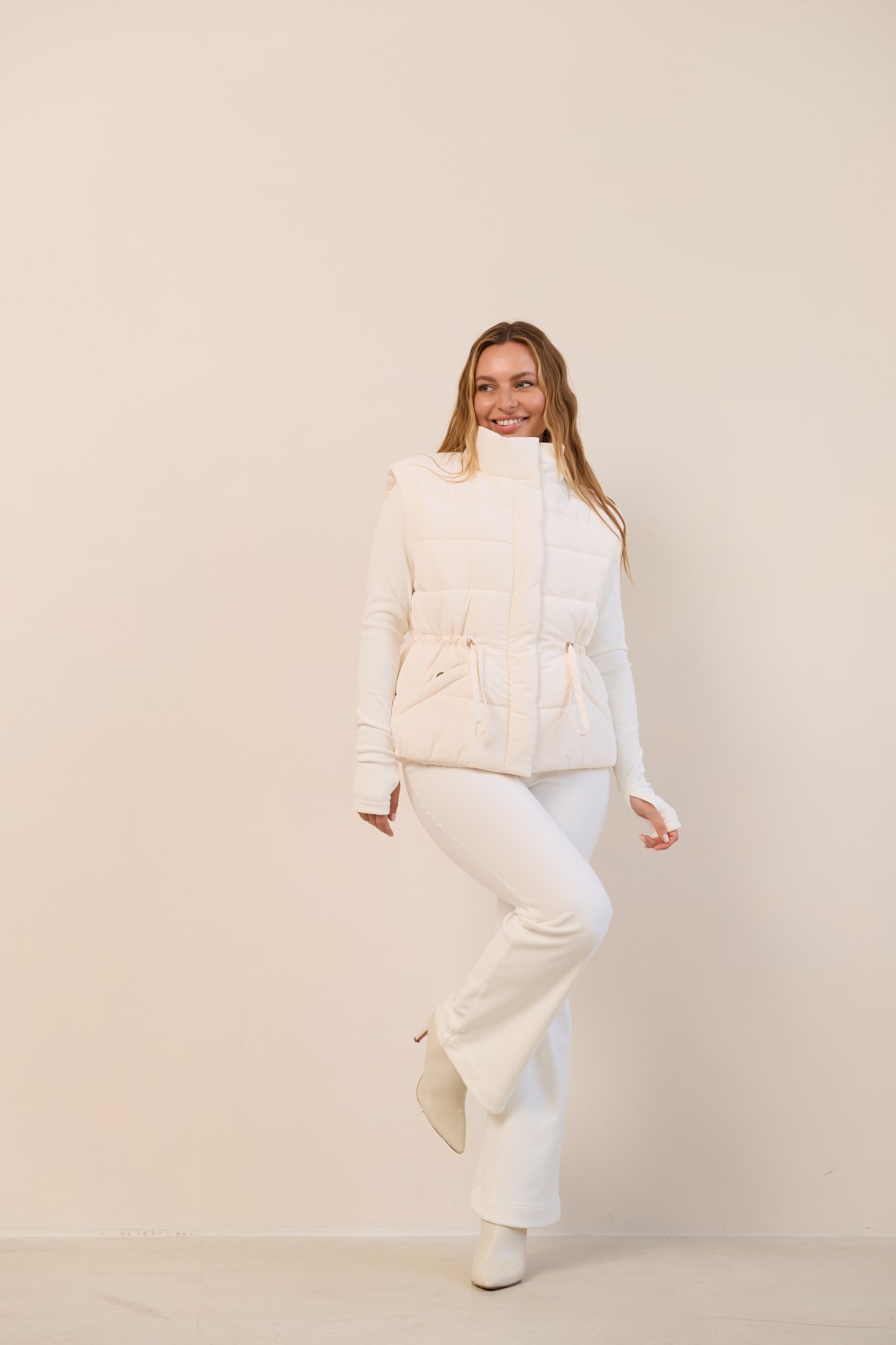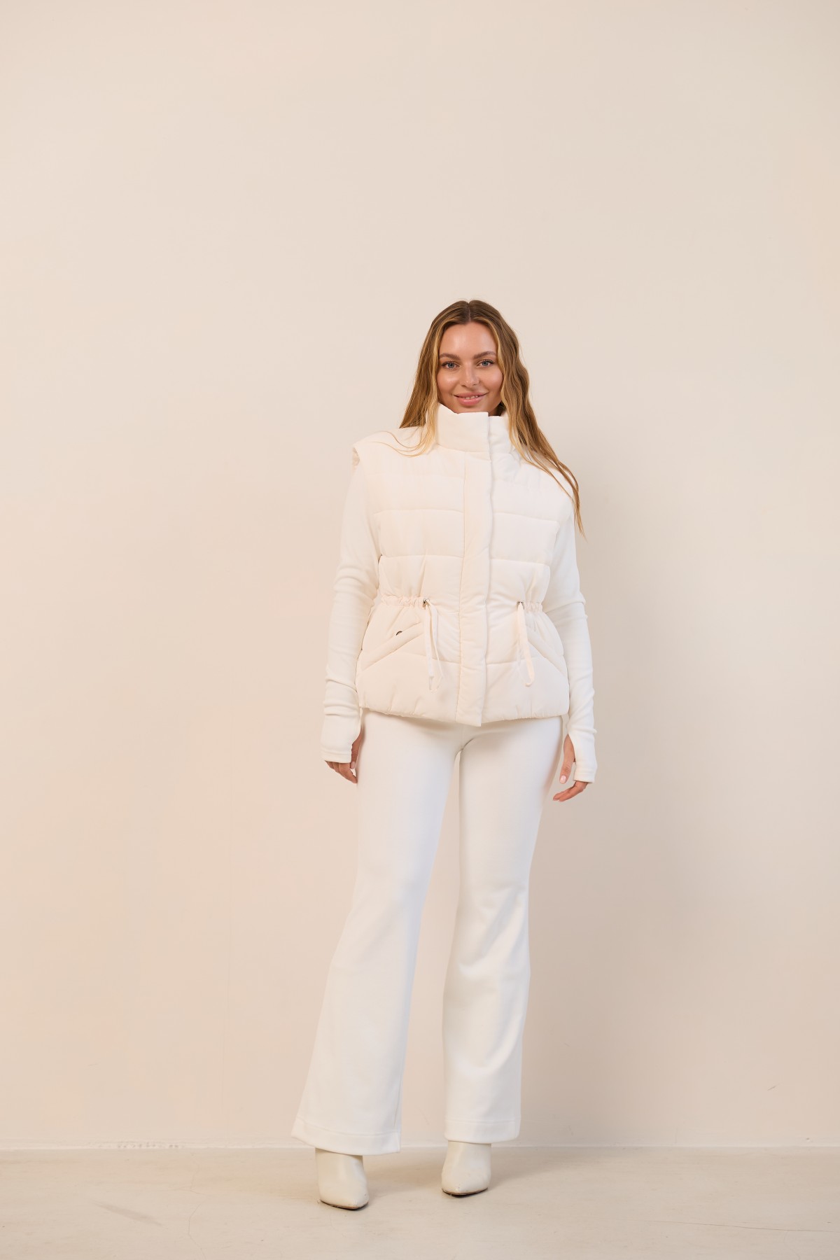Універсальний стьобаний жилет прямого силуету в класичному стилі. Довжина вище лінії стегон. Застібка по борту полички на блискавці та планці з кнопками. Комір-стійка із застібкою на магніті. Кишеня-листочка на блискавці, зручно розташована. Куліса по лінії талії фіксується тонким пояском із фіксатором. Хіт цього сезону універсальний стьобаний жилет