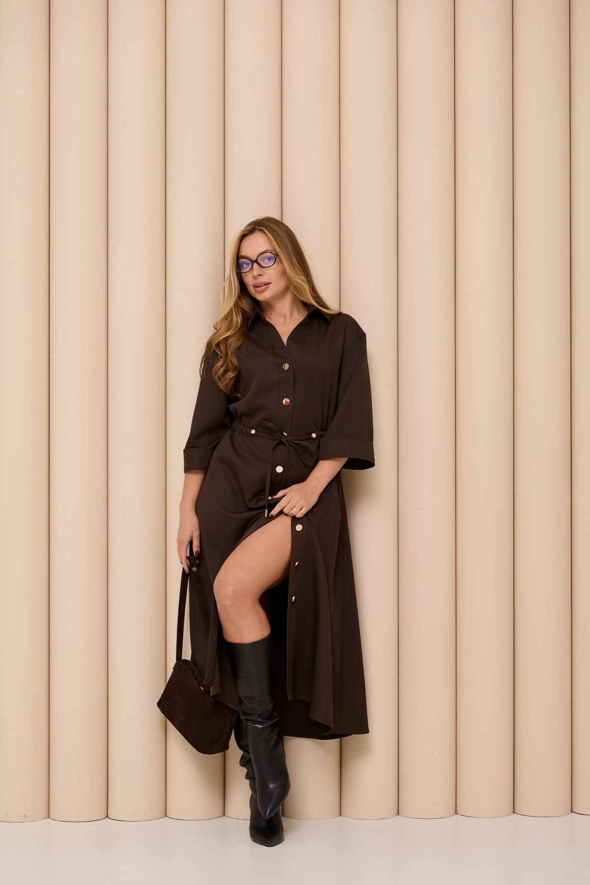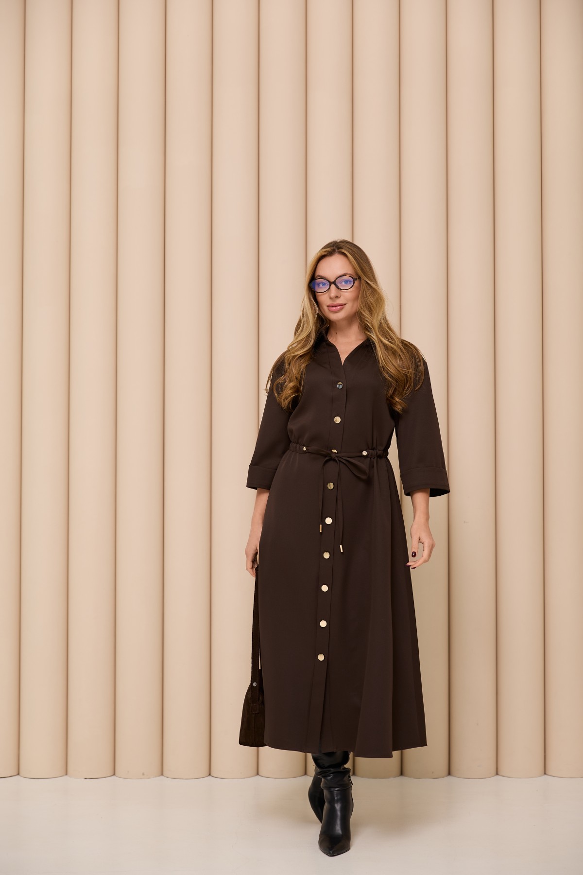 Универсальное платье полуприлегающего силуэта по низу расклещеная юбка в стиле "кежуал" Длина платья до середины икры. Воротник втачной по стилю "поло". Застежка по полочке планка на петли с пуговицами. Рукав со спущенной проймой длиной 3/4 с манжетом по низу. Пояс-кулиса с фиксаторами.Новинка этого сезона универсальное базовое платье, которое можно сочетать с жакетом или одеть поверх вязаный свитер. Отлично подходит для торжественного случая, романтичных прогулок.