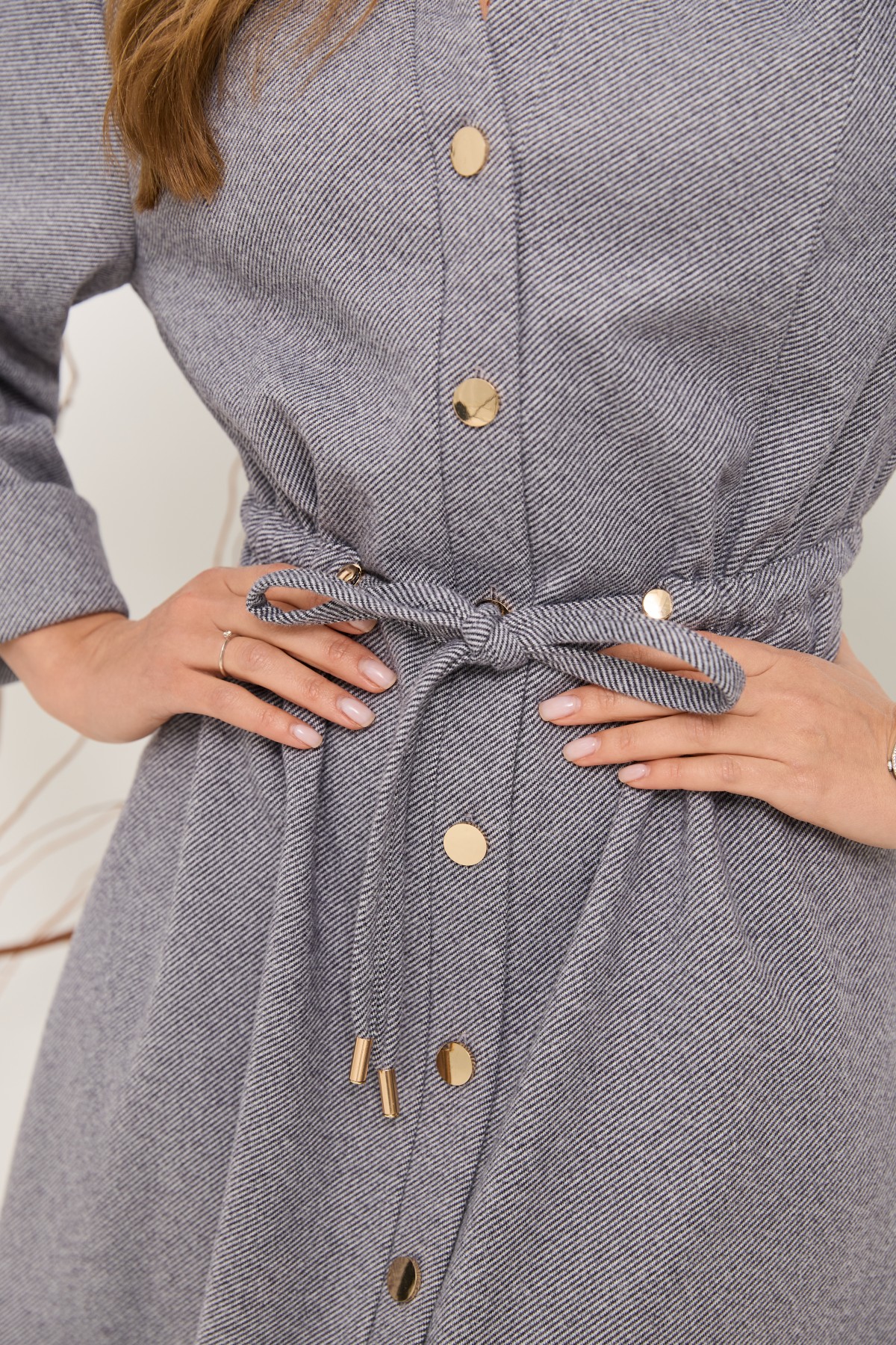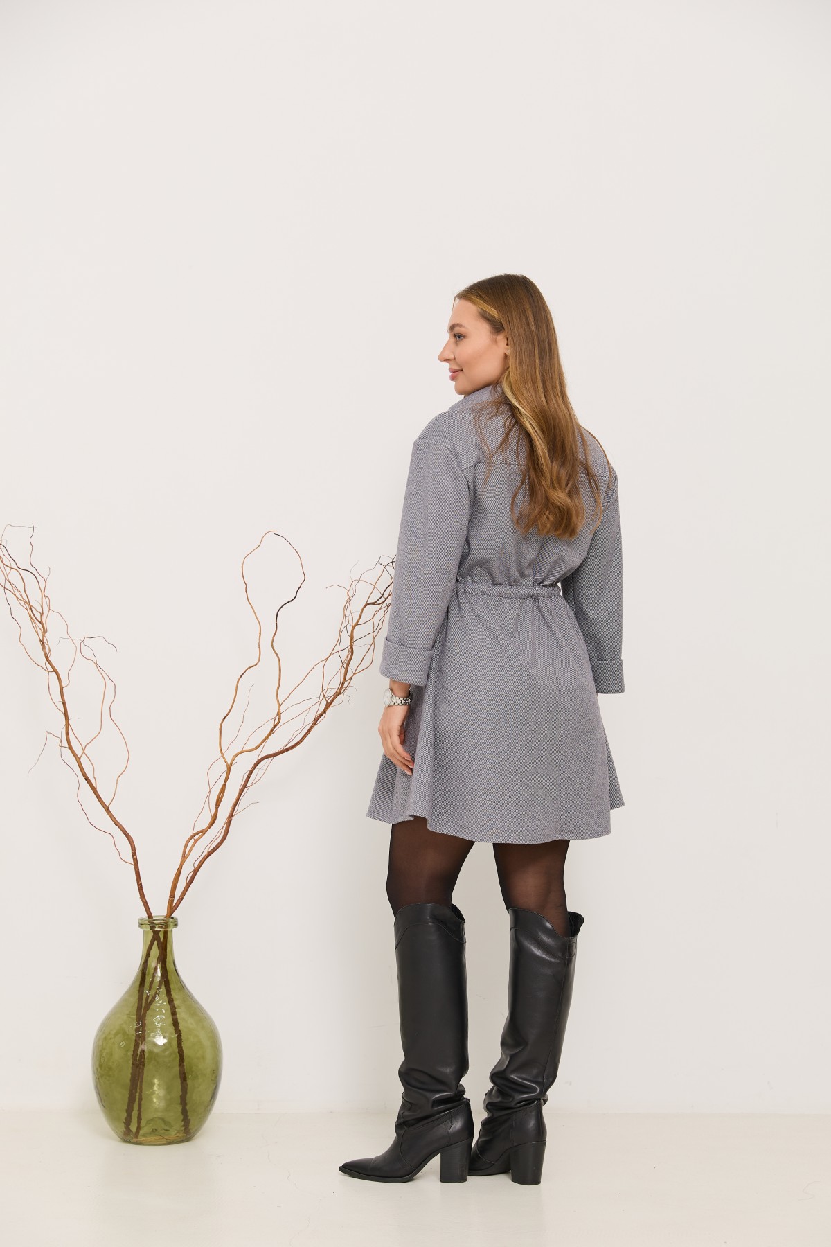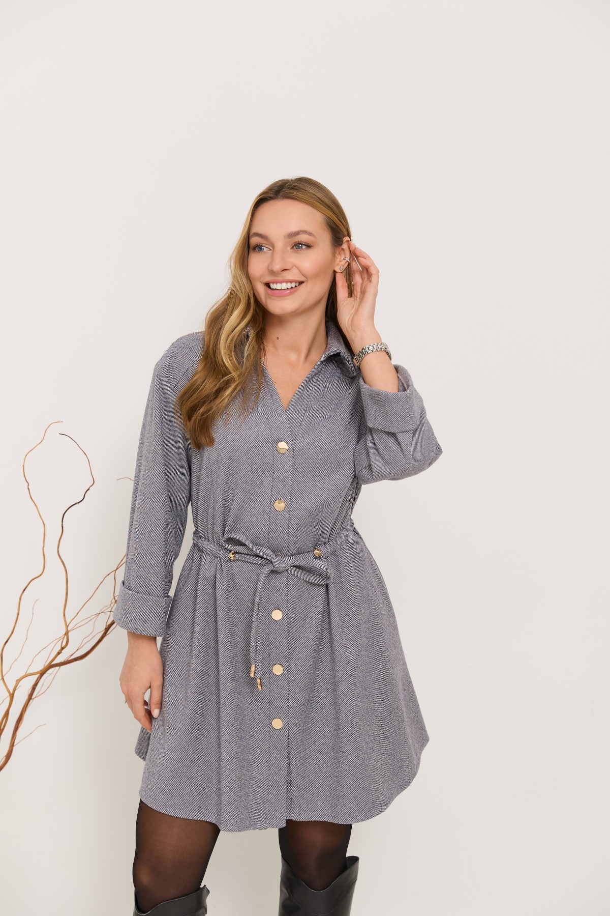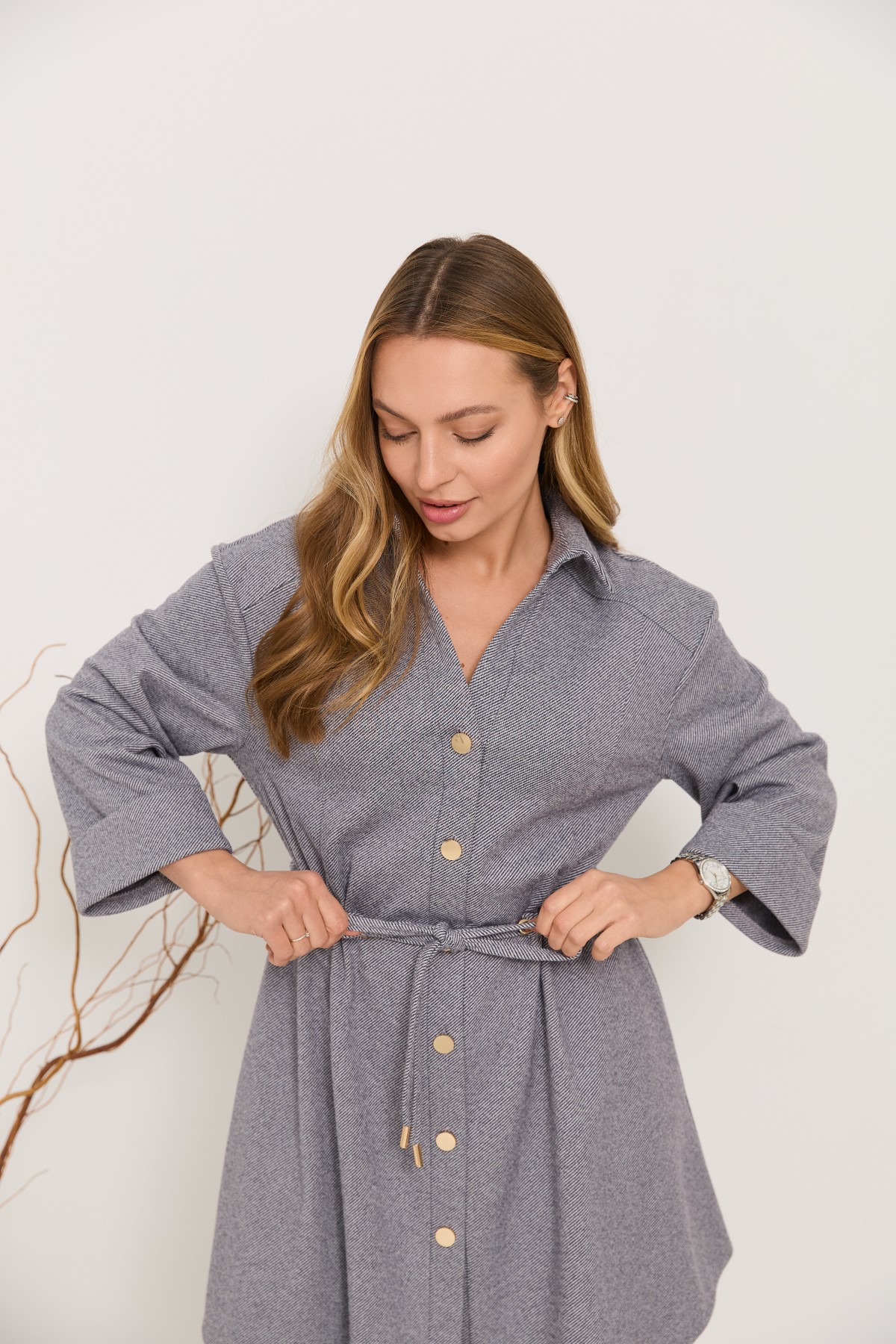 Універсальна сукня напівприлеглого силуету внизу розкльошена спідниця в стилі "кежуал" Довжина сукні вище коліна. Застібка по поличці планка на петлі з гудзиками. Комір втачний за стилем "поло". Рукав зі спущеною проймою довжиною 3/4 з манжетом по низу.