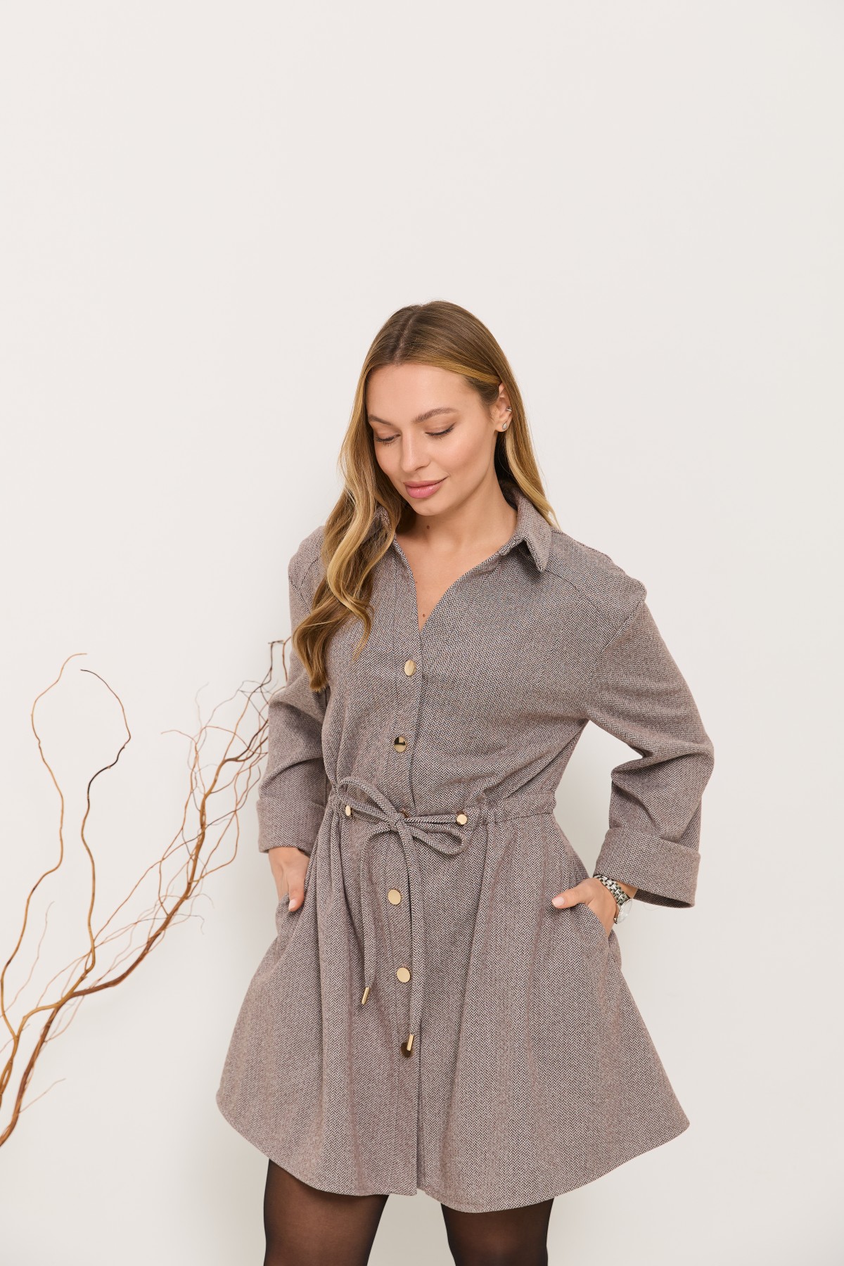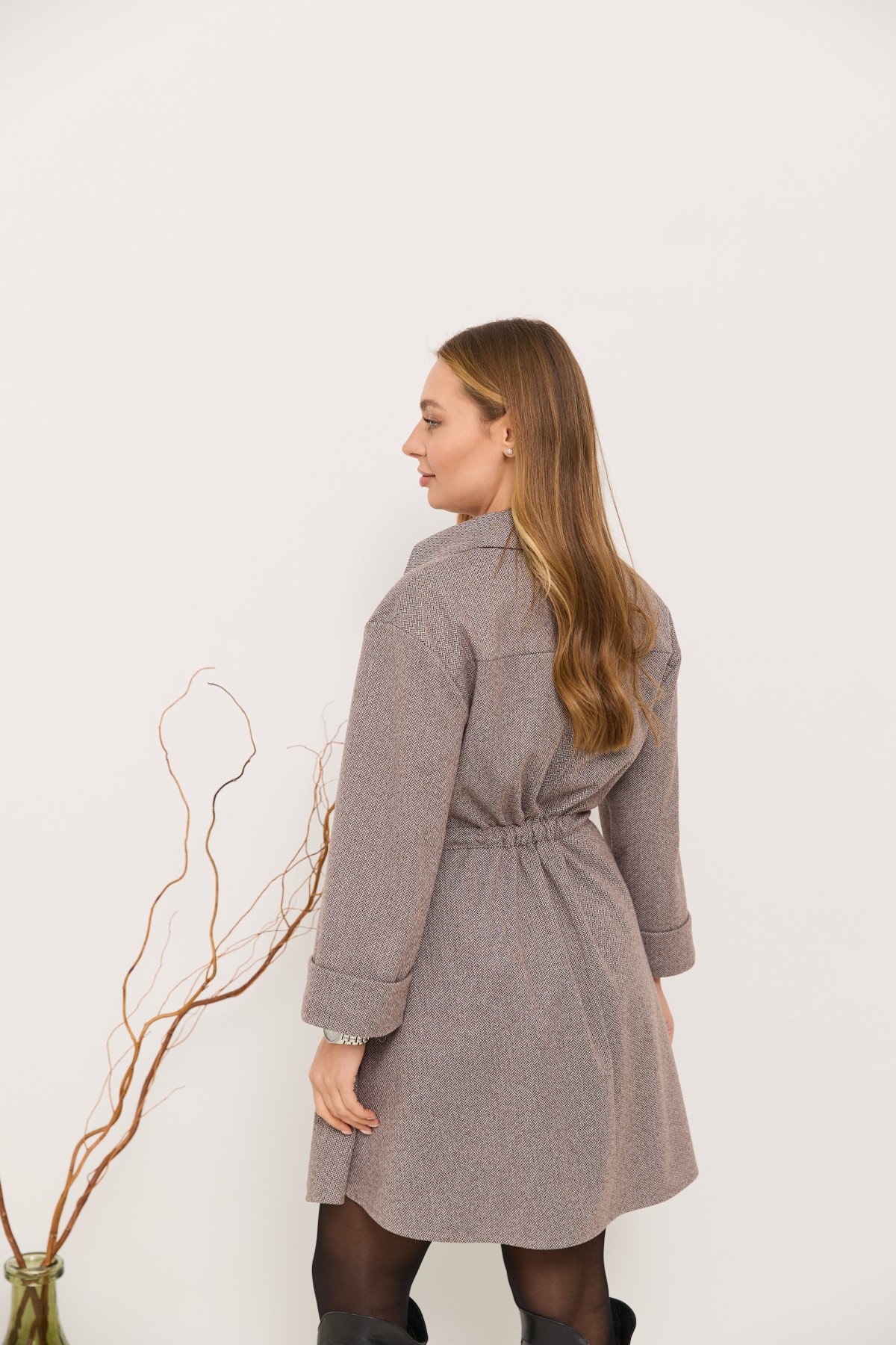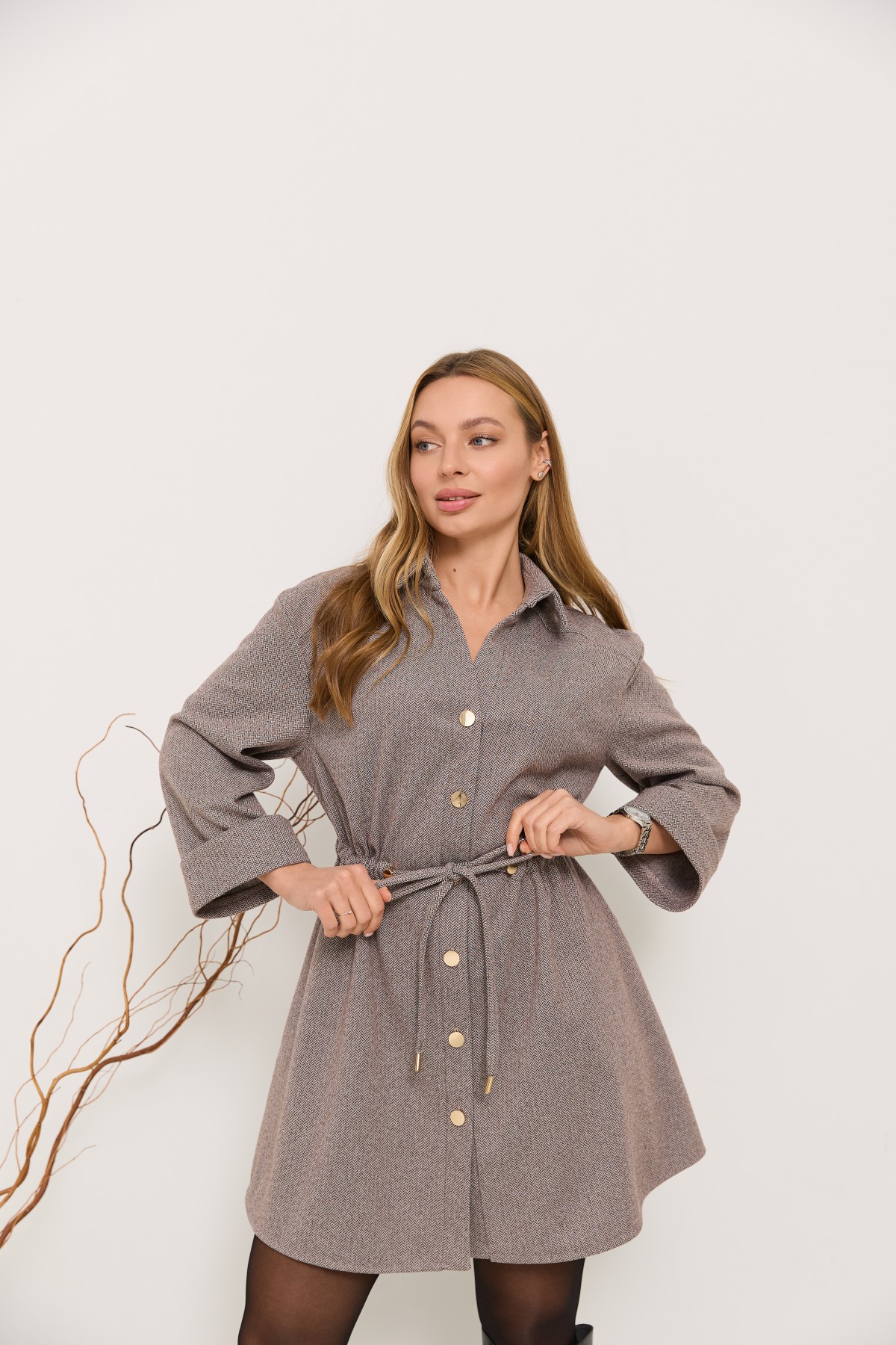 Універсальна сукня напівприлеглого силуету по низу спідниця в стилі "кежуал" Довжина сукні вище коліна. Застібка по поличці планка на петлі з гудзиками. Комір втачний за стилем "поло". Рукав зі спущеною проймою довжиною 3/4 з манжетом унизу. Пояс-куліса із фіксаторами.