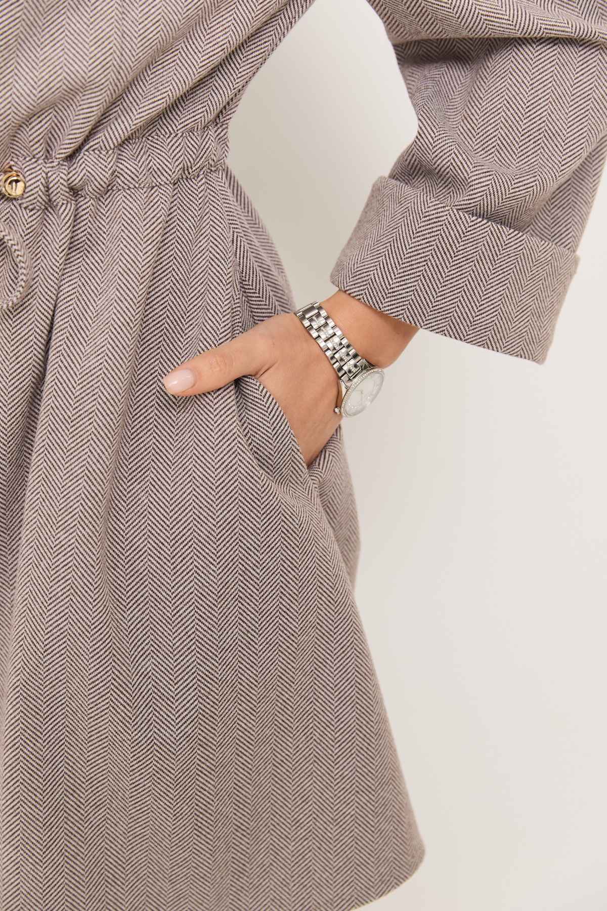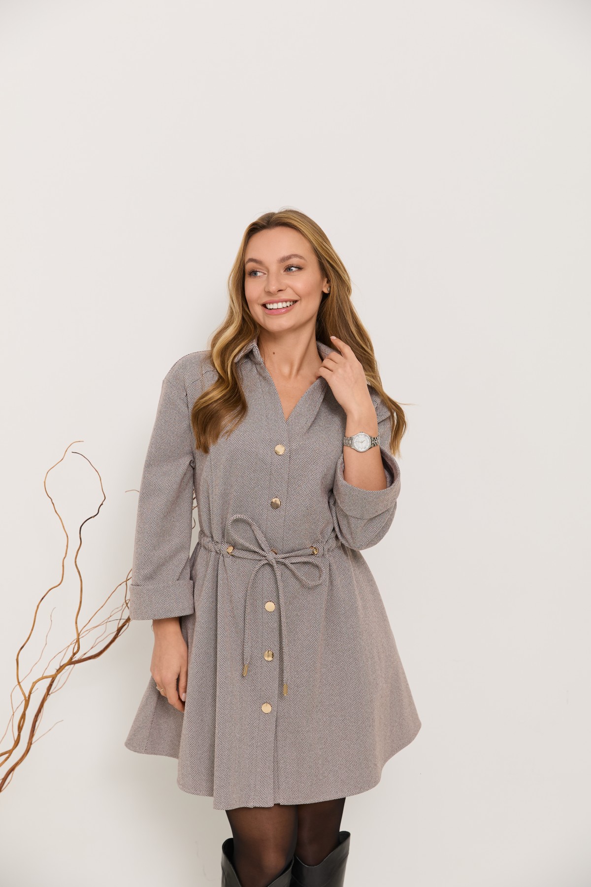 Універсальна сукня напівприлеглого силуету по низу спідниця в стилі "кежуал" Довжина сукні вище коліна. Застібка по поличці планка на петлі з гудзиками. Комір втачний за стилем "поло". Рукав зі спущеною проймою довжиною 3/4 з манжетом унизу. Пояс-куліса із фіксаторами.