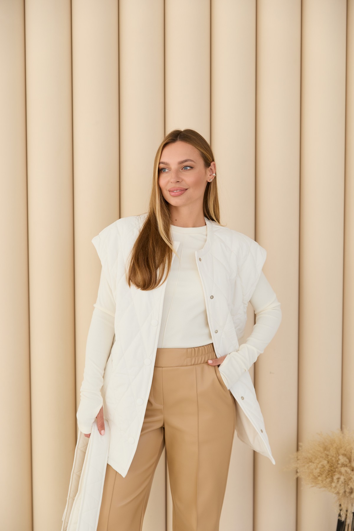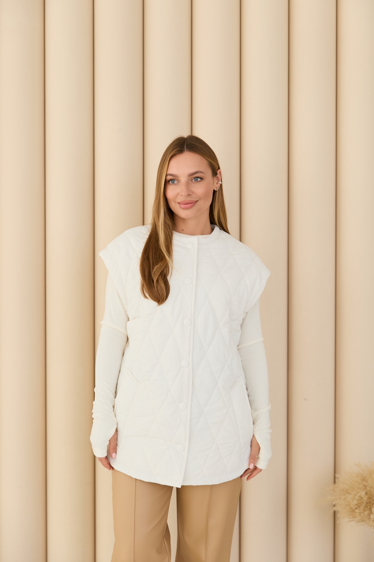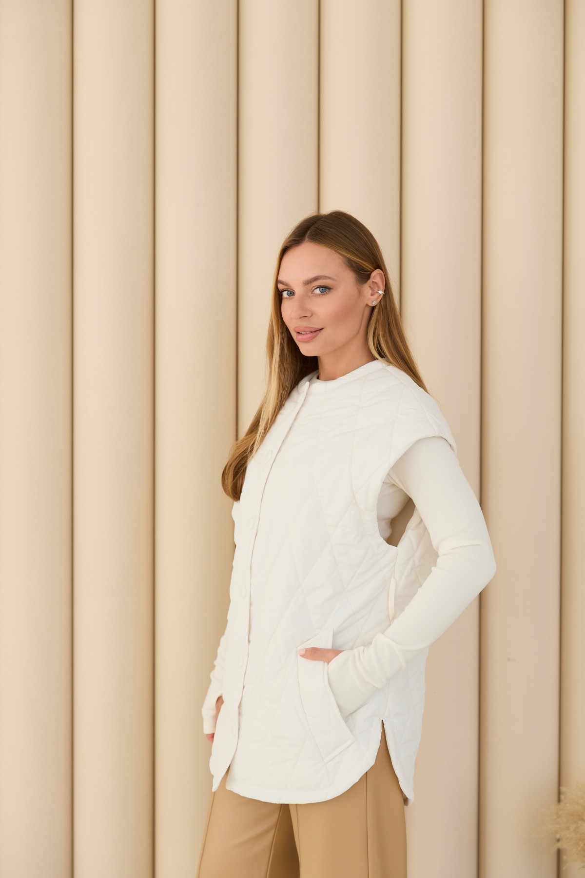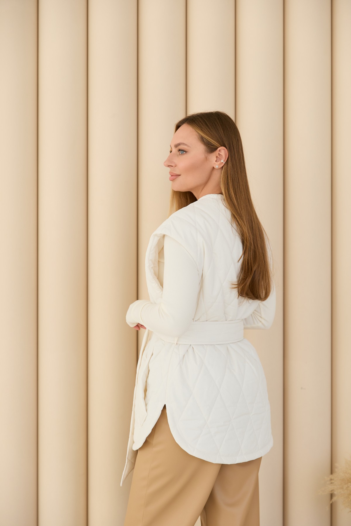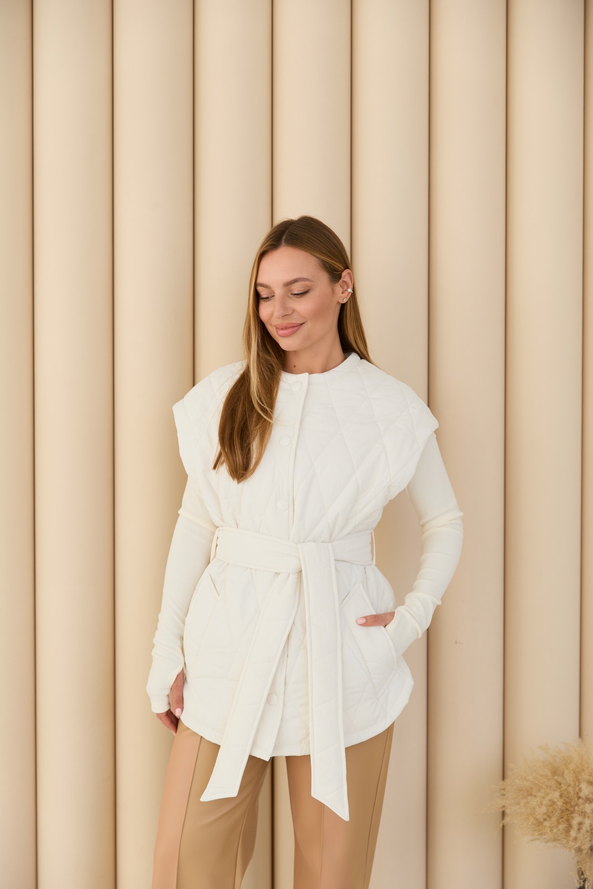 Стегана ромбами жилет виготовлений з якісної плащової тканини прямого силуету в стилі "oversize", довжиною нижче стегна. Жилетка однобортна та застібається на обтяжні кнопки з основної тканини. Низ виробу фігурний, із розрізами з боків, імітація сорочки. У цій моделі горловина "Шанель", без коміра. По горловині та фігурному низу широкий оздоблювальний рядок. На поличці розташовані кишені - листочки з налаштованими кінцями. У стьобаному пальті присутні шльовки та знімний пояс, з основної тканини. Даний жилет підійде для прогулянок, роботи, відвідування різноманітних заходів. Універсальна річ для стильних міських образів модного сезону