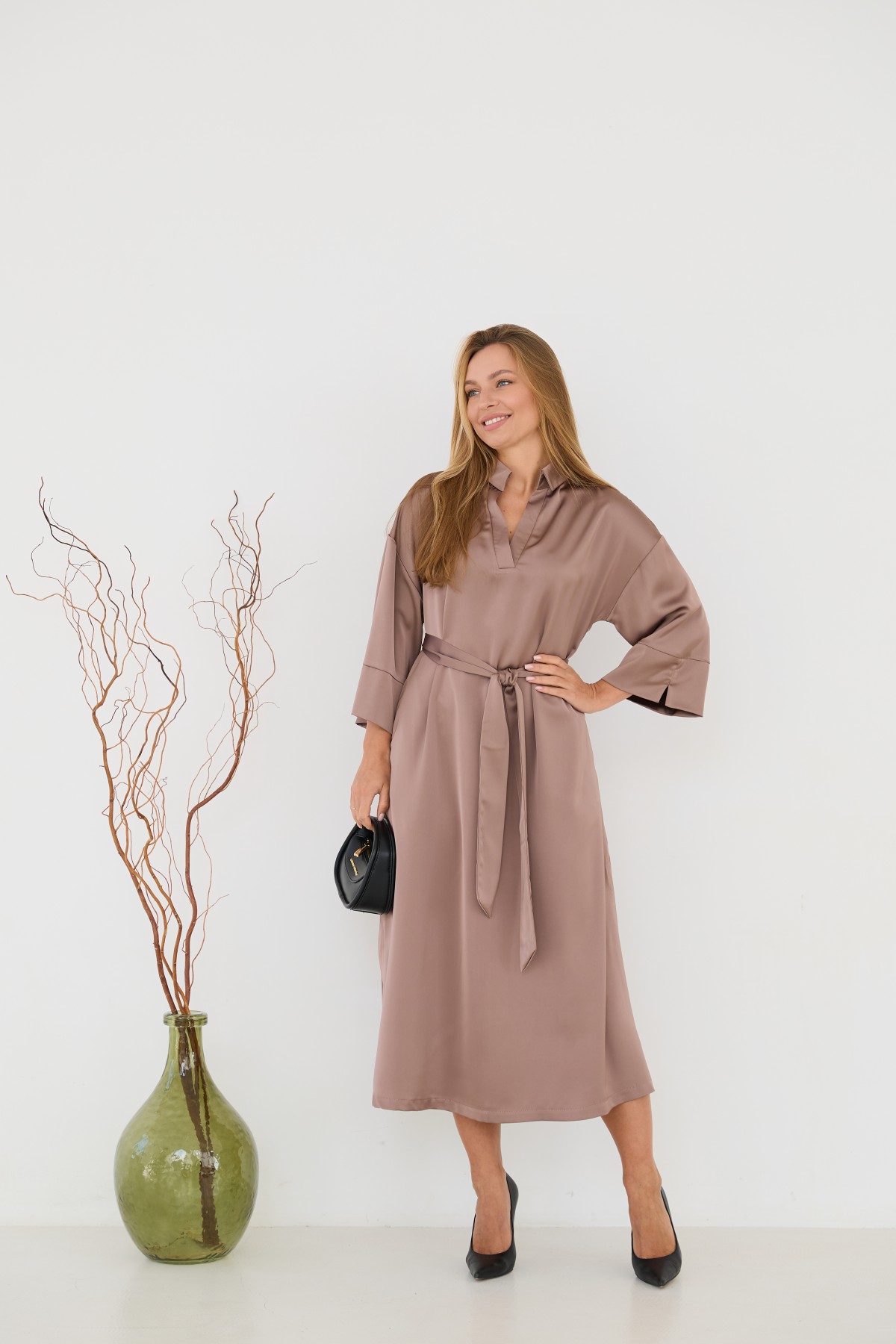 Сукня напівприлеглого силуету, з клешем по низу виробу та розрізами по бокових швах. Довжина сукні до середини литки. Відкладний комір на стійці, горловина з У-подібним вирізом, у стилі "поло". Кишені розташовані у бічному шві. Знімний пояс з основної тканини, фіксується по бічному шву шлевками. Актуальне цього сезону універсальне відмінно підійде як повсякденний одяг, і як варіант для особливих випадків.