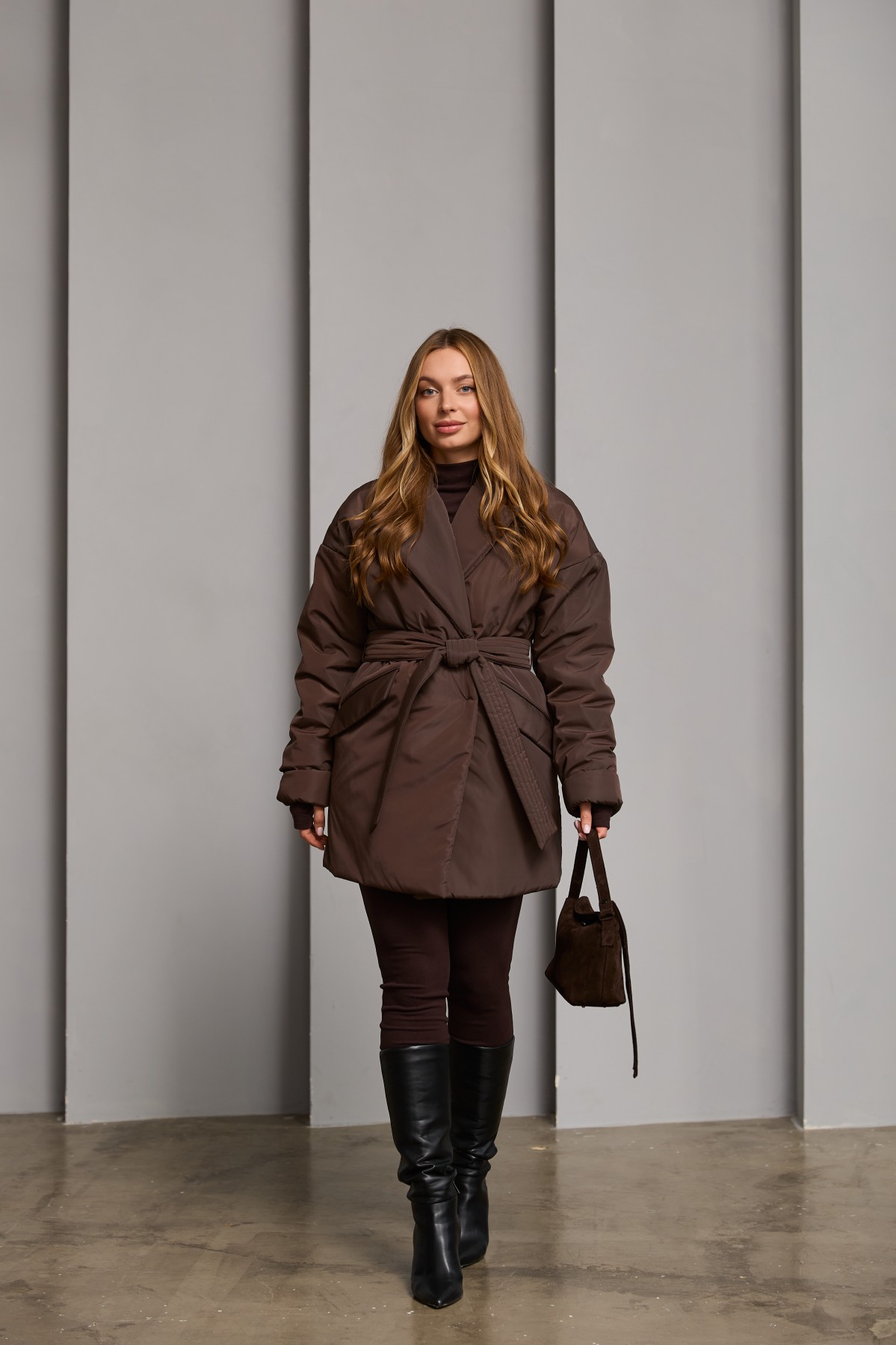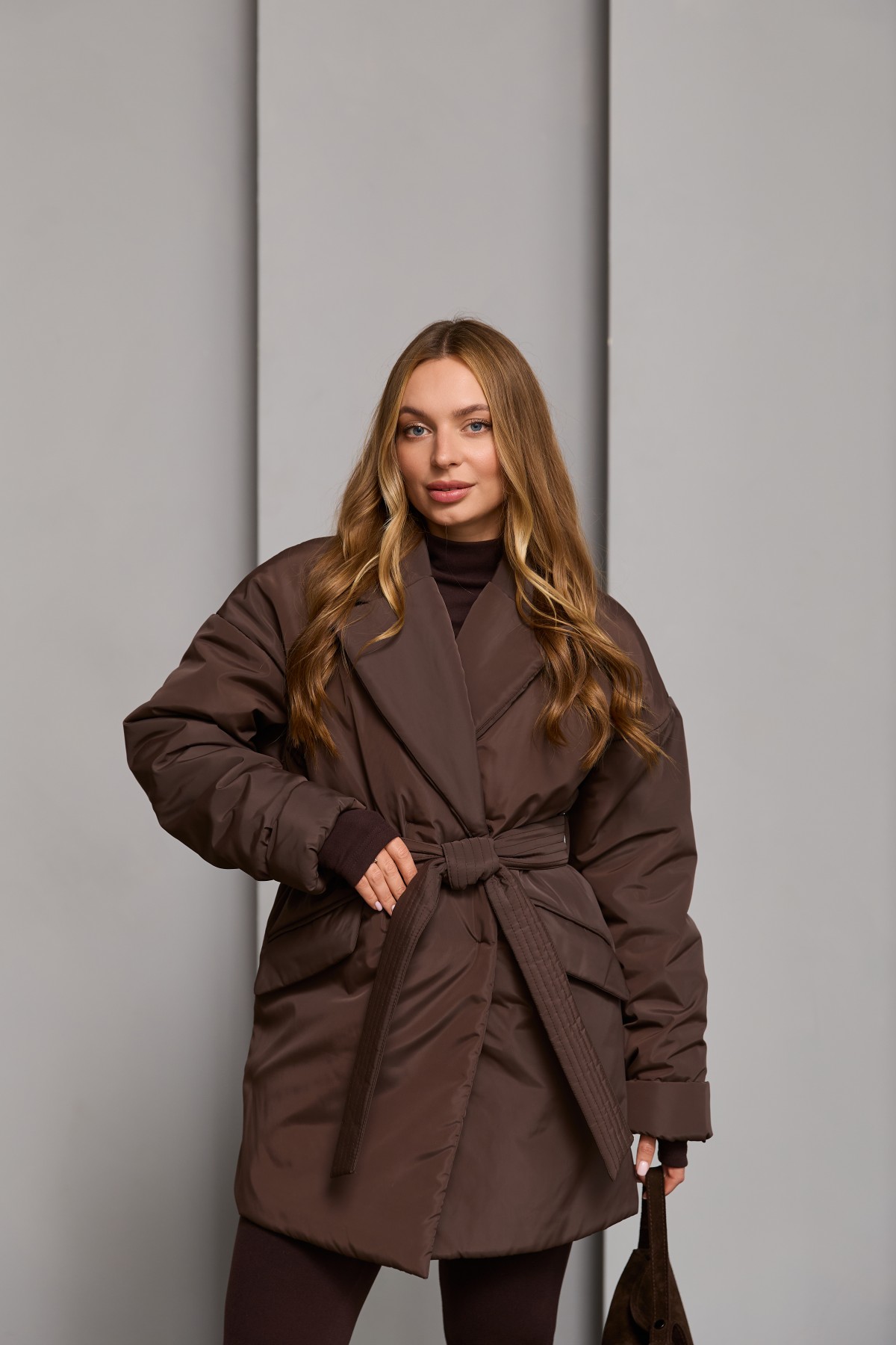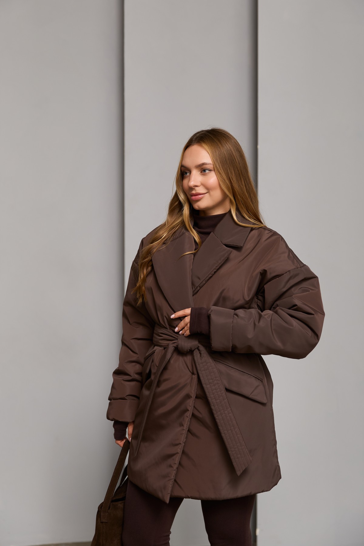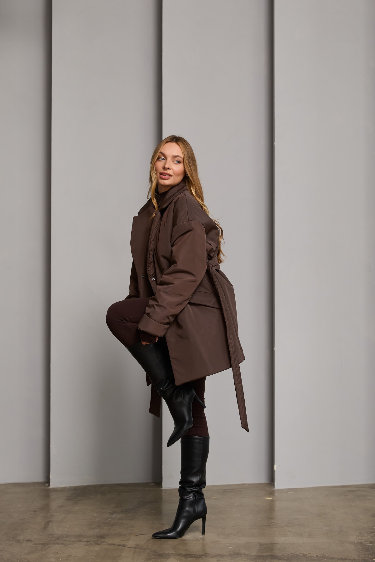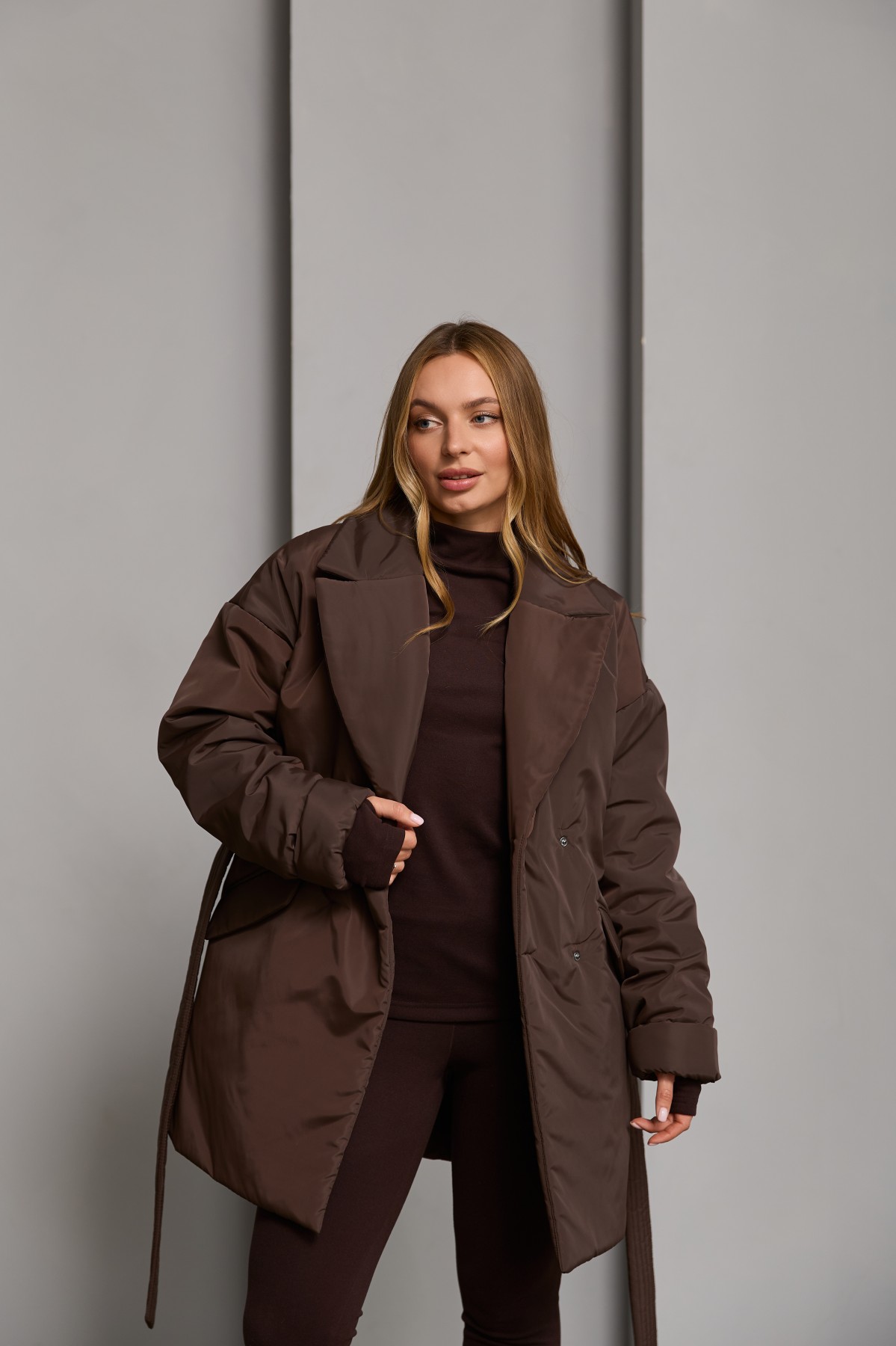 Стильна куртка вільного крою "oversaze" зі спущеною лінією рукава, виготовлена з якісної плащової тканини, довжиною до лінії стегон. Довжина пальто нижче лінії стегна. Двобортна застібка на магнітні пришивні кнопки. Англійський комір з лацканами та відкладним коміром. У цій моделі спущене плече, рукави одношовні. Низ рукавів можна відвертати.