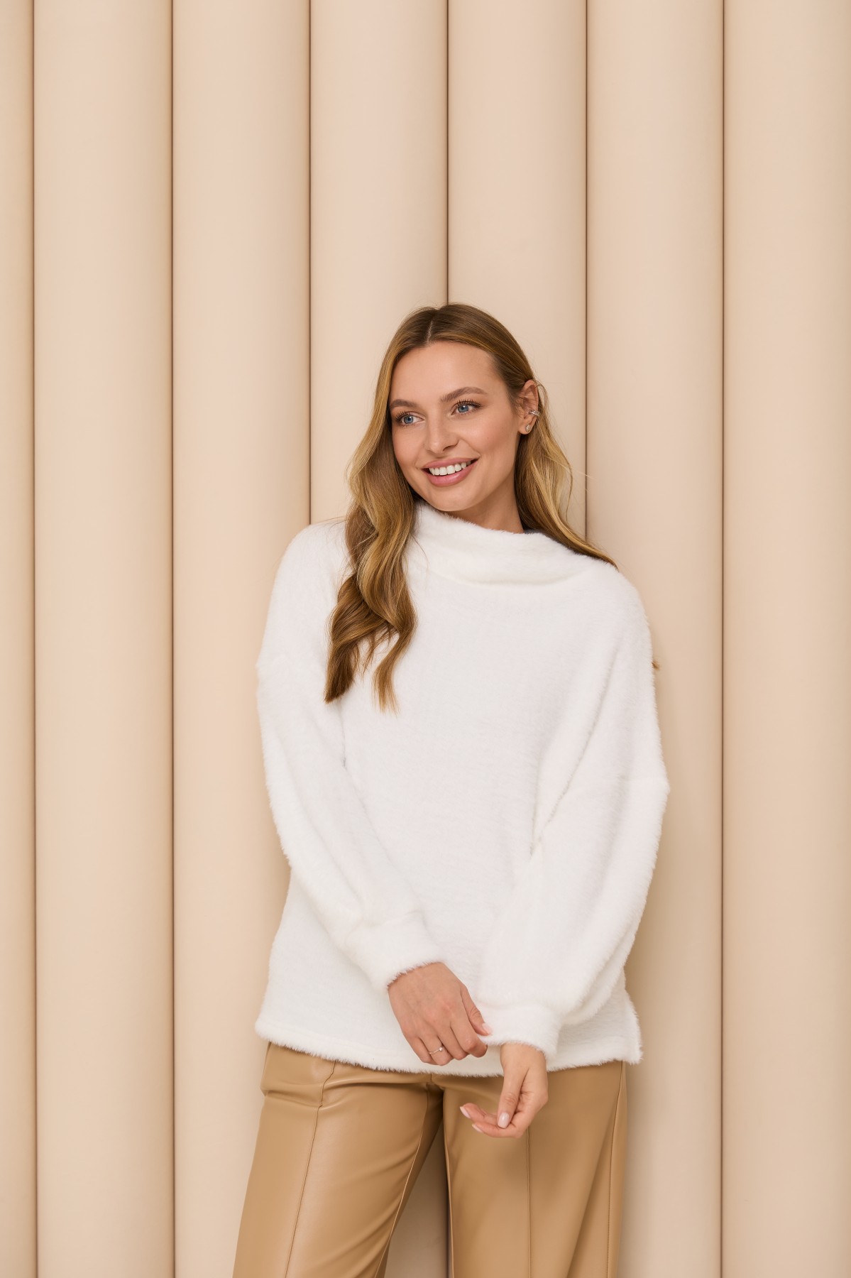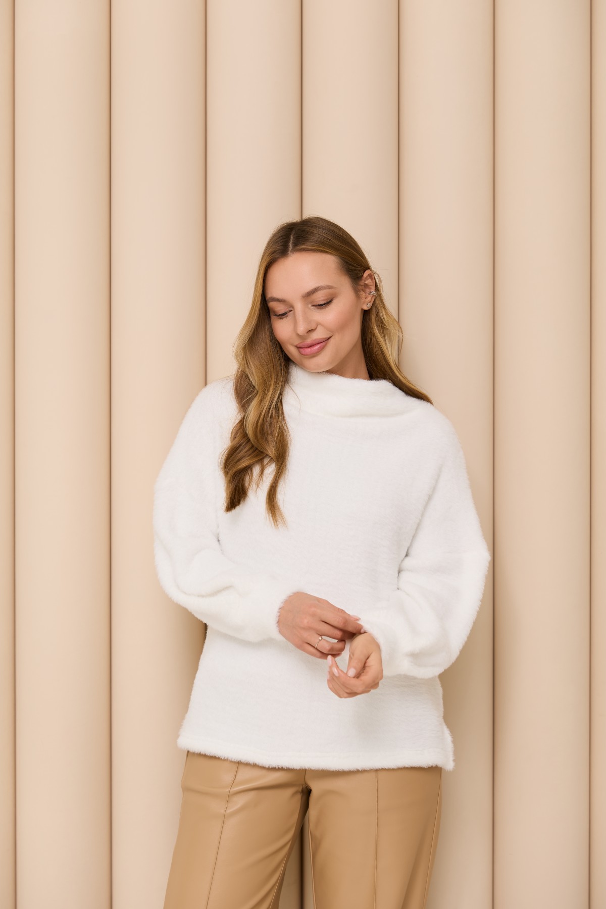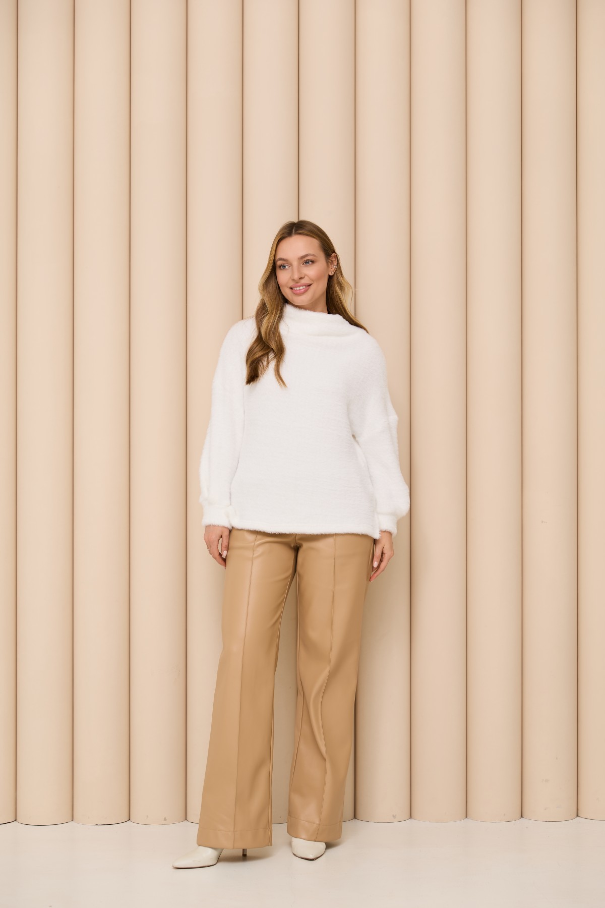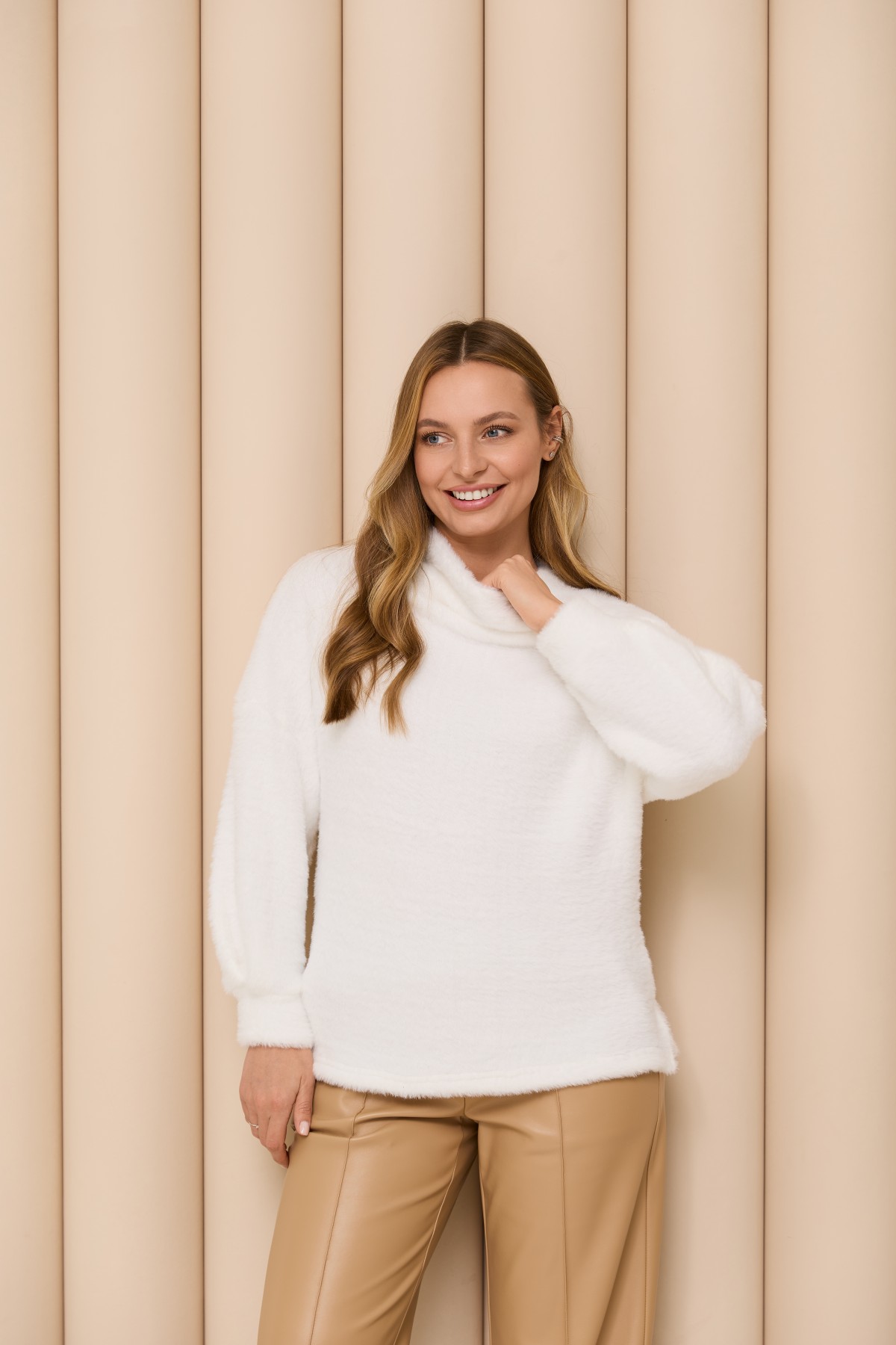 Трикотажна м;яка повітряна кофта вільного сілуету з цільною стійкою під горло, з довгим широким рукавом призібраним на манжет, по боках блузи є розрізи, довжина блузи до бедра. Елегантна повітряна кофта з мякого трикотажу класичного стилю.