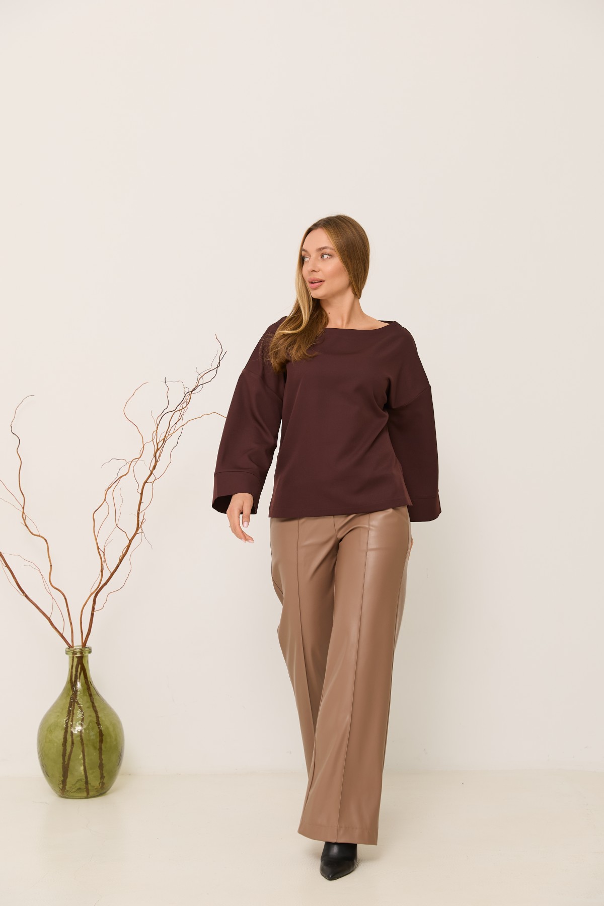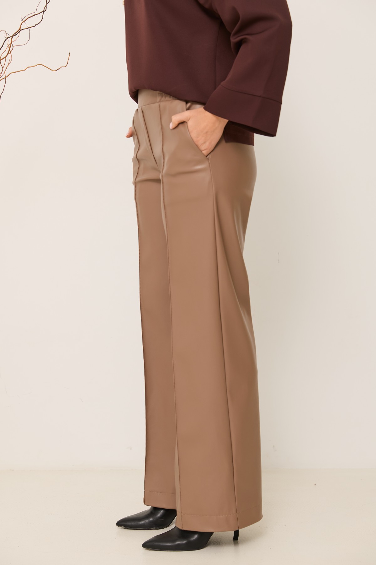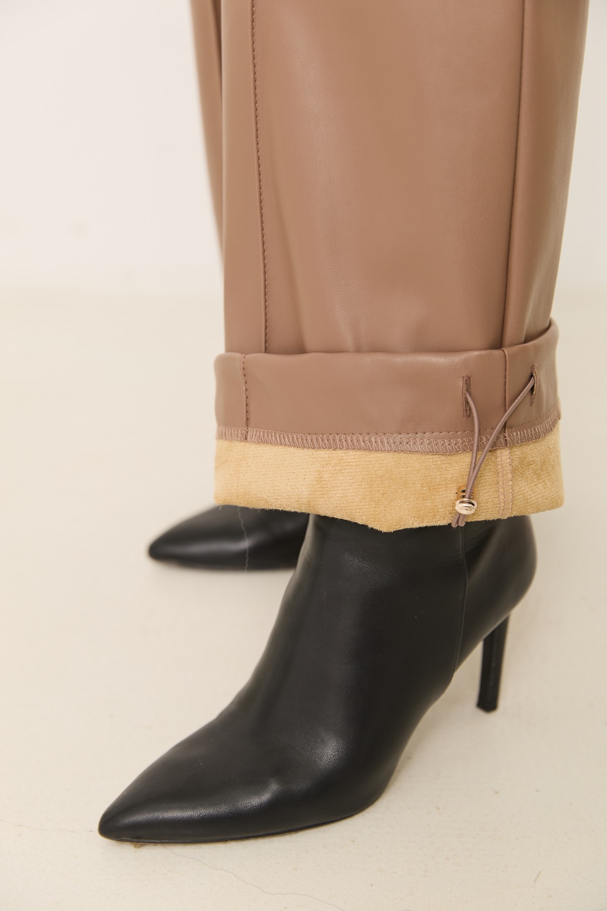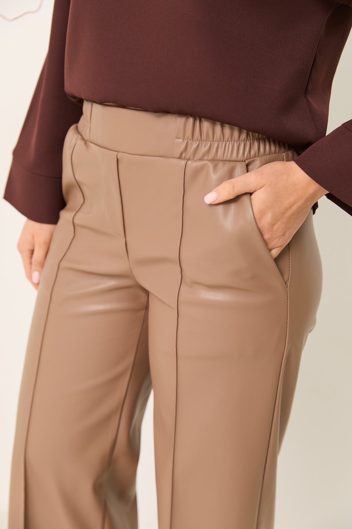Свободные брюк в стиле "палаццо". Также по низу брюк имеються продетые в петельки завязки для фиксации ширины по низу, для удобства носки брюк в дождливую погоду, либо для изменения формы и стиля брюк. На брюках имеються карманы в боковых швах. В пояс брюк вшита эластичная резинка . Теплые практичные брюки из еко кожи на замше. Данные брюки отлично подойдут как повседневная одежда, его можно одеть на прогулку. Незаменимая вещь в поездках и путешествиях.