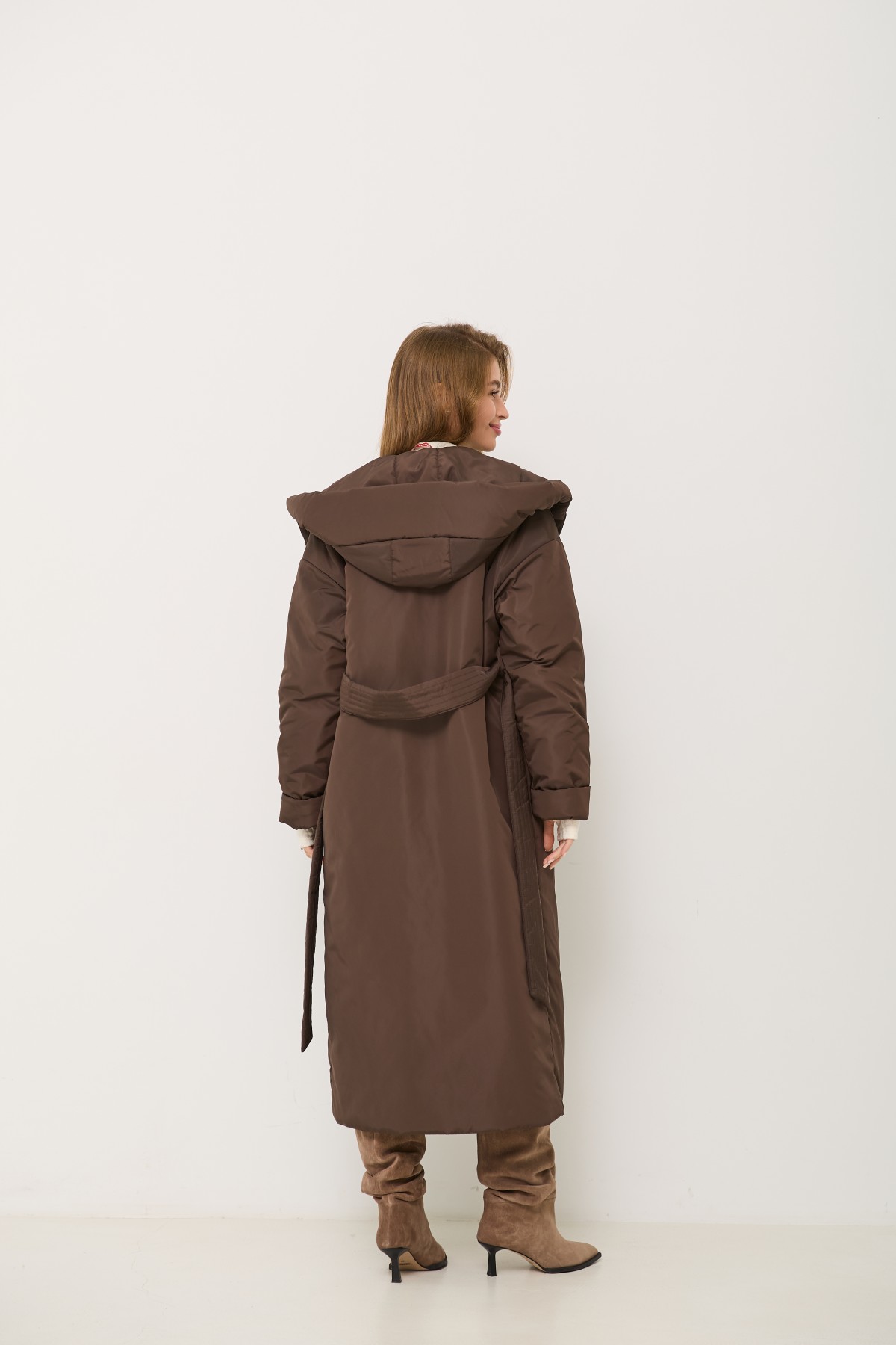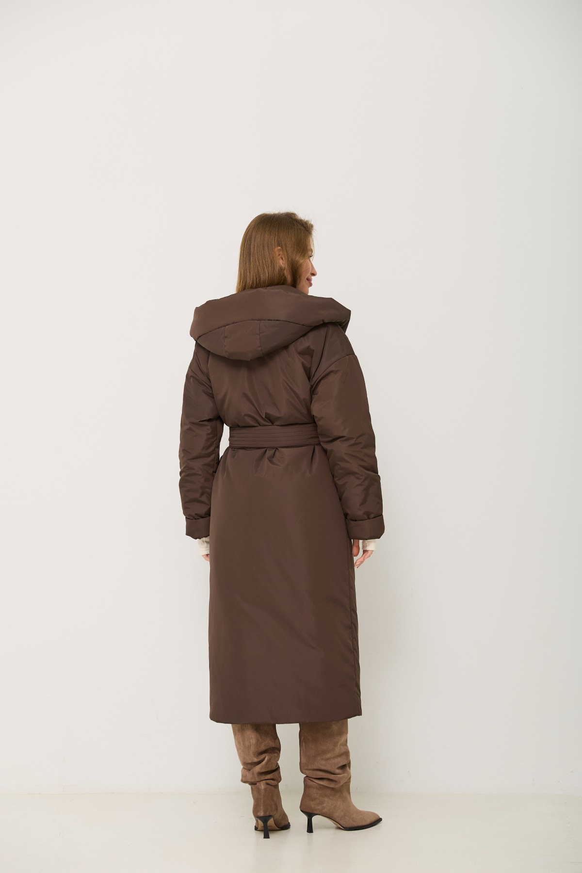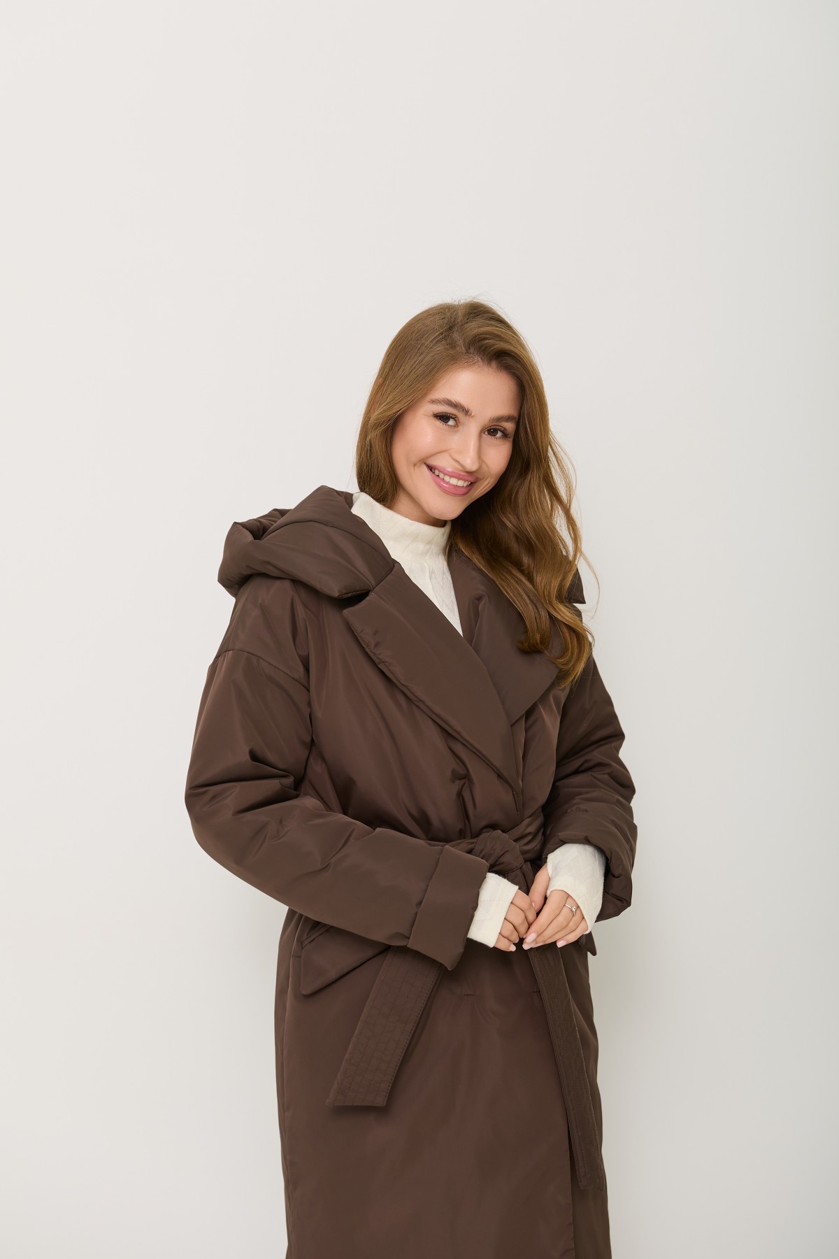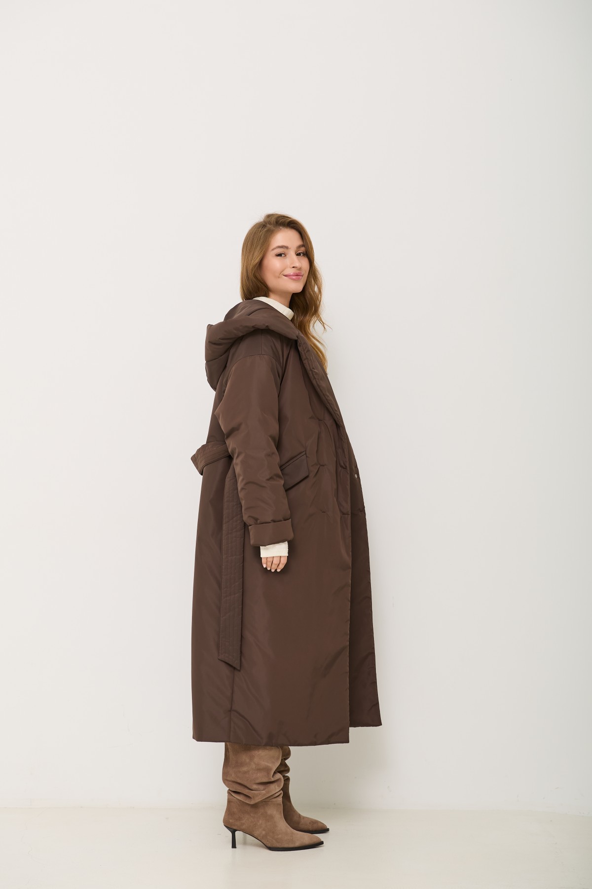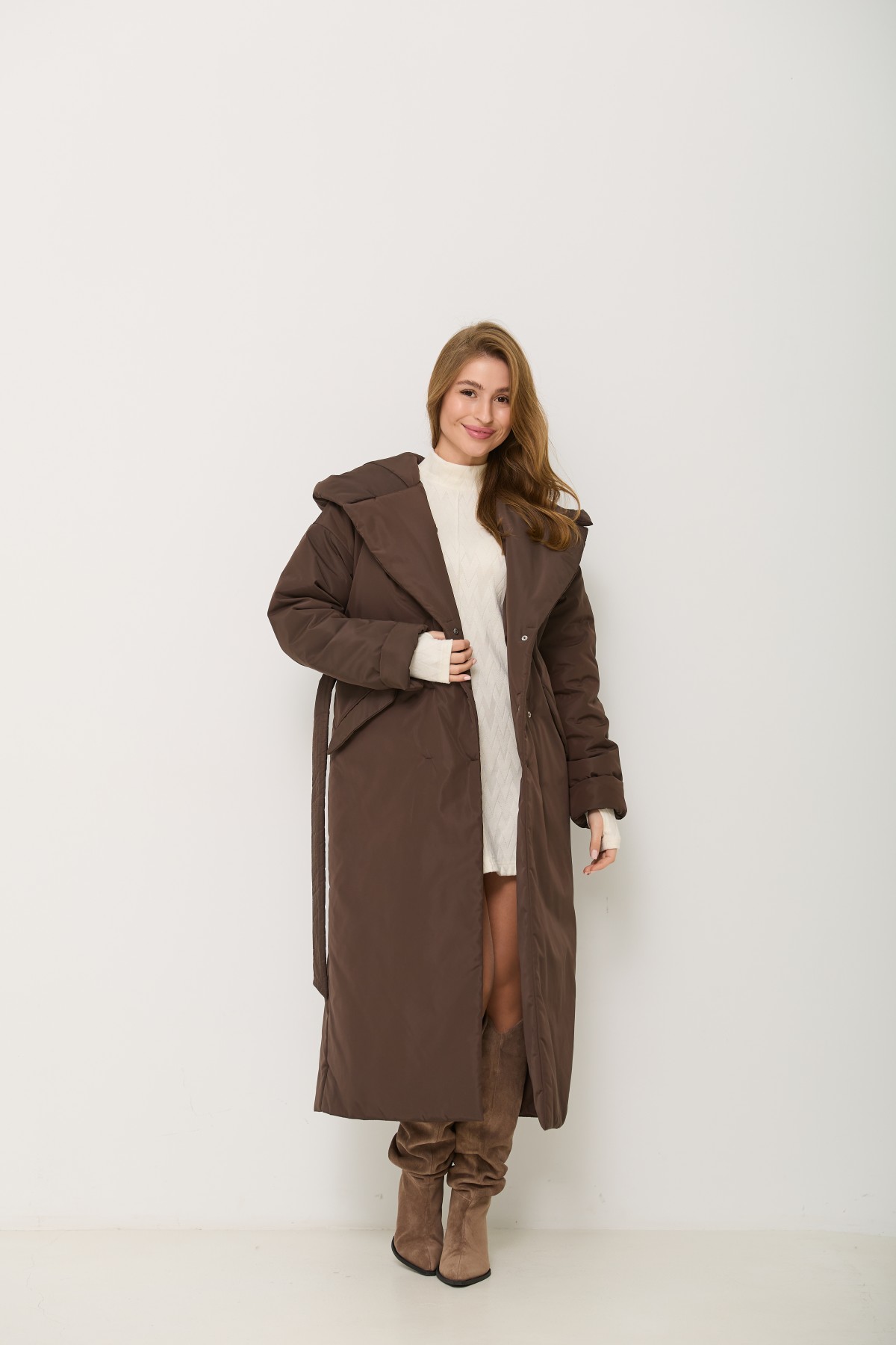 Стильна утеплена куртка вільного крою з капюшоном, зі спущеною лінією рукава, довжина куртки максі до щиколотки, виготовлена з якісної плащової тканини. Двобортна застібка на кнопках. Англійський комір з лацканами та капюшоном. У цій моделі спущене плече, рукави одношовні. Низ рукавів можна відвертати регулюючи тим самим довжину рукава. По переду виробу розташовані похилі прорізні кишені в рамку з клапаном. Універсальна річ для стильних міських образів модного сезону .