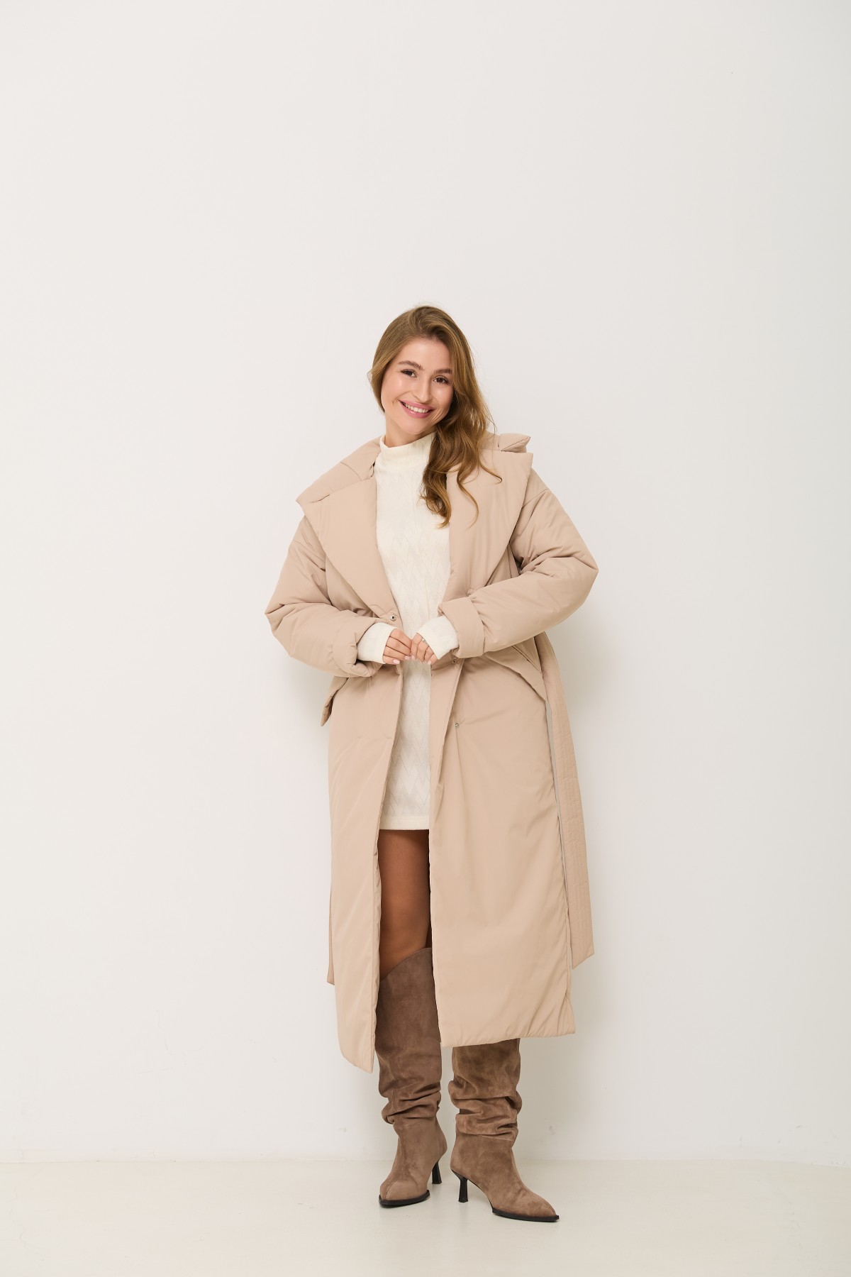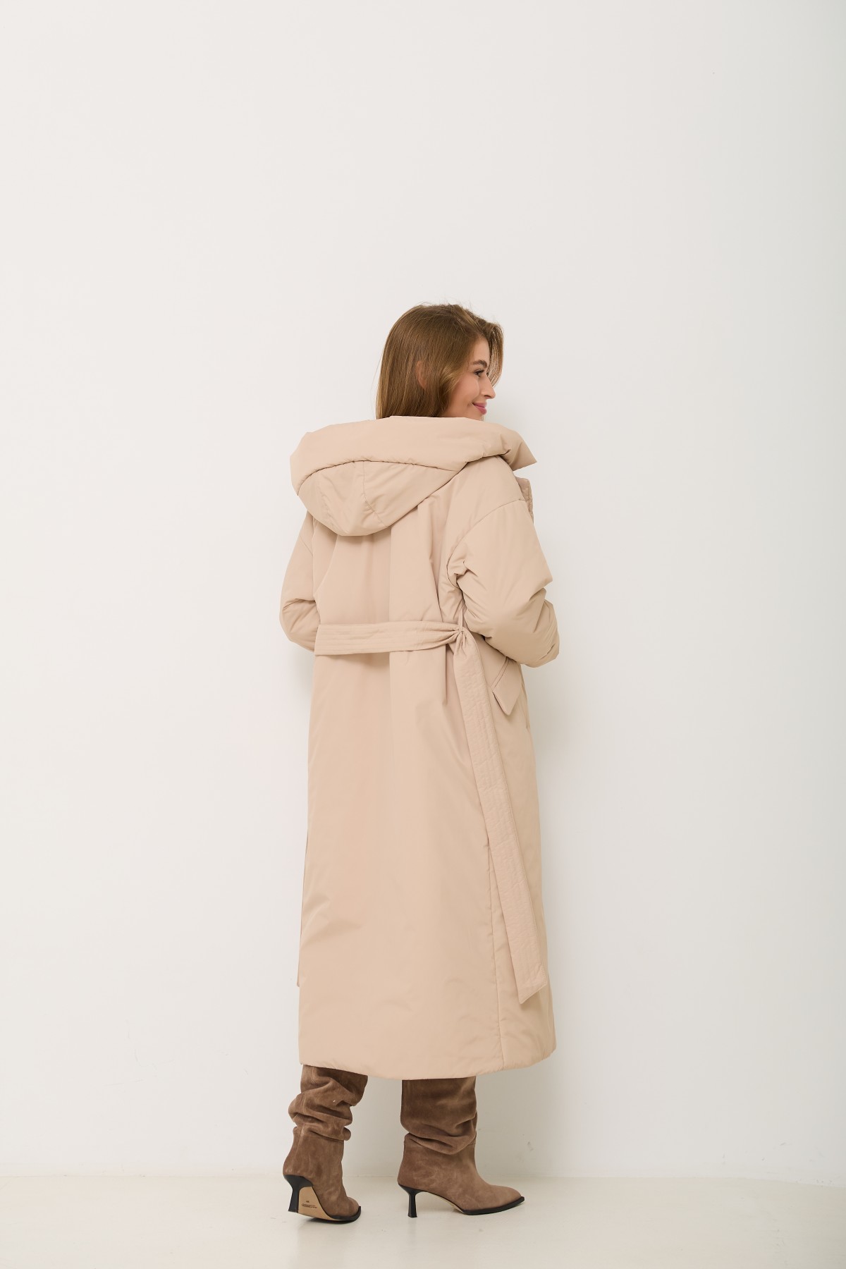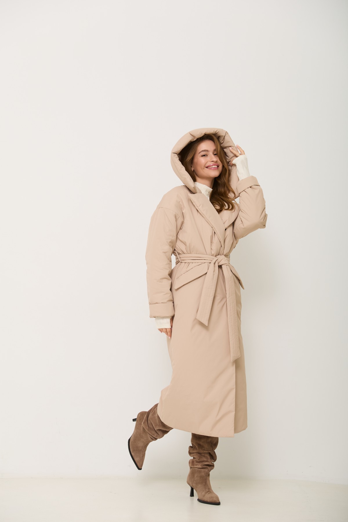 Стильна утеплена куртка вільного крою з капюшоном, зі спущеною лінією рукава, довжина куртки максі до щиколотки, виготовлена з якісної плащової тканини. Двобортна застібка на кнопках. Англійський комір з лацканами та капюшоном. У цій моделі спущене плече, рукави одношовні. Низ рукавів можна відвертати регулюючи тим самим довжину рукава. По переду виробу розташовані похилі прорізні кишені в рамку з клапаном. Універсальна річ для стильних міських образів модного сезону .