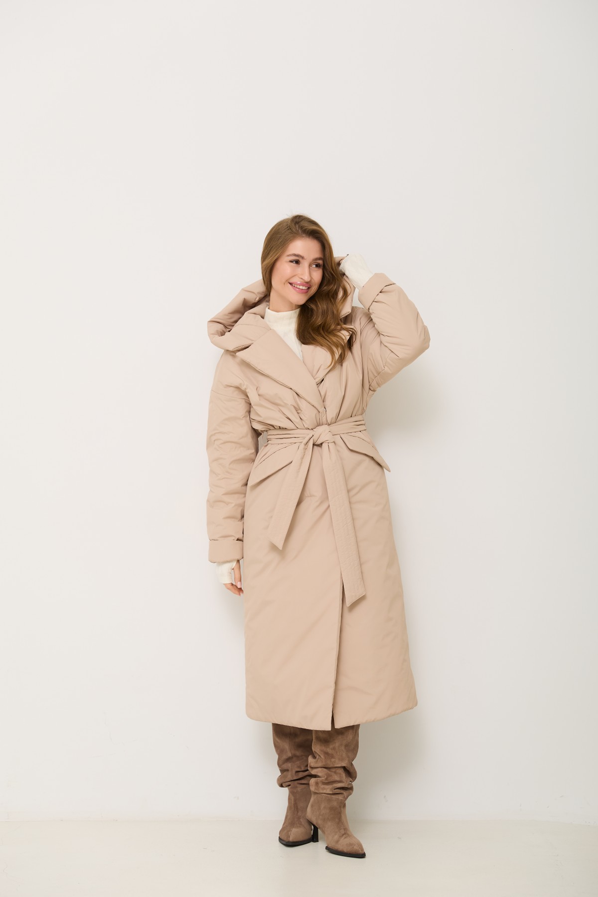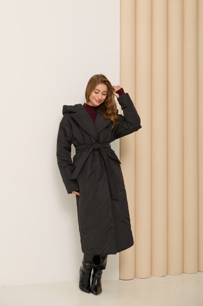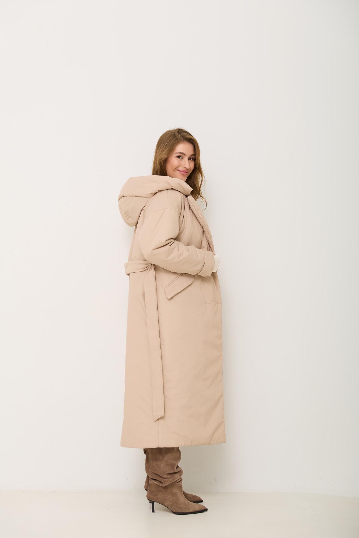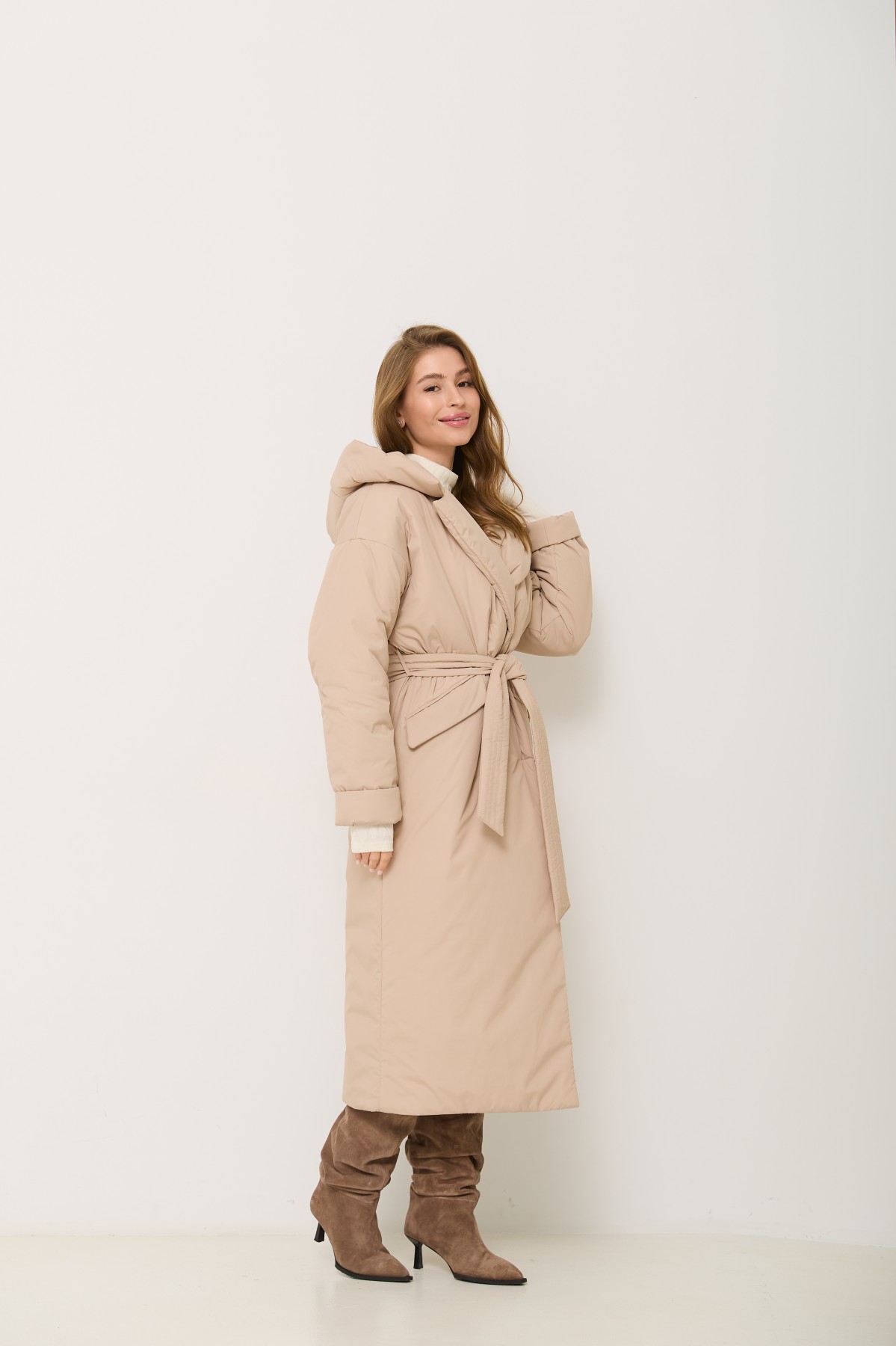 Стильна утеплена куртка вільного крою з капюшоном, зі спущеною лінією рукава, довжина куртки максі до щиколотки, виготовлена з якісної плащової тканини. Двобортна застібка на кнопках. Англійський комір з лацканами та капюшоном. У цій моделі спущене плече, рукави одношовні. Низ рукавів можна відвертати регулюючи тим самим довжину рукава. По переду виробу розташовані похилі прорізні кишені в рамку з клапаном. Універсальна річ для стильних міських образів модного сезону .