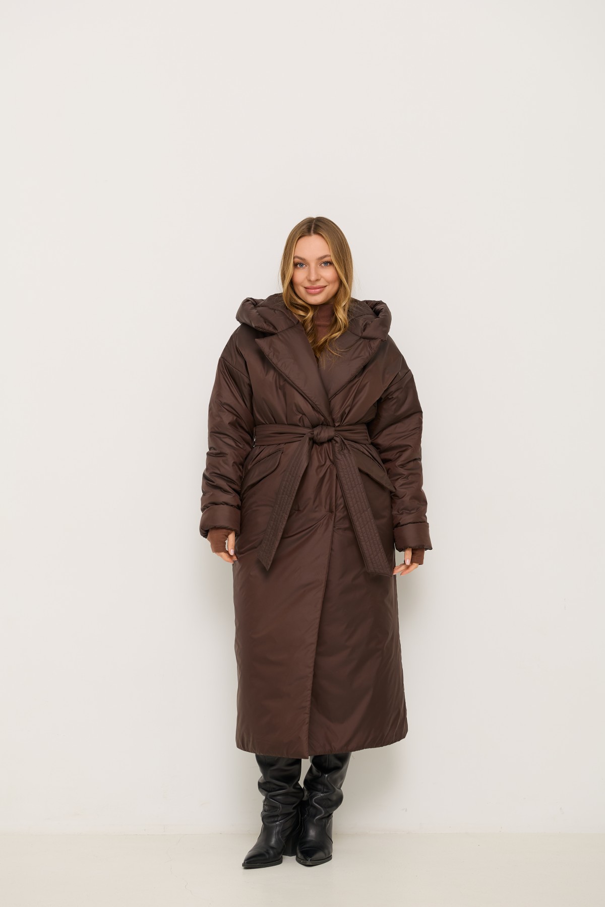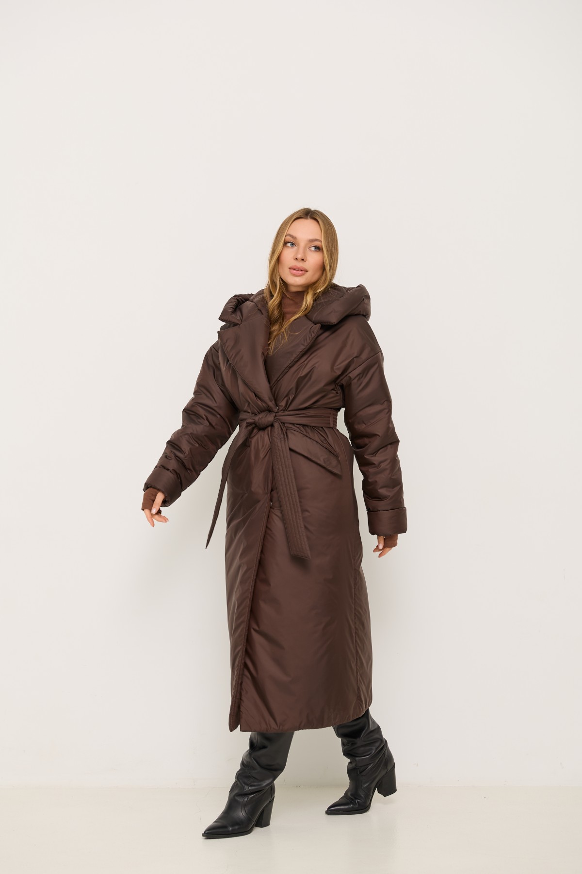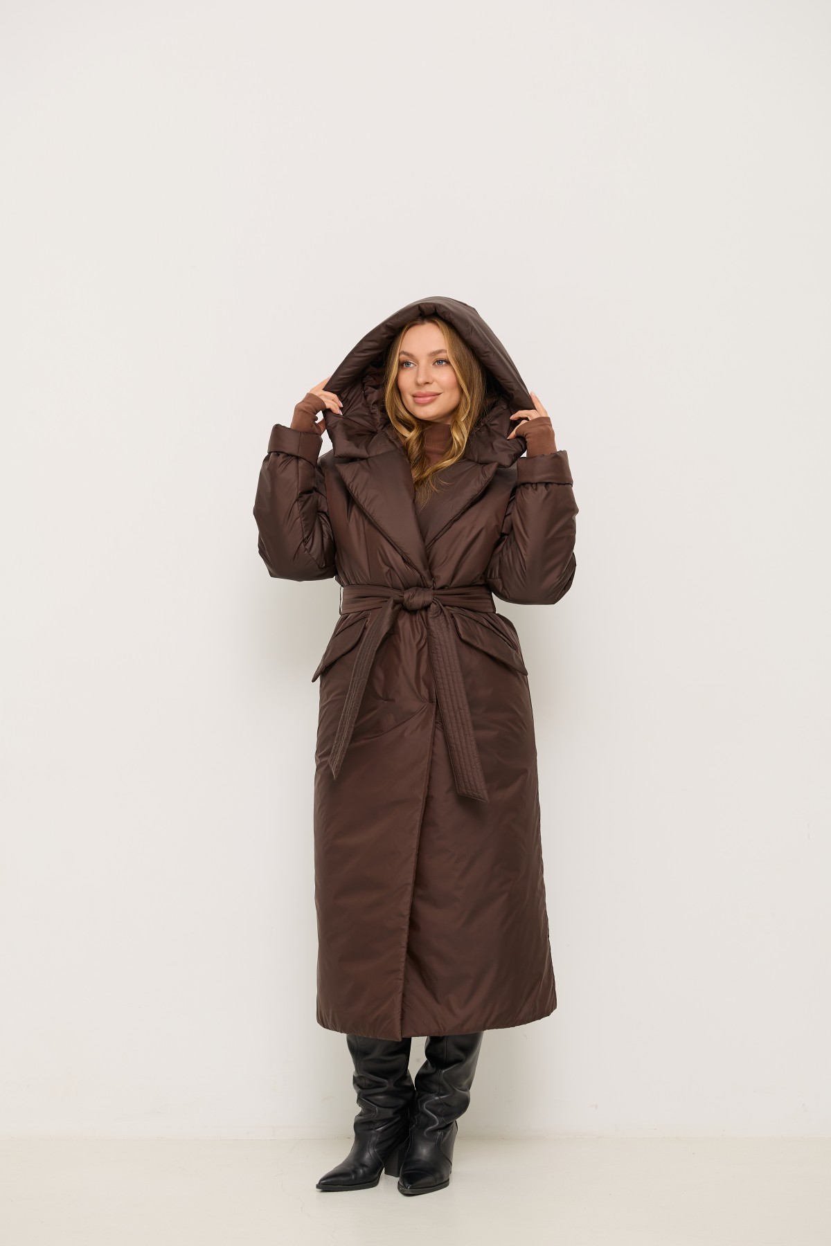 Стильна утеплена куртка вільного крою з капюшоном, зі спущеною лінією рукава, довжина куртки максі до щиколотки, виготовлена з якісної плащової тканини. Двобортна застібка на кнопках. Англійський комір з лацканами та капюшоном. У цій моделі спущене плече, рукави одношовні. Низ рукавів можна відвертати регулюючи тим самим довжину рукава. По переду виробу розташовані похилі прорізні кишені в рамку з клапаном. Універсальна річ для стильних міських образів модного сезону .