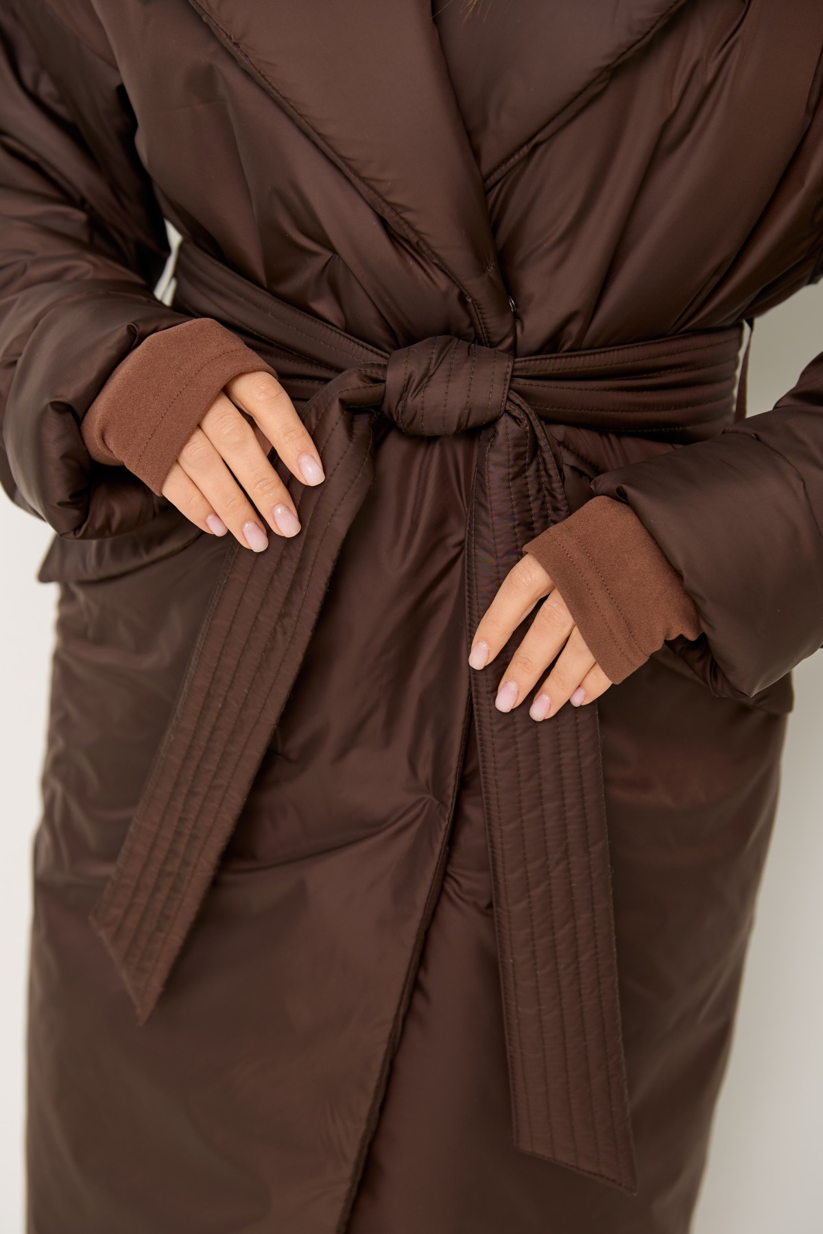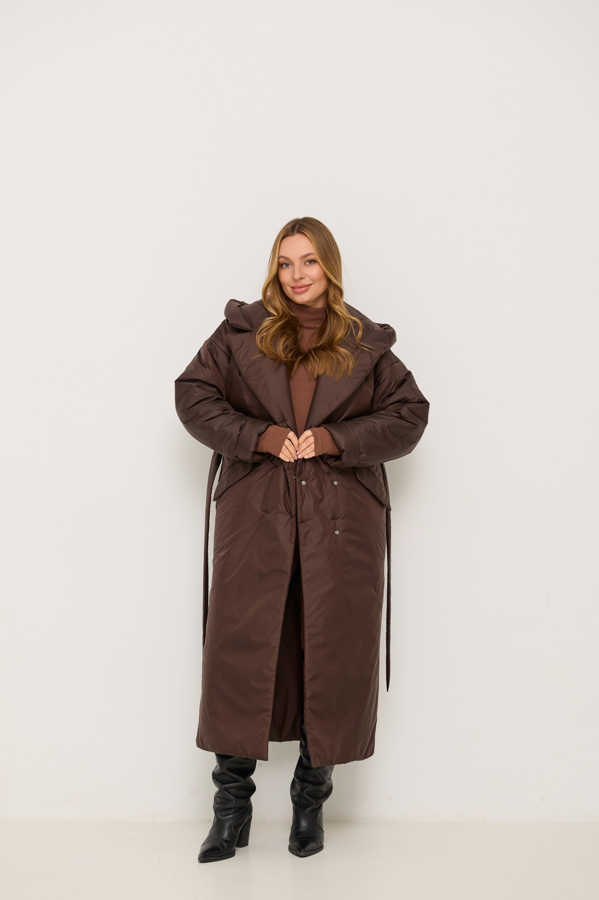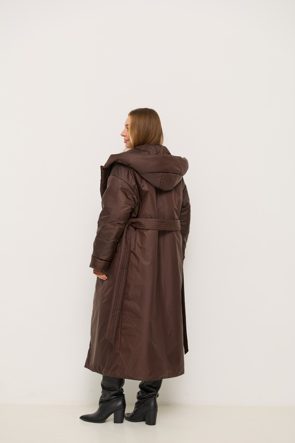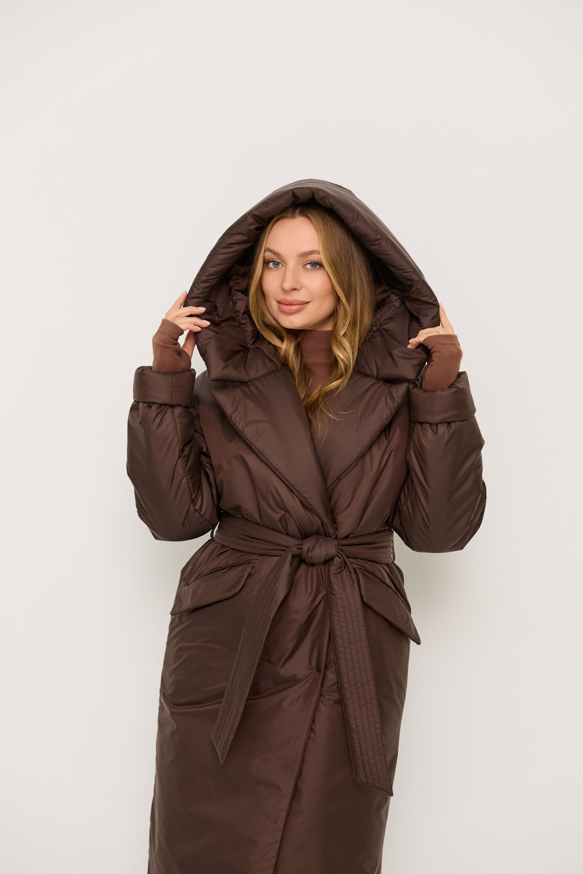 Стильна утеплена куртка вільного крою з капюшоном, зі спущеною лінією рукава, довжина куртки максі до щиколотки, виготовлена з якісної плащової тканини. Двобортна застібка на кнопках. Англійський комір з лацканами та капюшоном. У цій моделі спущене плече, рукави одношовні. Низ рукавів можна відвертати регулюючи тим самим довжину рукава. По переду виробу розташовані похилі прорізні кишені в рамку з клапаном. Універсальна річ для стильних міських образів модного сезону .