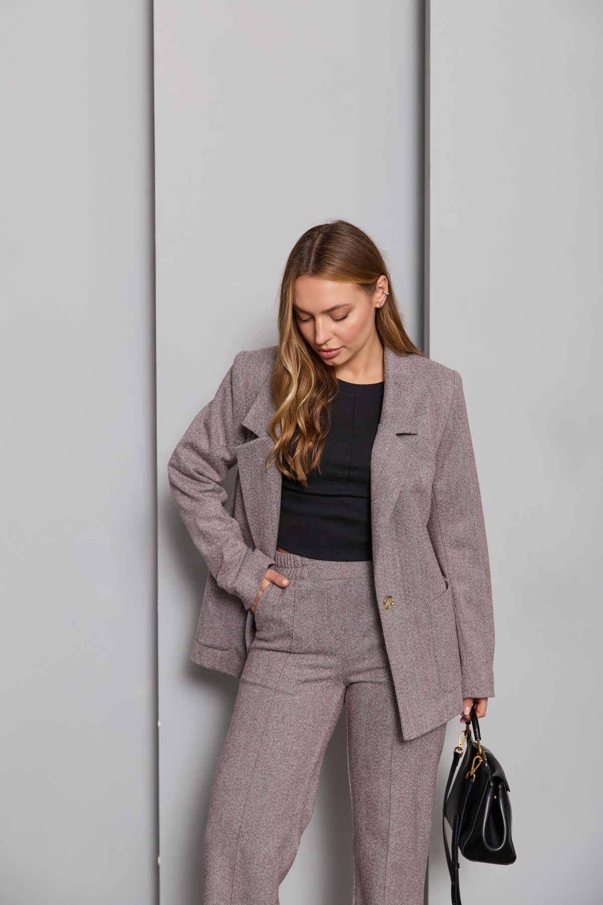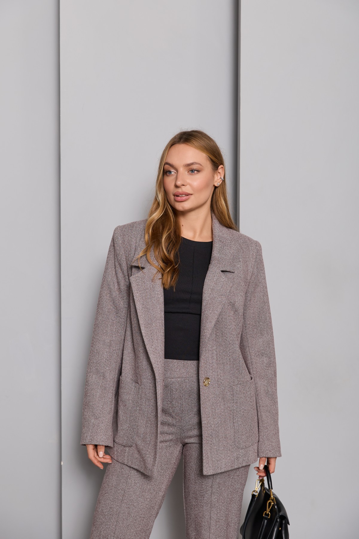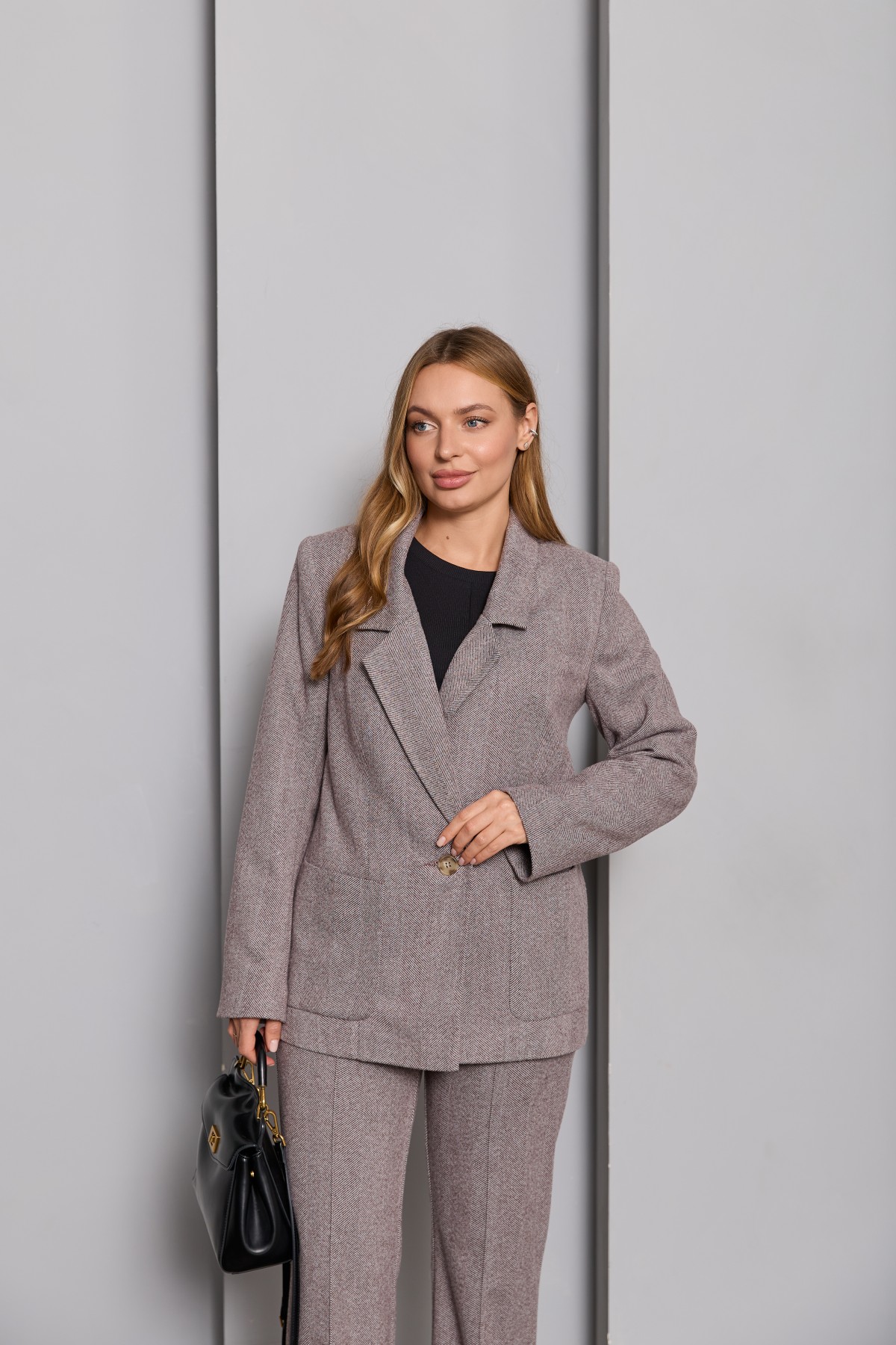 Жіночий стильний молодіжний костюм складається з жакета та штанів, виконаний у класичному міському стилі, вільного силуету жакет та прямих штанів.Трикотажний жакет довжиною нижче лінії стегон з накладними кишенями прямокутної форми - дуже практичний та зручний Застібка жакета на петлю та гудзик.Класичний англійський комір з лацканом. Рукав двосторонній. Кишені на штанах відрізним бочком, дуже зручно розташовані та місткі Пояс штанів на еластичній резинці. Зручний та практичний костюм відмінно підійде для повсякденного носіння, для прогулянки або роботи. Він стане одним із найпрактичніших і зручніших.