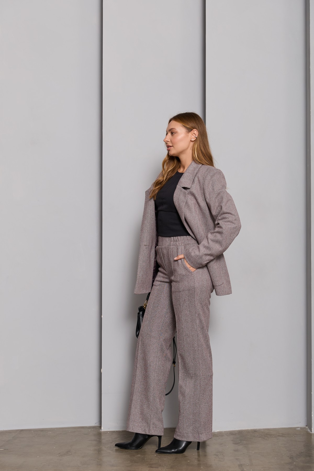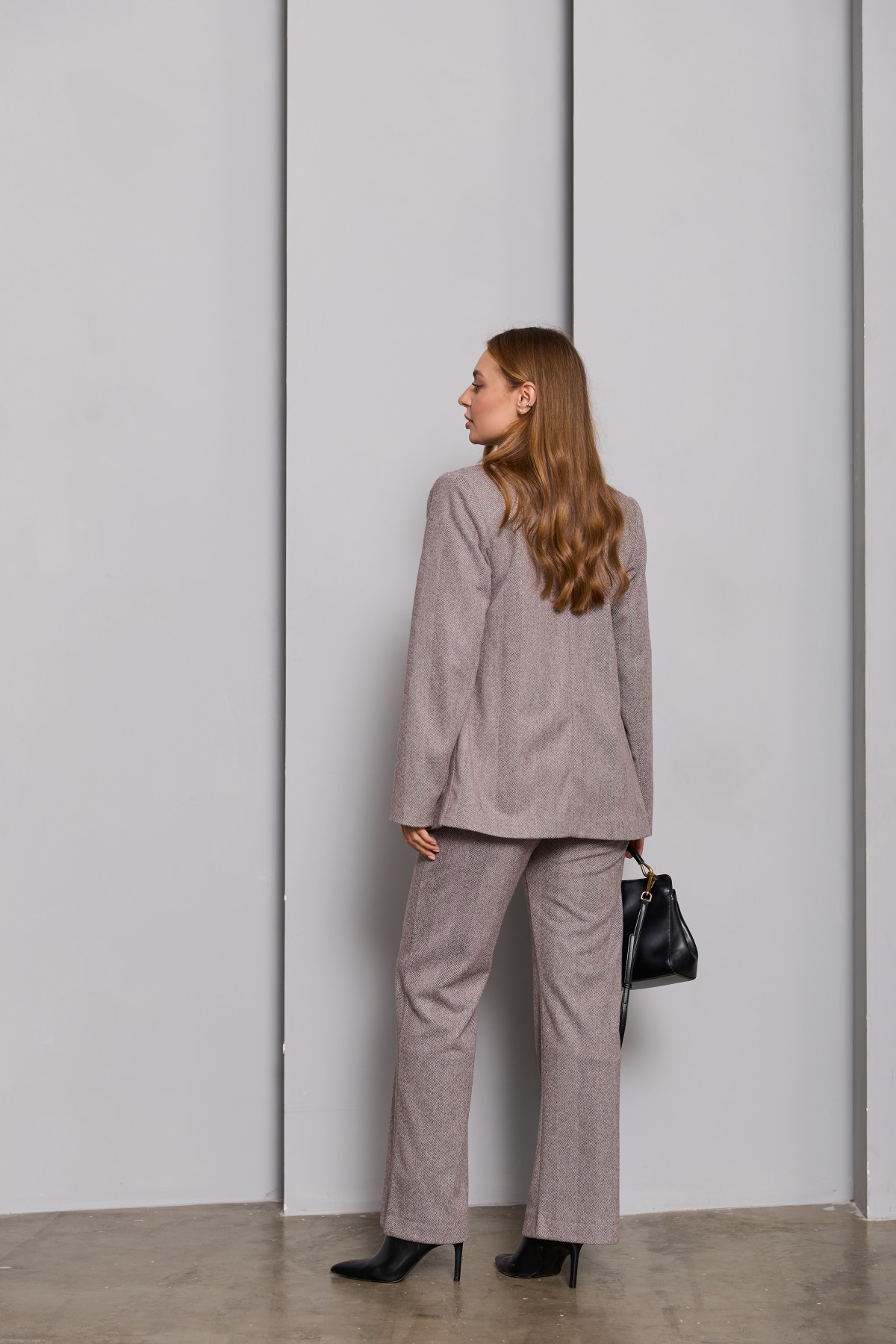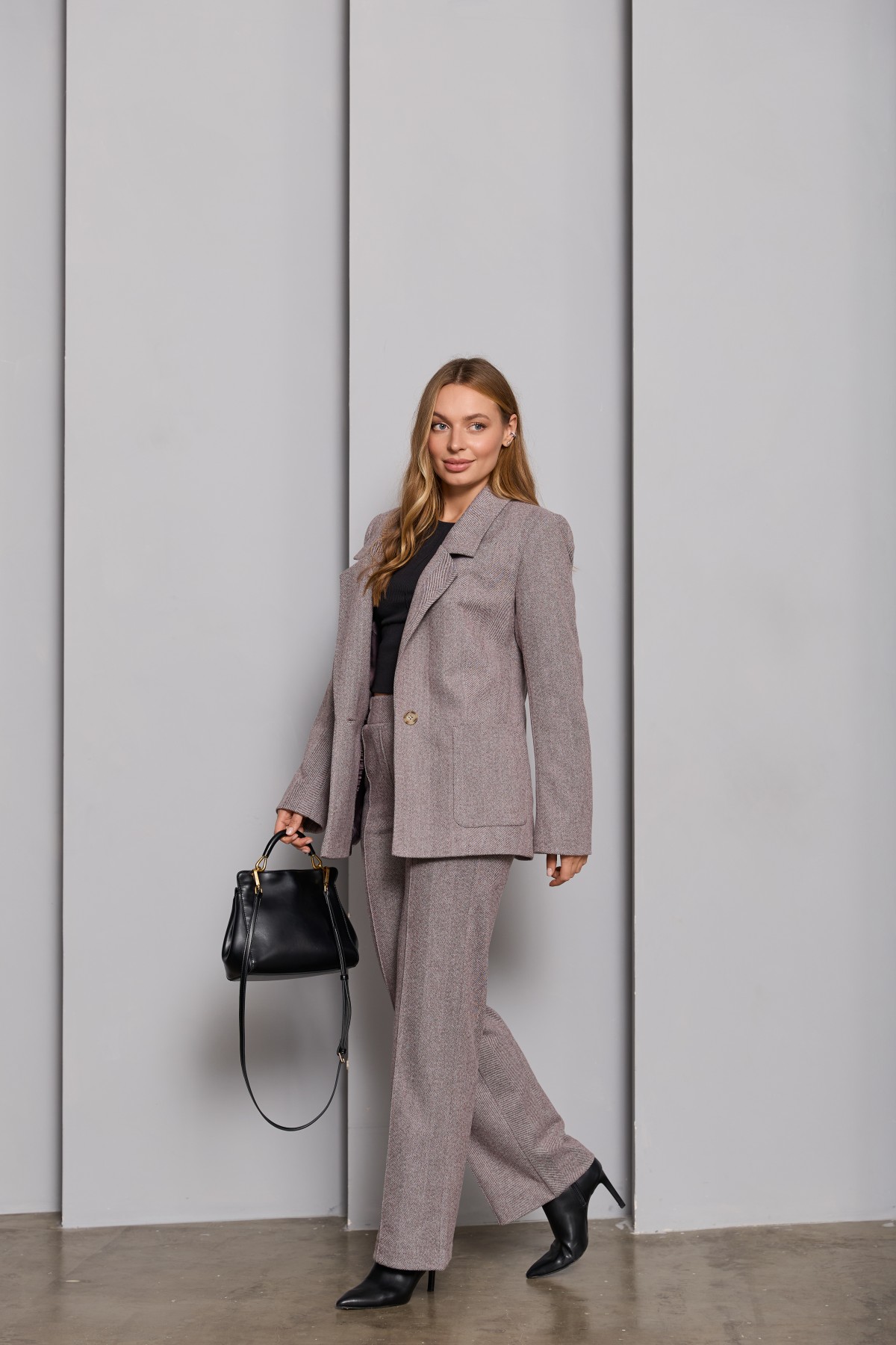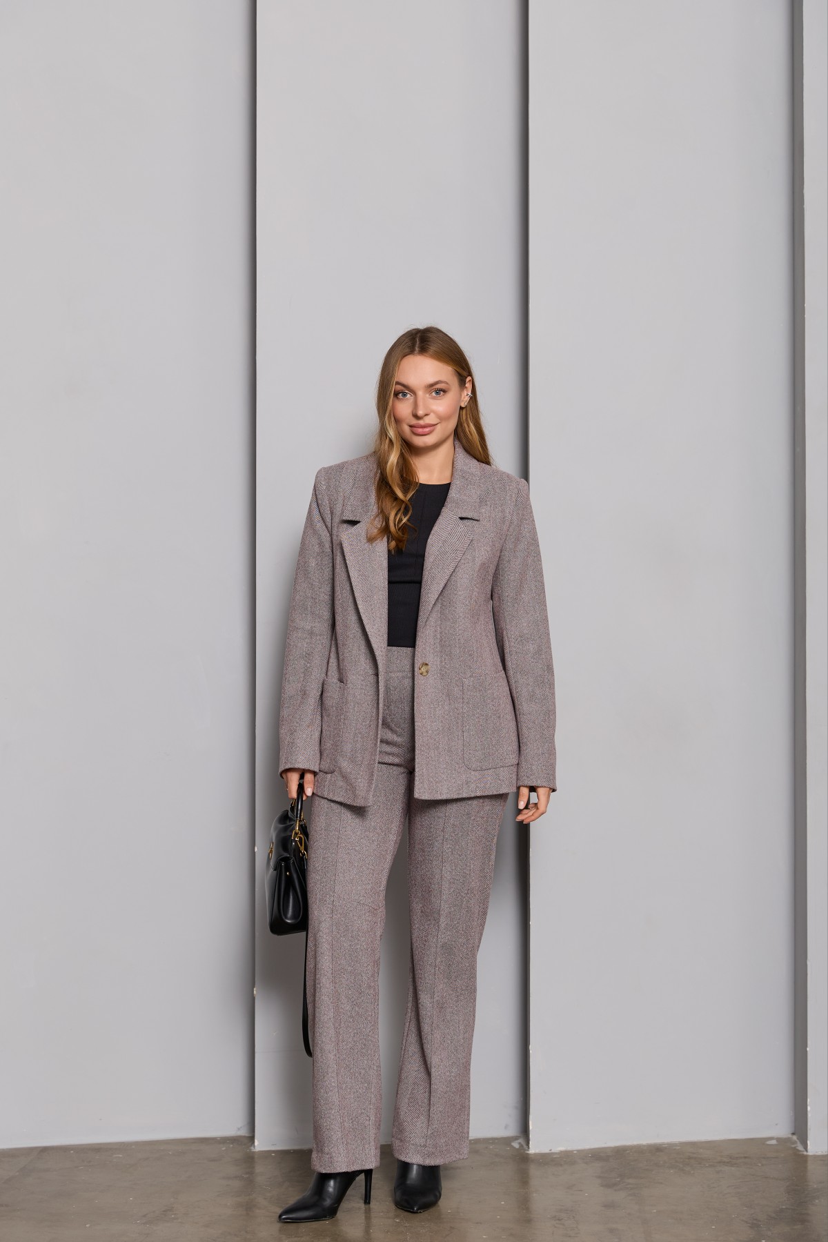 Жіночий стильний молодіжний костюм складається з жакета та штанів, виконаний у класичному міському стилі, вільного силуету жакет та прямих штанів.Трикотажний жакет довжиною нижче лінії стегон з накладними кишенями прямокутної форми - дуже практичний та зручний Застібка жакета на петлю та гудзик.Класичний англійський комір з лацканом. Рукав двосторонній. Кишені на штанах відрізним бочком, дуже зручно розташовані та місткі Пояс штанів на еластичній резинці. Зручний та практичний костюм відмінно підійде для повсякденного носіння, для прогулянки або роботи. Він стане одним із найпрактичніших і зручніших.