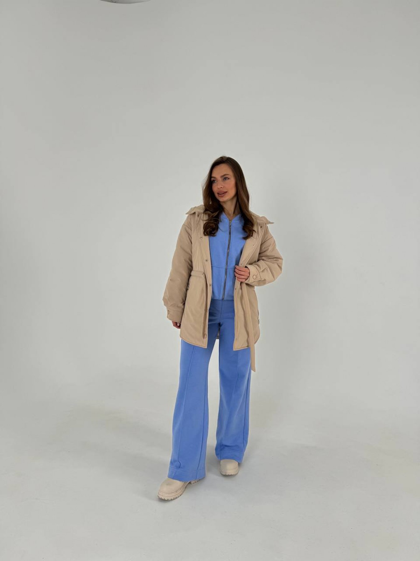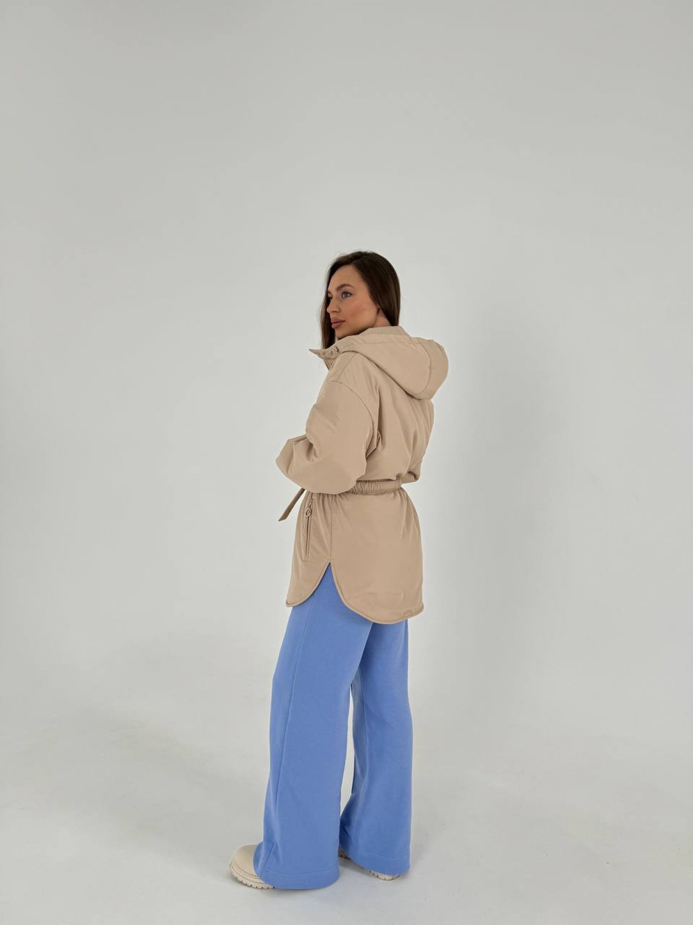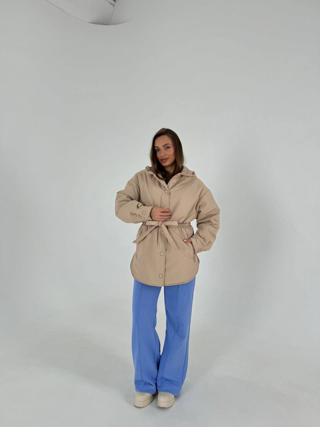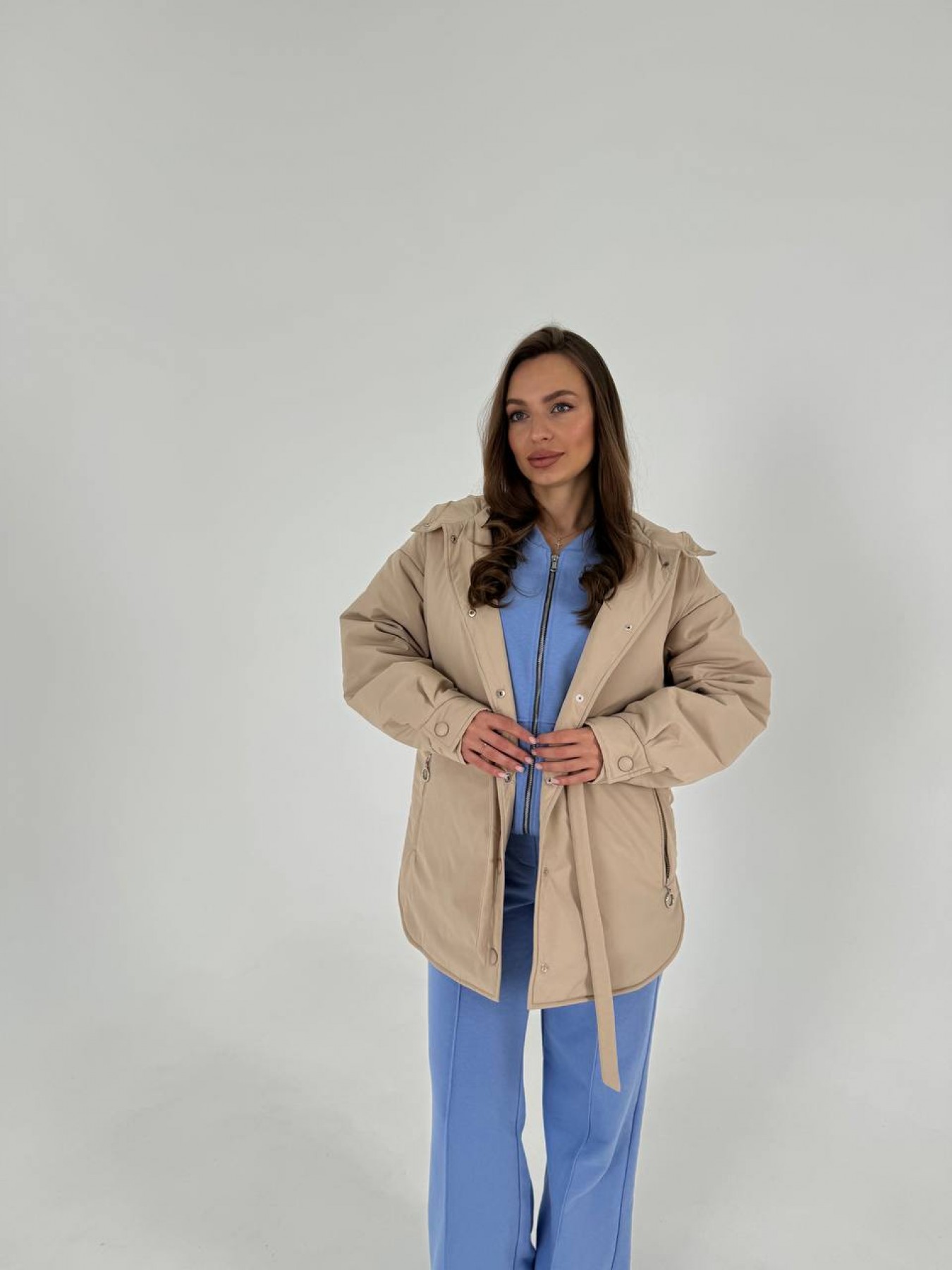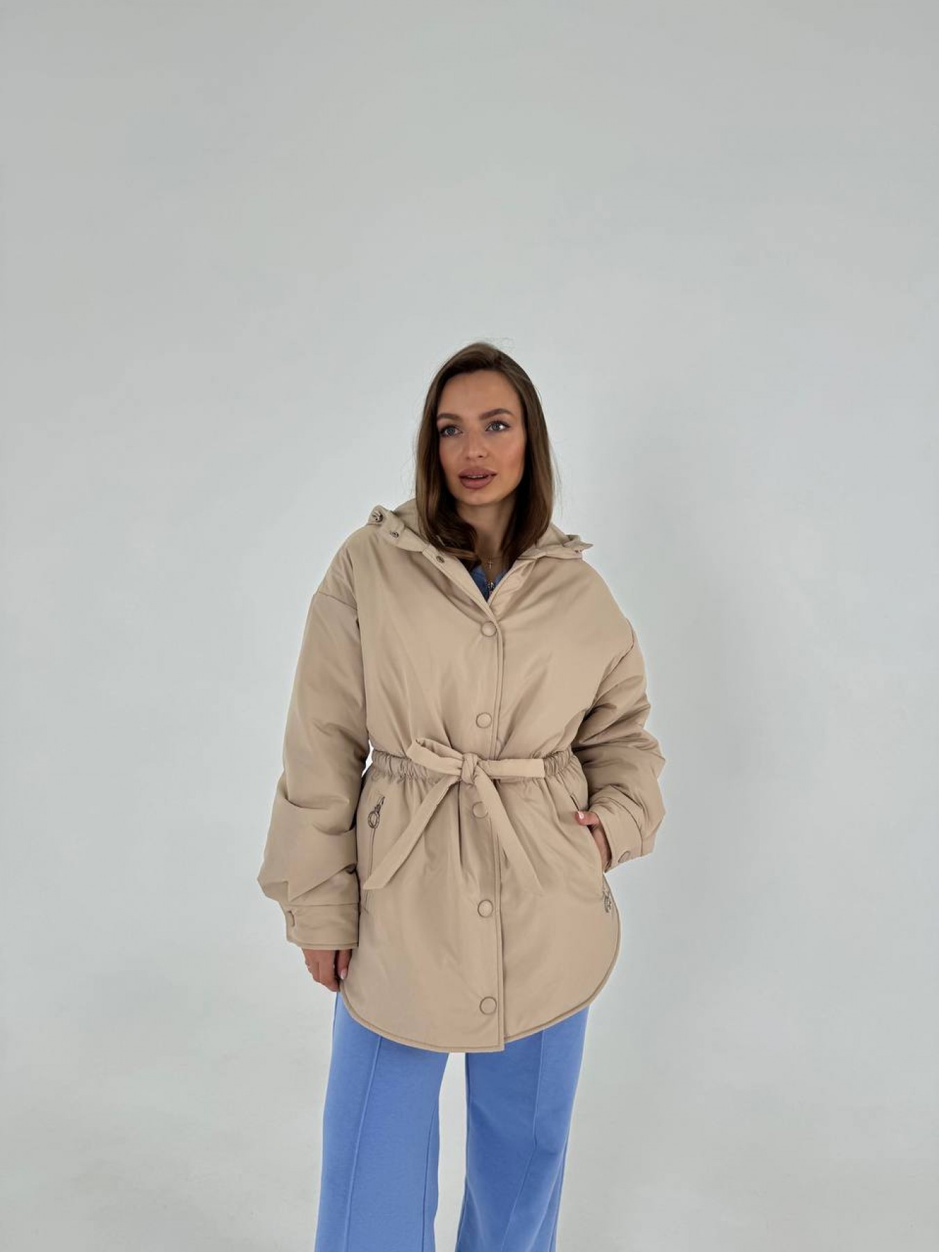 Хіт сезону - куртка крою "oversize" зі спущеним рукавом та капюшоном, прямого силуету у стилі кежуал. Довжина виробу нижче лінії стегна, низ виробу фігурний із бічними розрізами, за типом сорочки. Центральна застібка – декоративні кнопки, обтягнуті основною тканиною. Каптур по лінії відльоту регулюється по висоті на резинку з фіксатором. Рукав спущений – вільний, понизу на манжеті, застібається на декоративну кнопку.