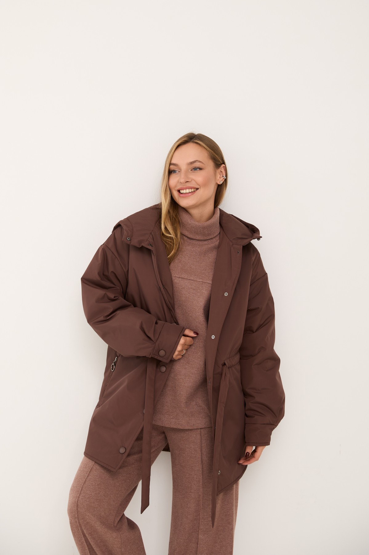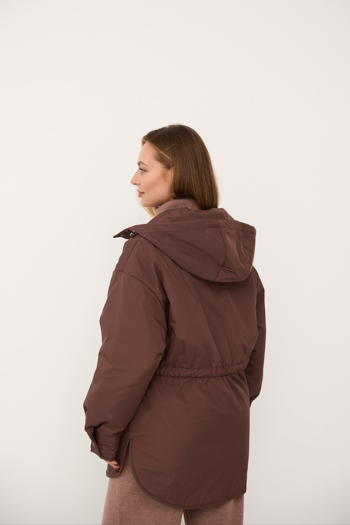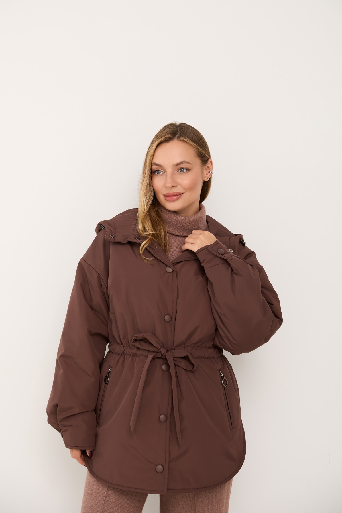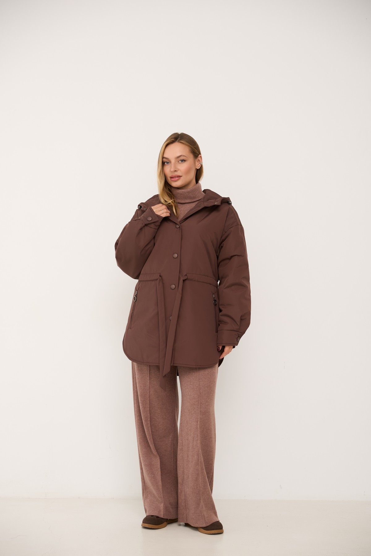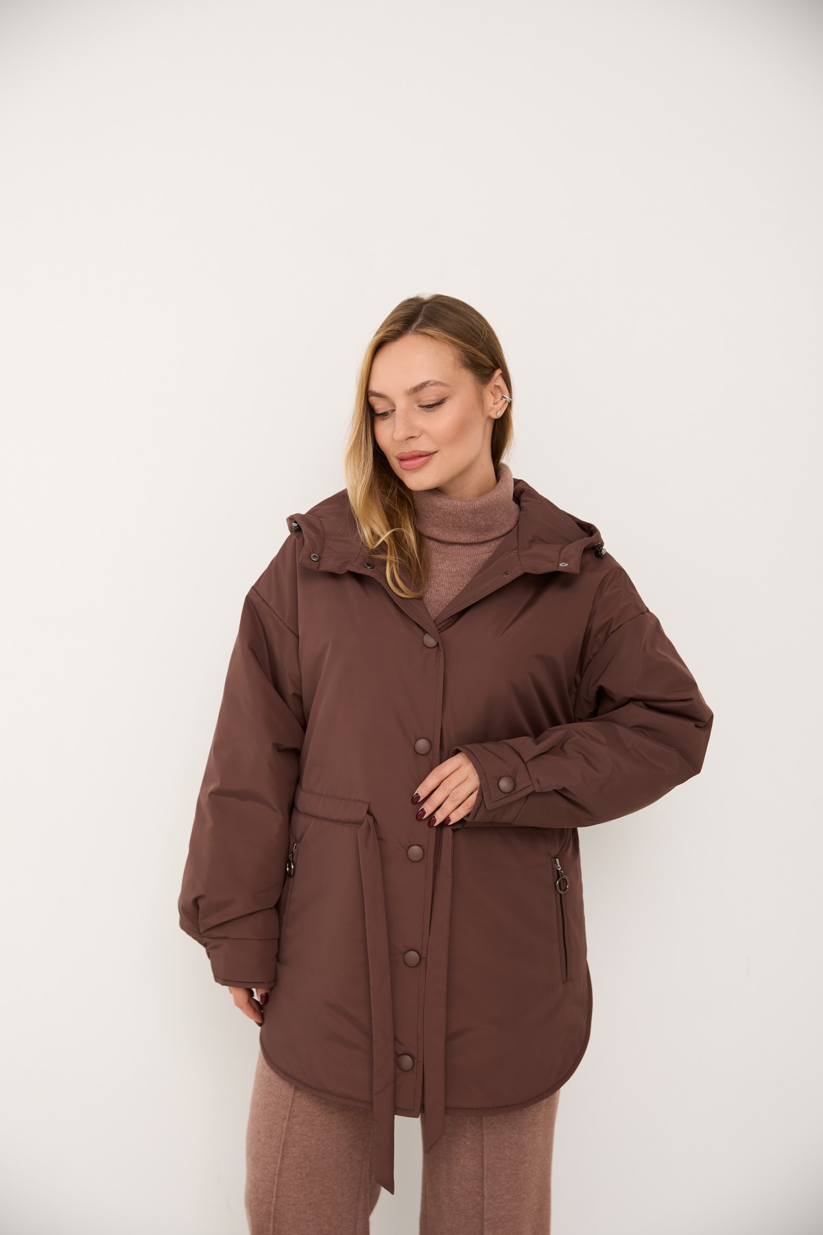 Хіт сезону - куртка крою "oversize" зі спущеним рукавом та капюшоном, прямого силуету у стилі кежуал. Довжина виробу нижче лінії стегна, низ виробу фігурний із бічними розрізами, за типом сорочки. Центральна застібка – декоративні кнопки, обтягнуті основною тканиною. Каптур по лінії відльоту регулюється по висоті на резинку з фіксатором. Рукав спущений – вільний, понизу на манжеті, застібається на декоративну кнопку.