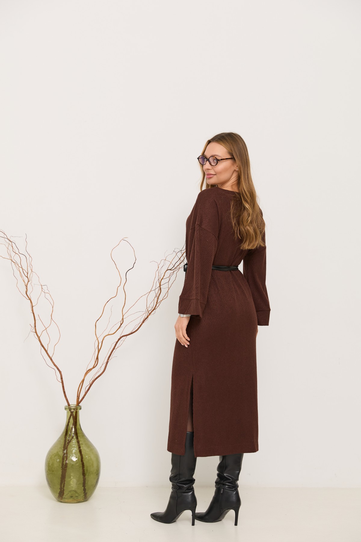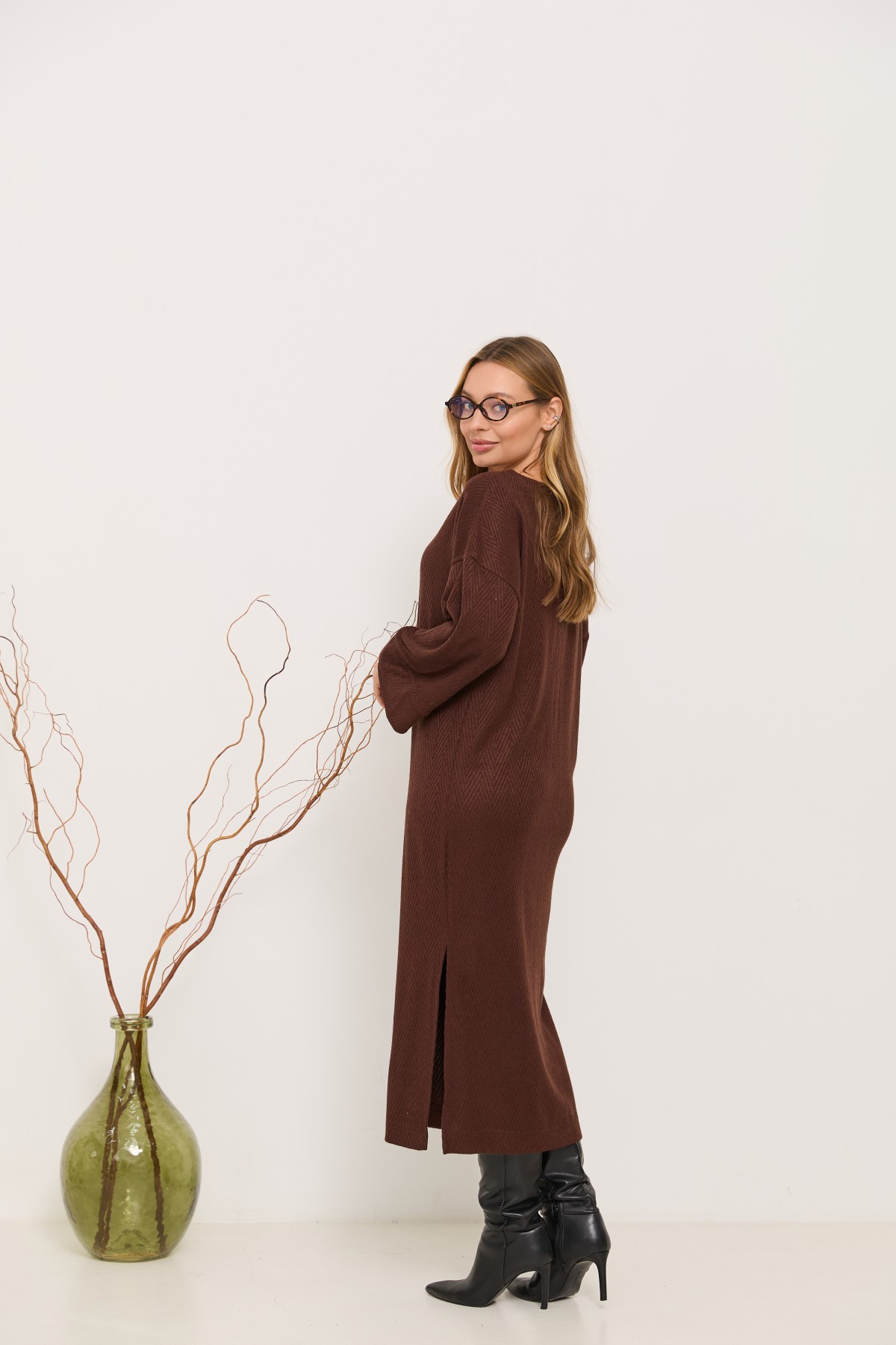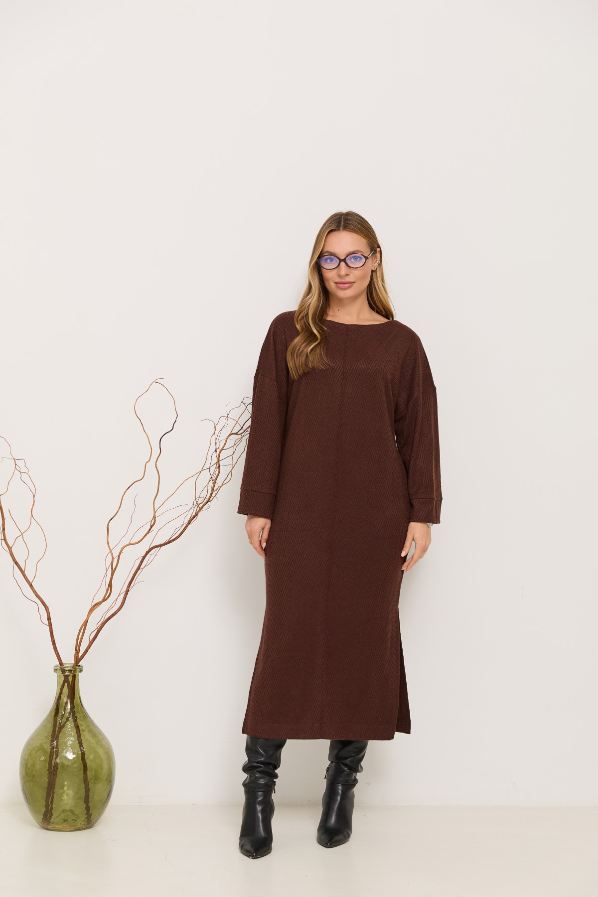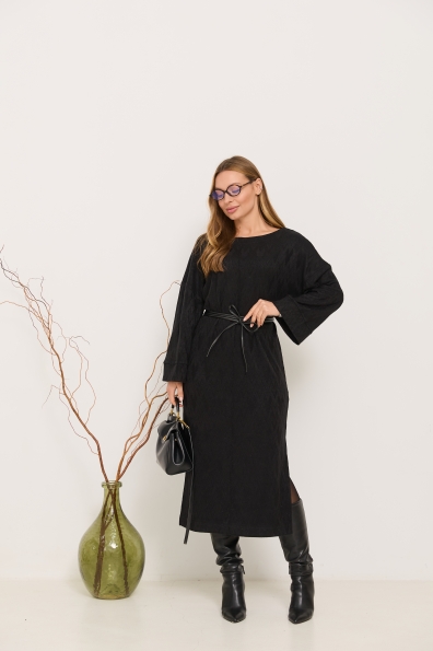 Трикотажна довга сукня прямого сілуету з довгим рукавом, рукав по низу має широкий манжет, по боках сукні є розрізи. Класична сукня з мякого трикотажу, проста, але у той же час таку річ можна одягати як на кожен день, так і на свята.
