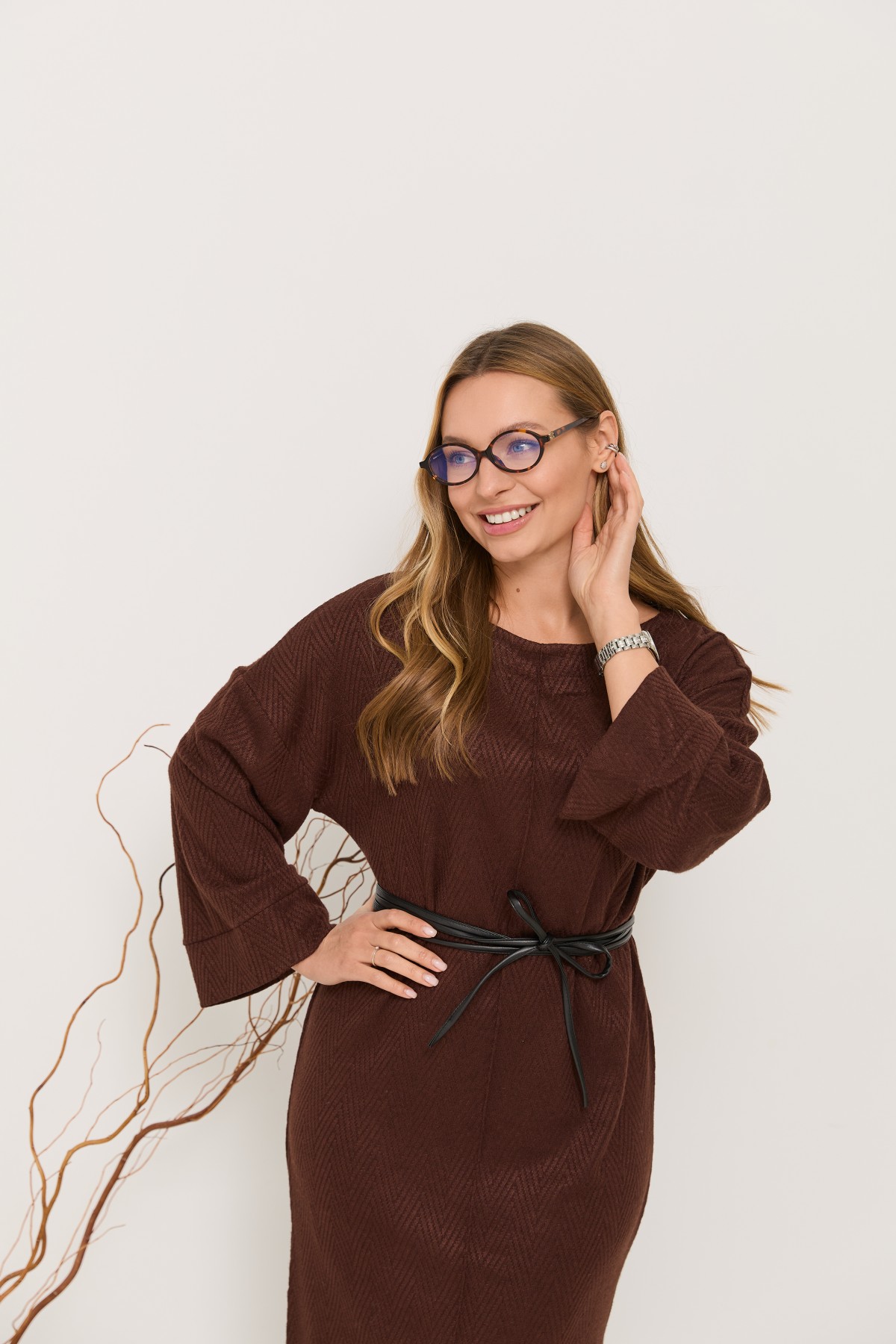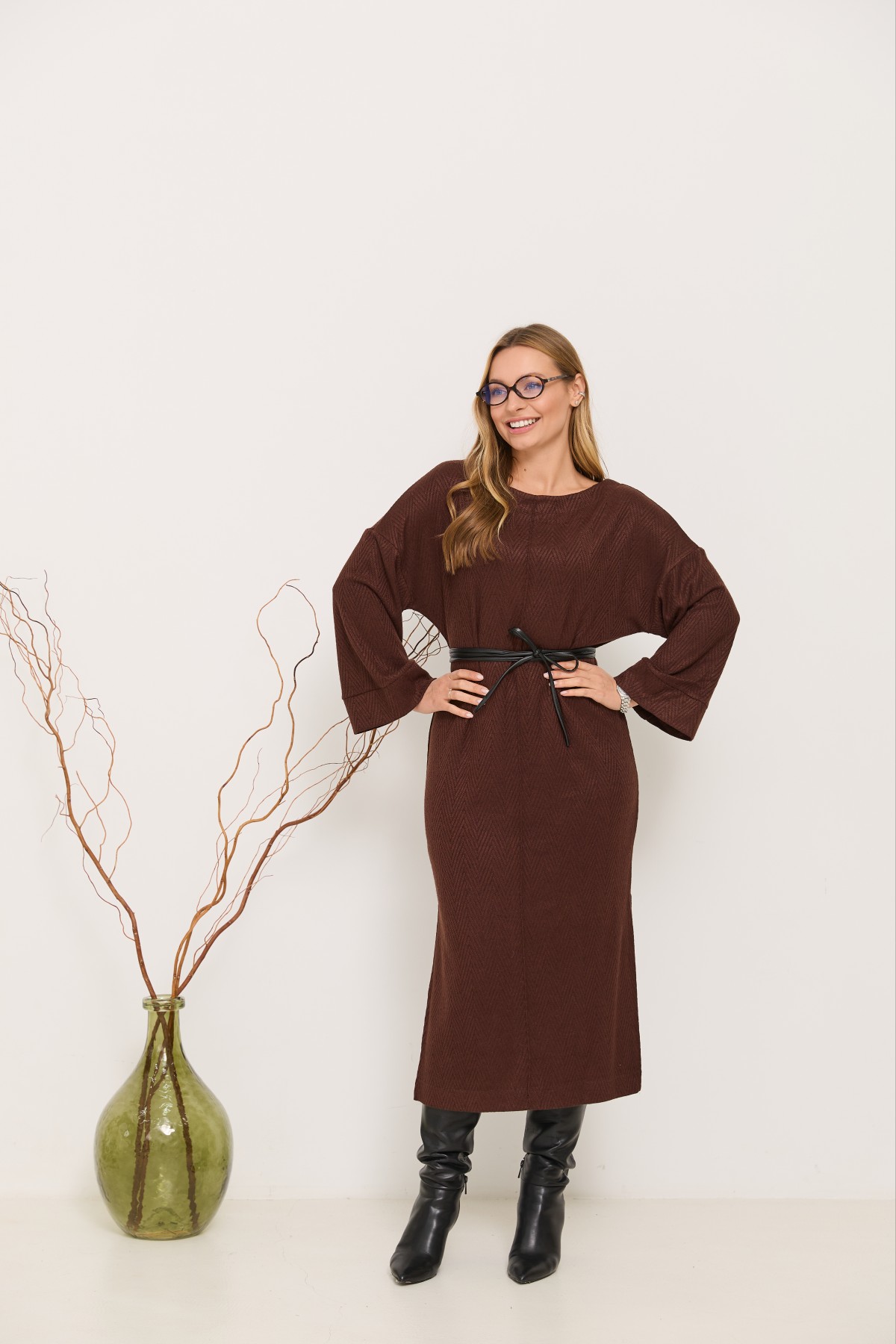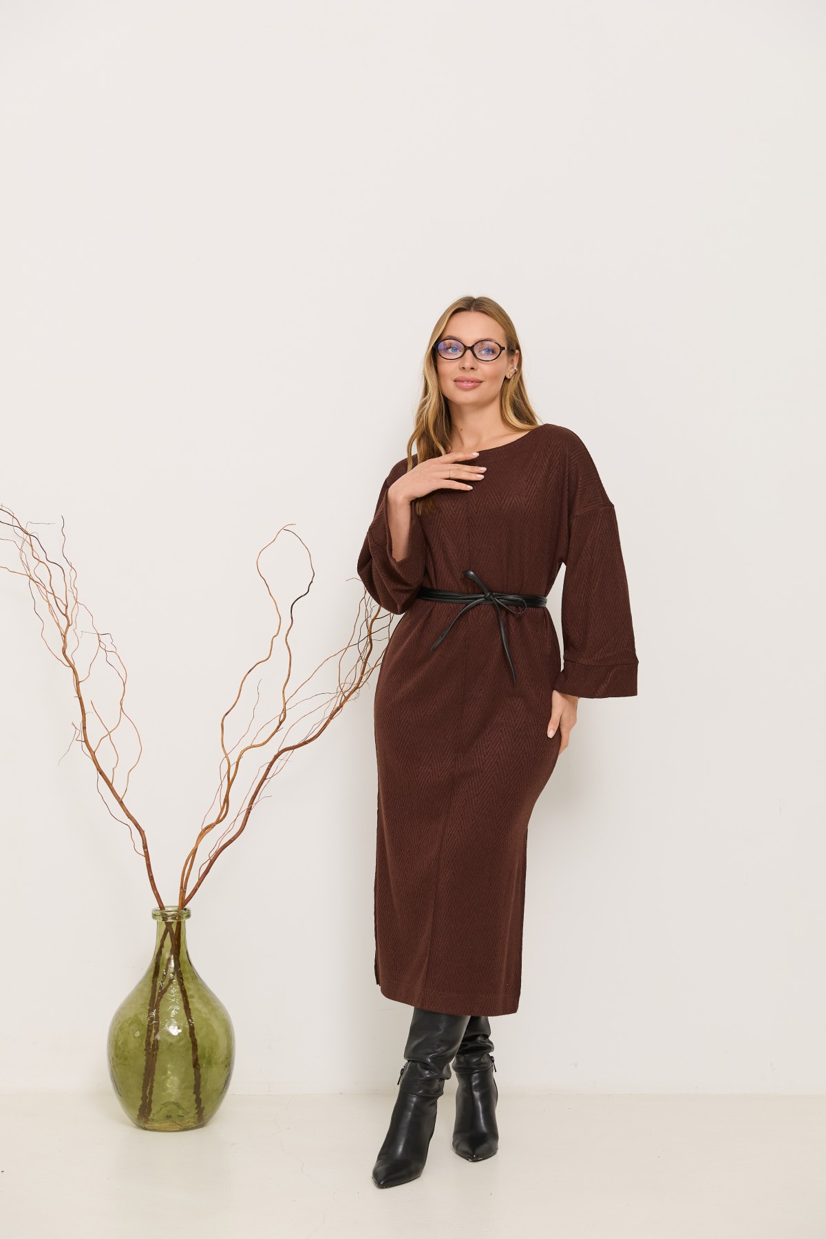 Трикотажна довга сукня прямого сілуету з довгим рукавом, рукав по низу має широкий манжет, по боках сукні є розрізи. Класична сукня з мякого трикотажу, проста, але у той же час таку річ можна одягати як на кожен день, так і на свята.