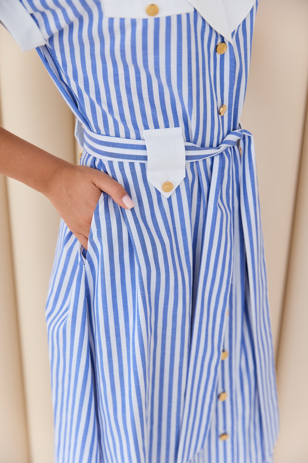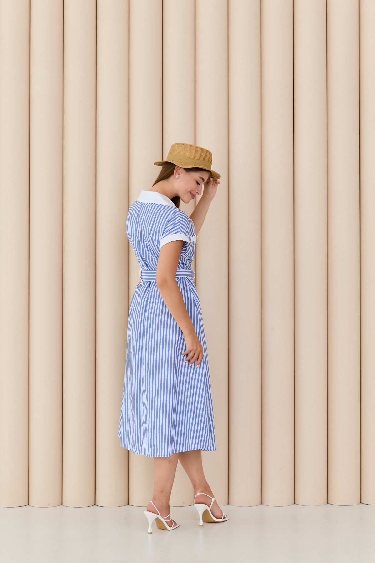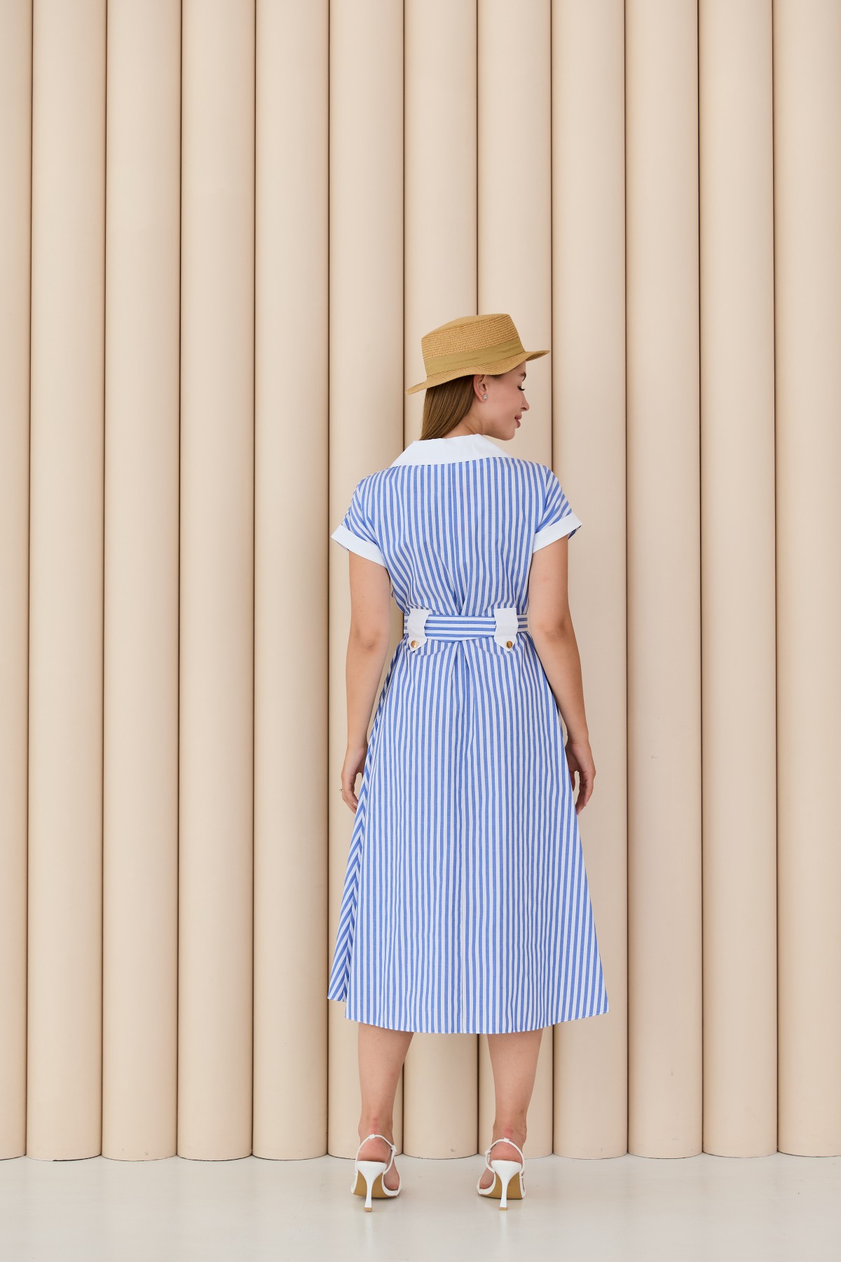 Сукня напівприлеглого силуету, спідниця з клешеною по низу, в морському стилі Довжина сукні до середини ікри. Застібка не петлі і гудзики. Англійський відкладний комір. Цільнокроєний рукав по низу закінчується не регульованим манжетом. декоративні шльовки.