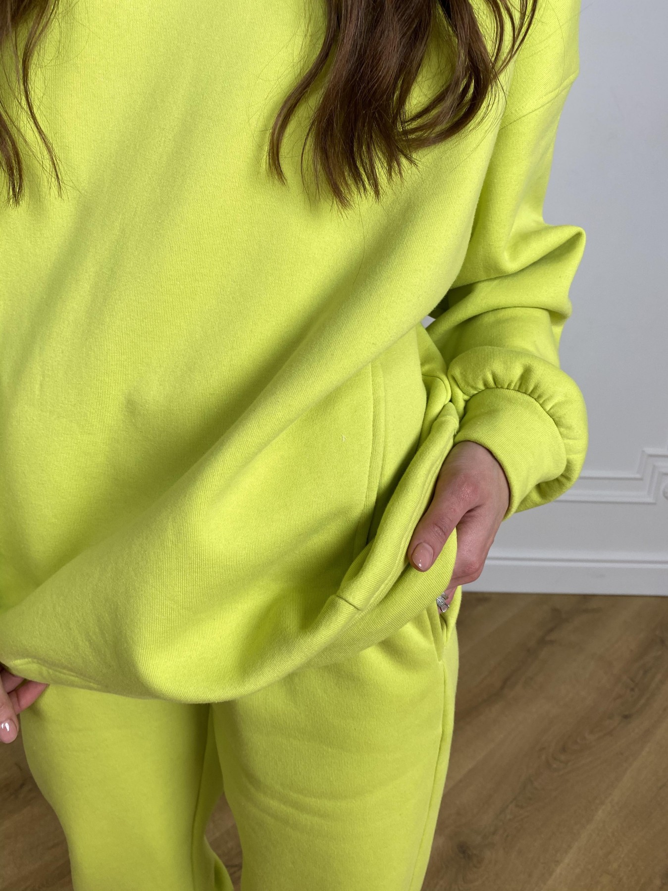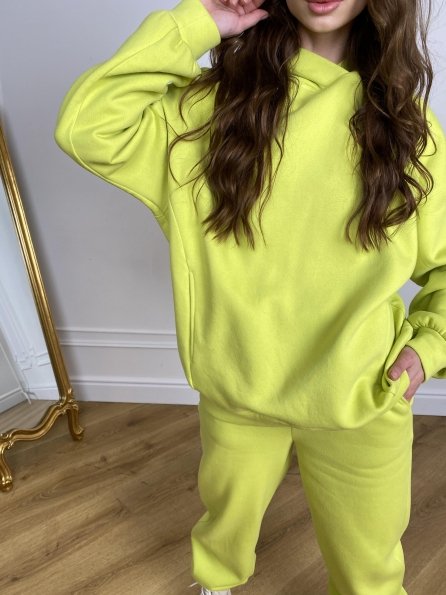Стильный прогулочный костюм оверсайз состоит из худи с капюшоном свободного силуэта и свободных брюк. Худи длиной до середины бедра и брюки длиной до щиколотки. Худи со спущенным плечем и свободными немного удлинненными рукавами, заканчиваются манжетом. На худи и брюках карманы в швах.
