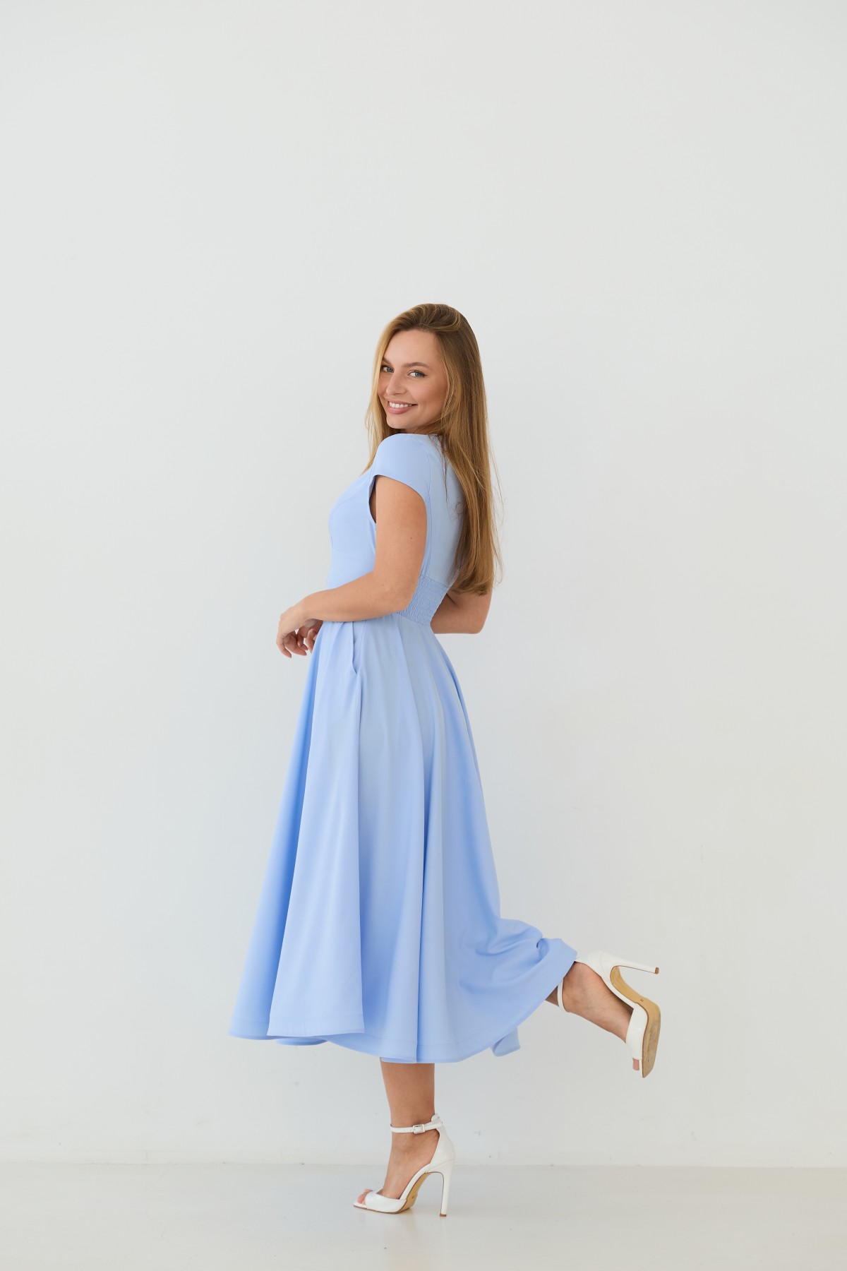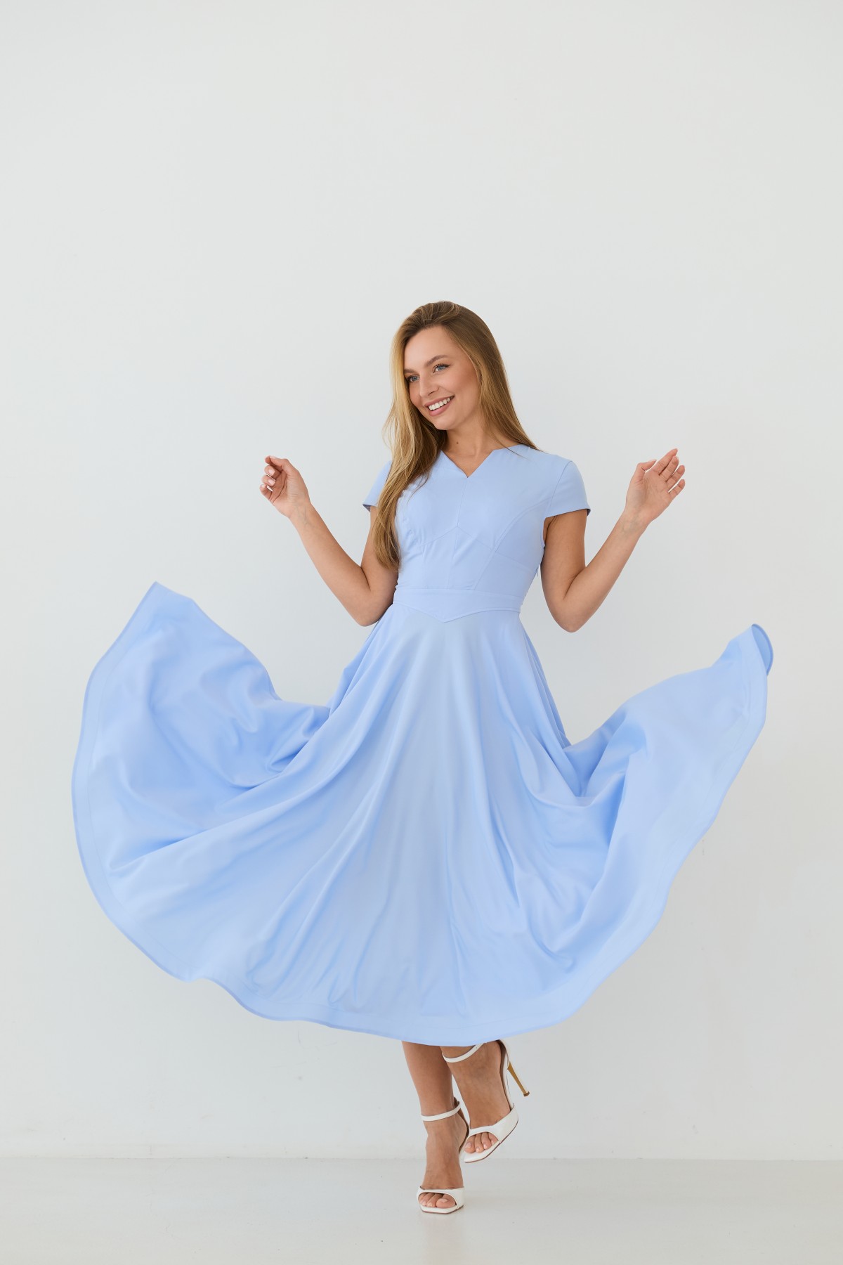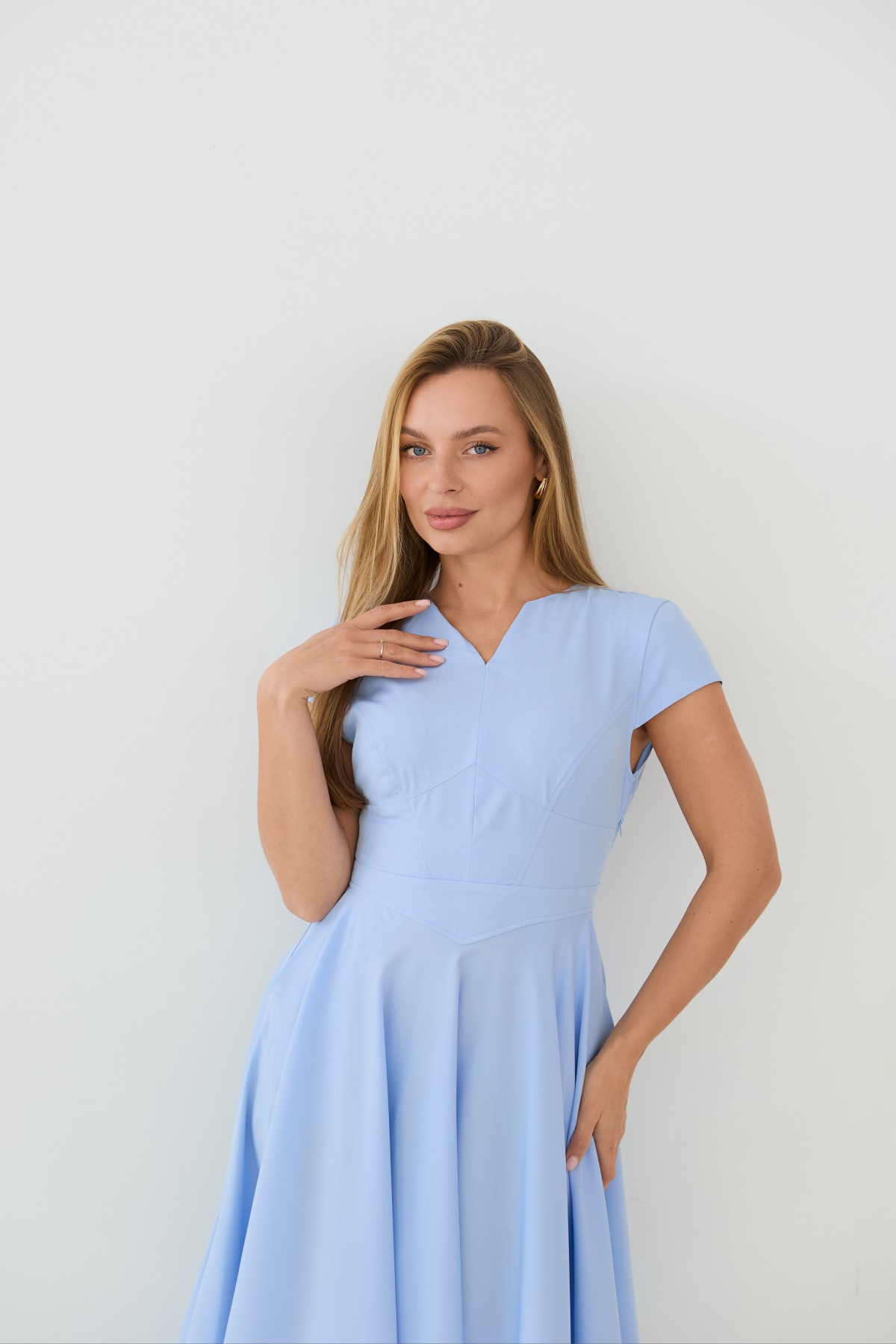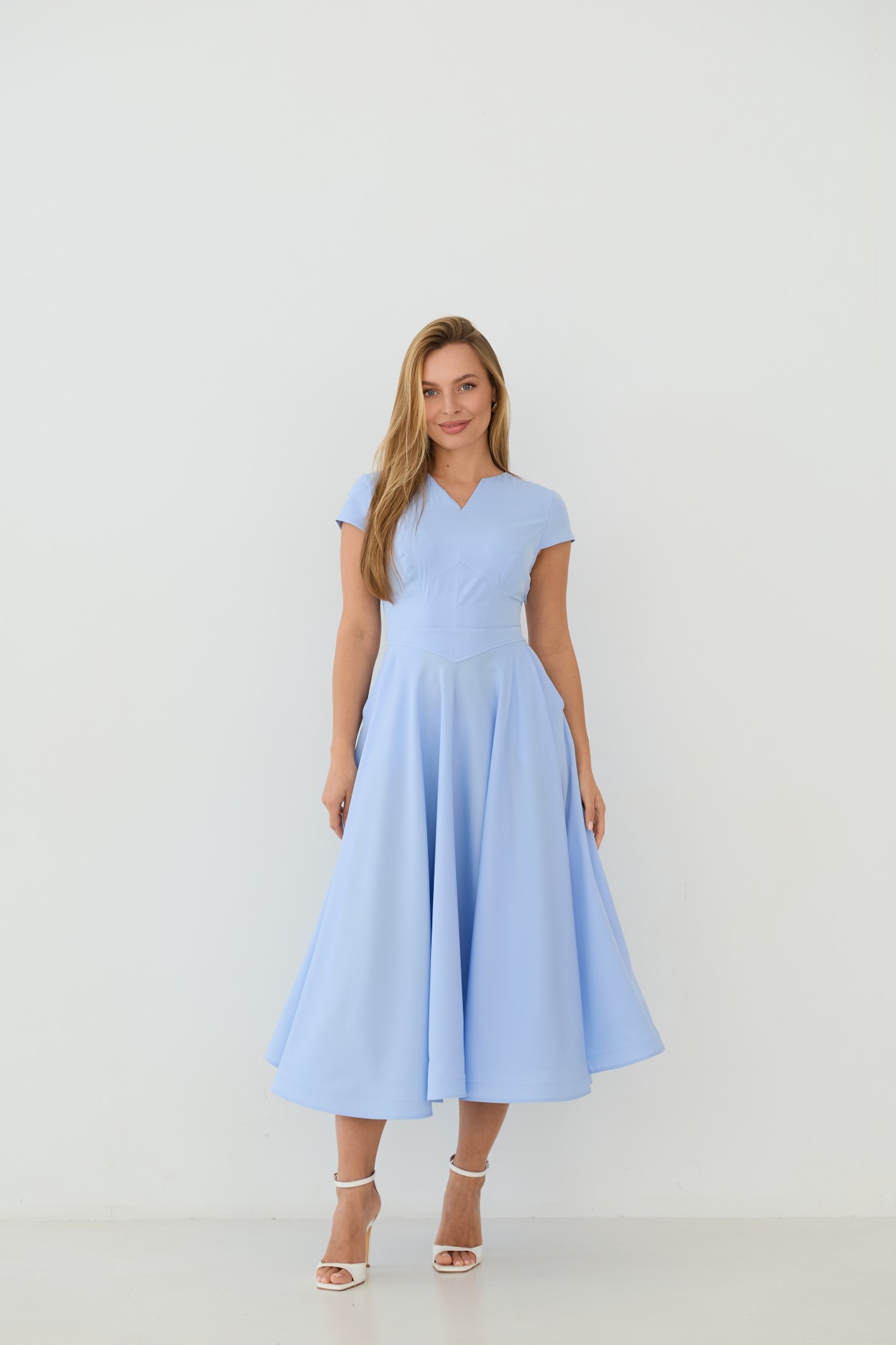 Сукня приталеного силуету, зі спідницею кльош "сонце", у романтичному стилі. Довжина сукні до середини литки. Застібається сукня на блискавку у бічному шві. Короткий рукав формою "крило". Кишені розташовані у підкройному бочці спідниці. Актуальне цього сезону універсальне відмінно підійде як повсякденний одяг, і як варіант для особливих випадків.