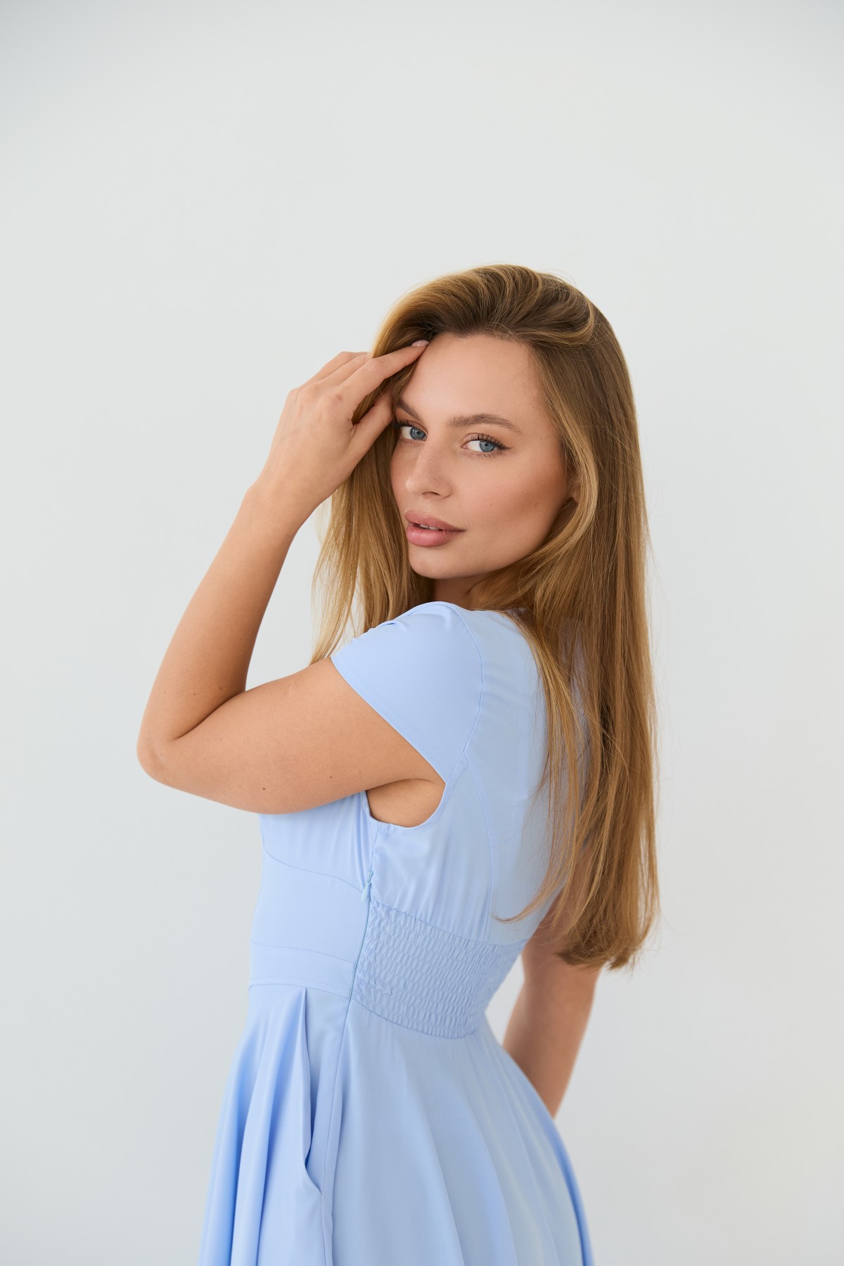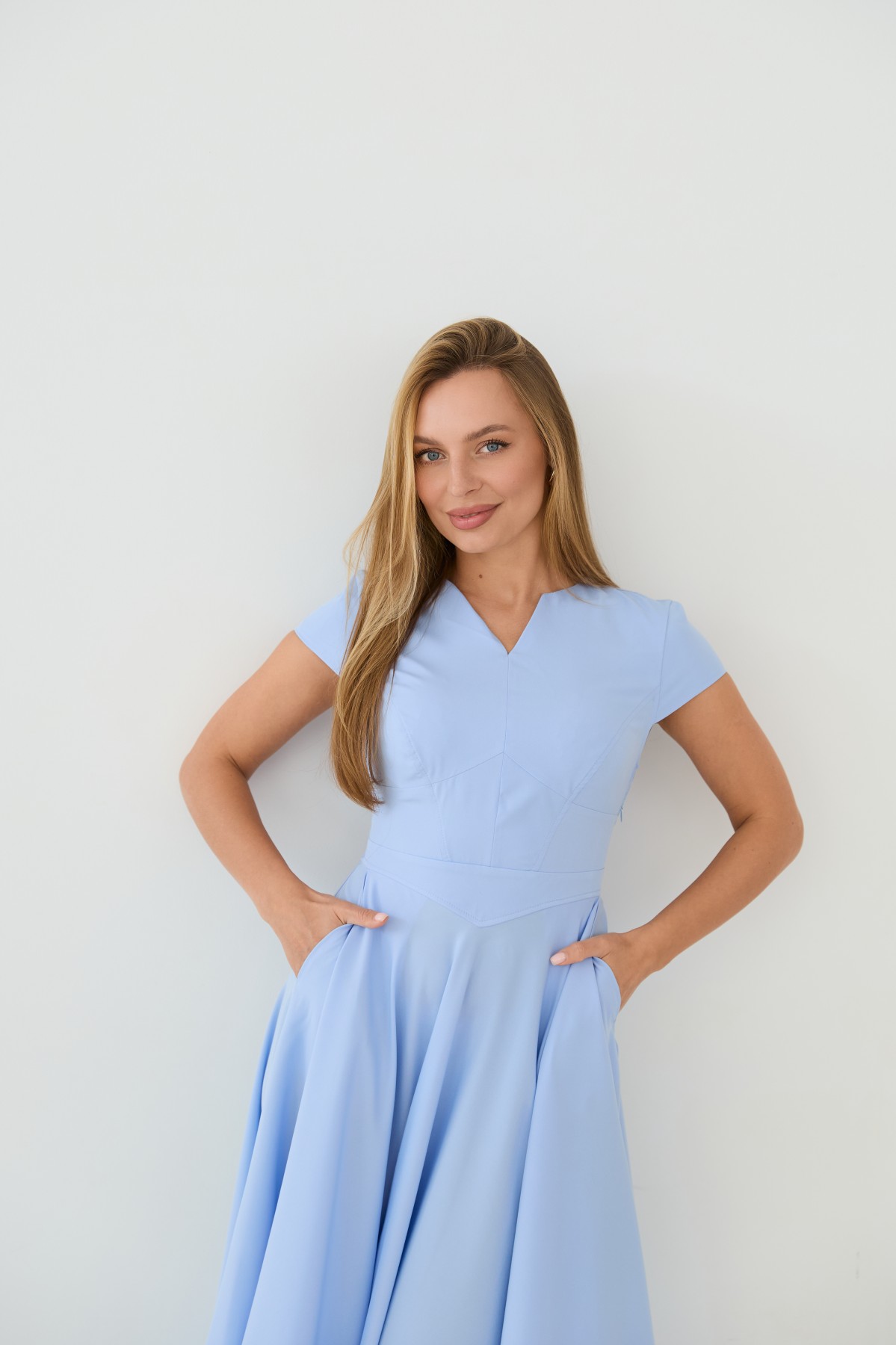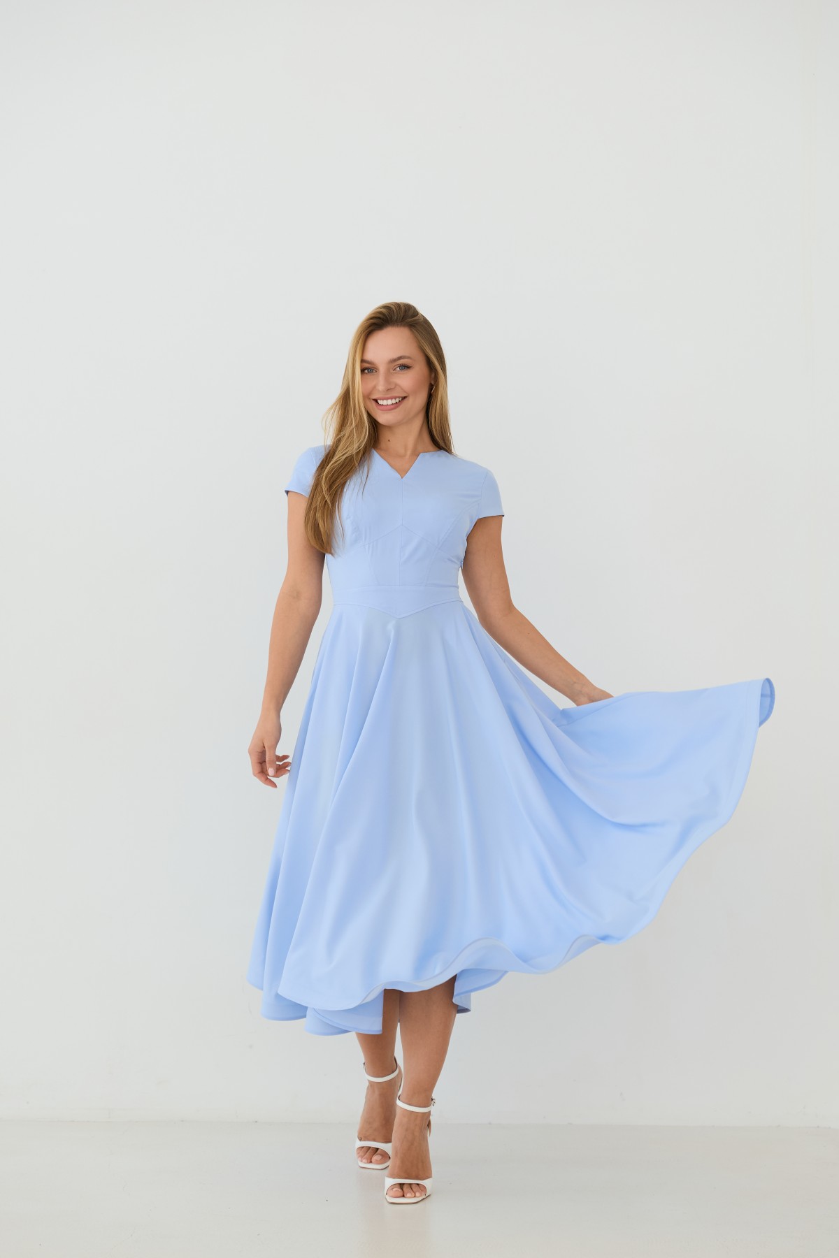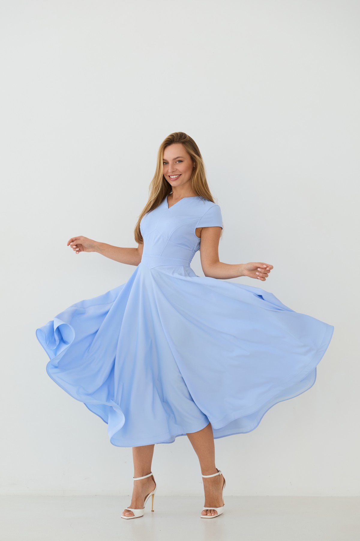 Сукня приталеного силуету, зі спідницею кльош "сонце", у романтичному стилі. Довжина сукні до середини литки. Застібається сукня на блискавку у бічному шві. Короткий рукав формою "крило". Кишені розташовані у підкройному бочці спідниці. Актуальне цього сезону універсальне відмінно підійде як повсякденний одяг, і як варіант для особливих випадків.