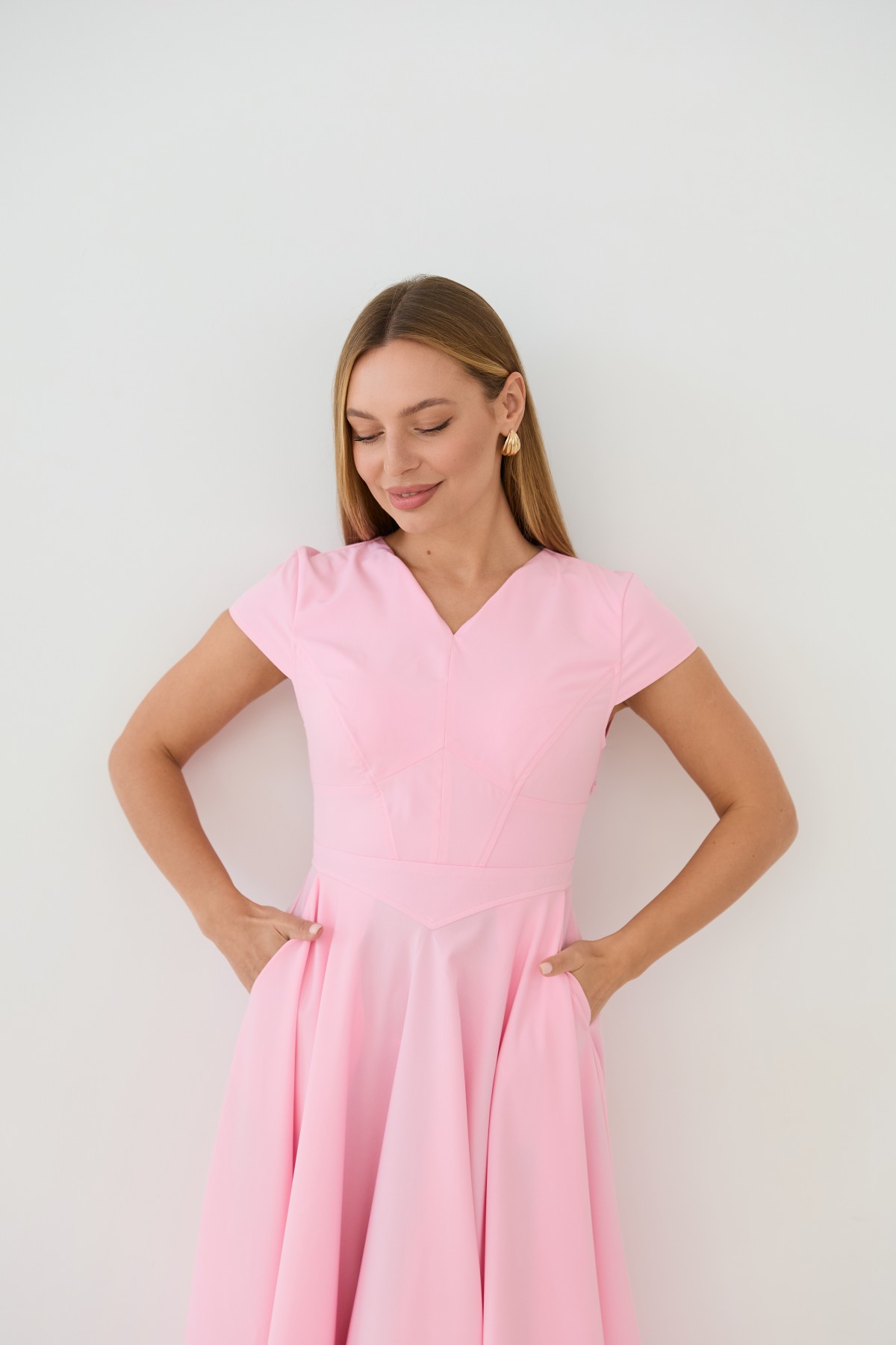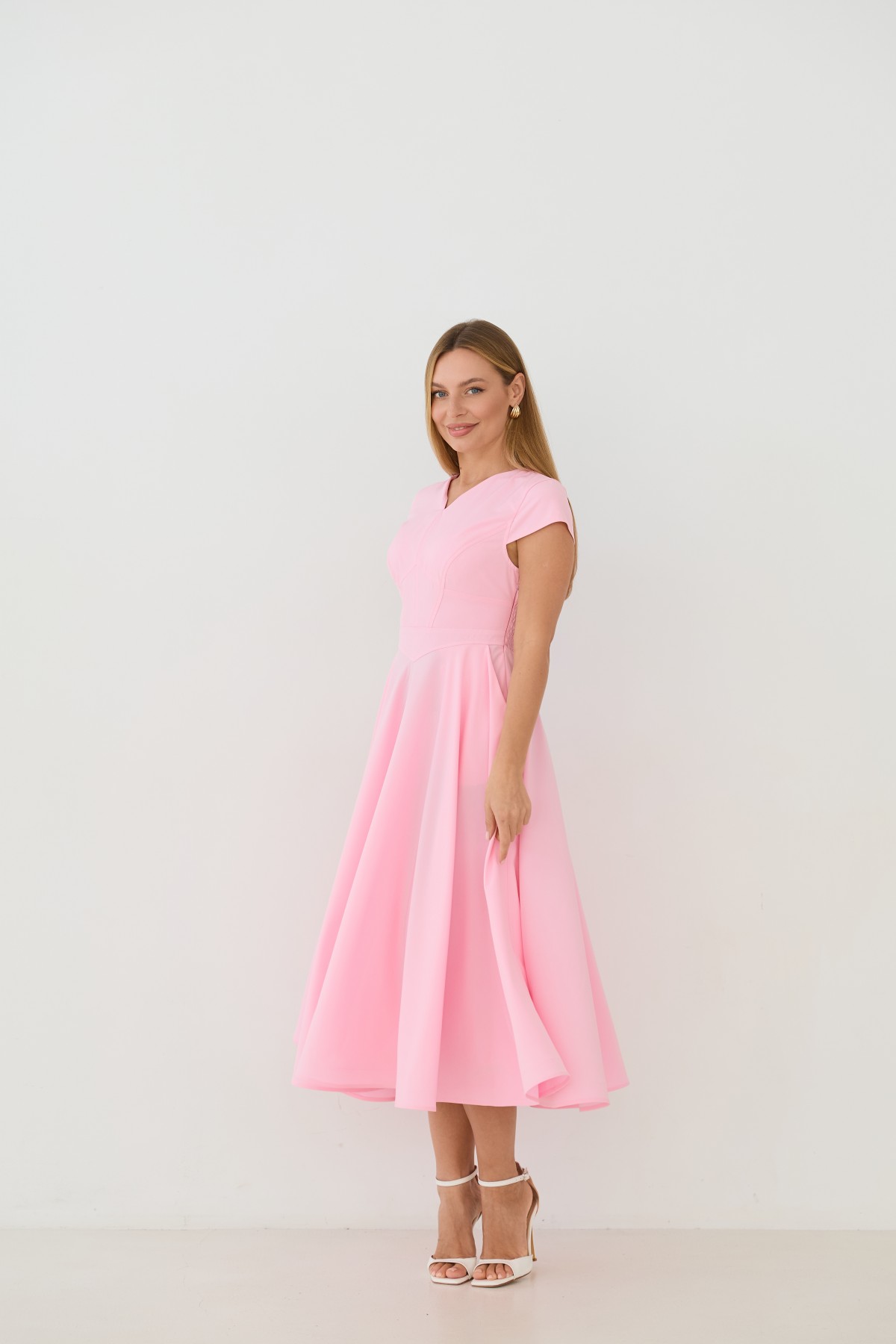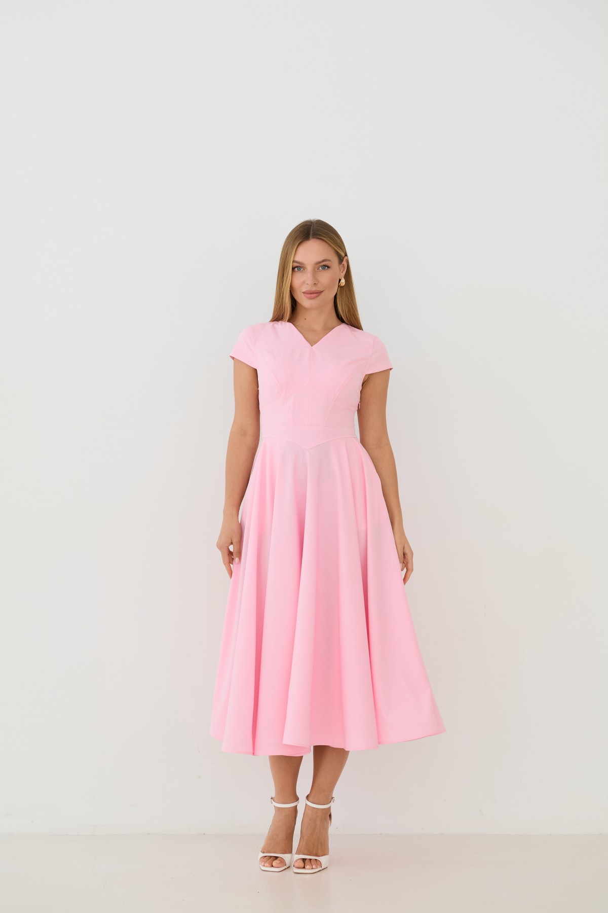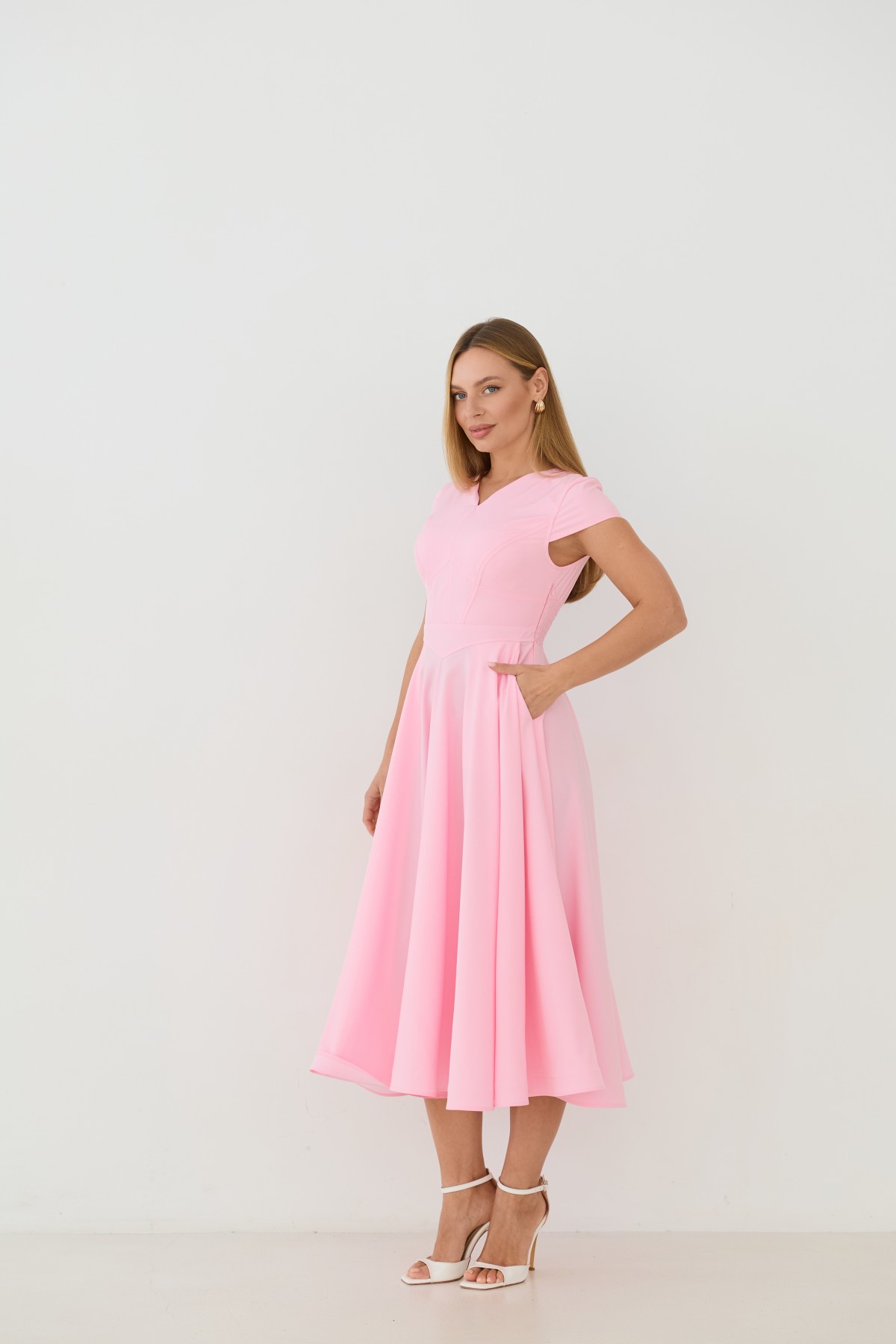 Сукня приталеного силуету, зі спідницею кльош "сонце", у романтичному стилі. Довжина сукні до середини литки. Застібається сукня на блискавку у бічному шві. Короткий рукав формою "крило". Кишені розташовані у підкройному бочці спідниці. Актуальне цього сезону універсальне відмінно підійде як повсякденний одяг, і як варіант для особливих випадків.