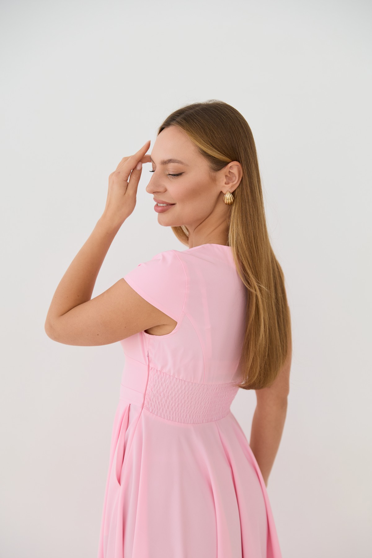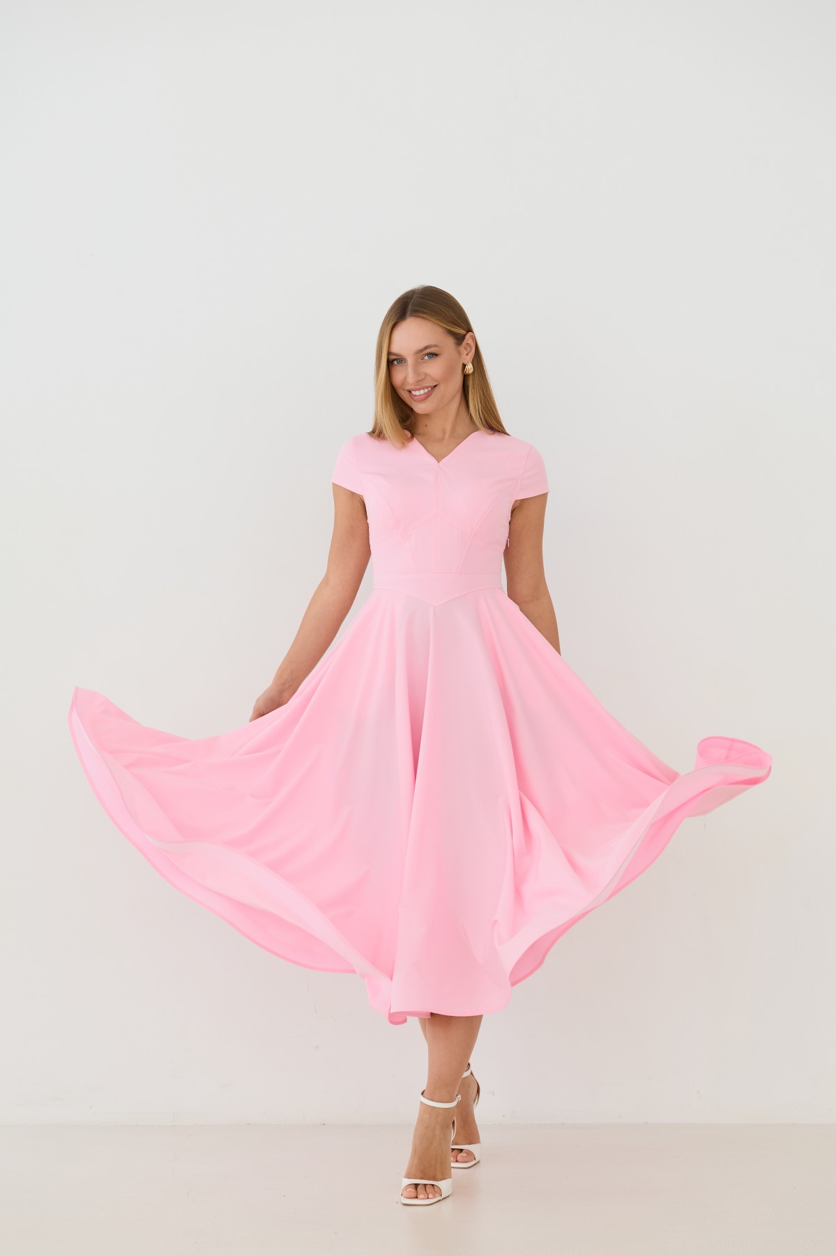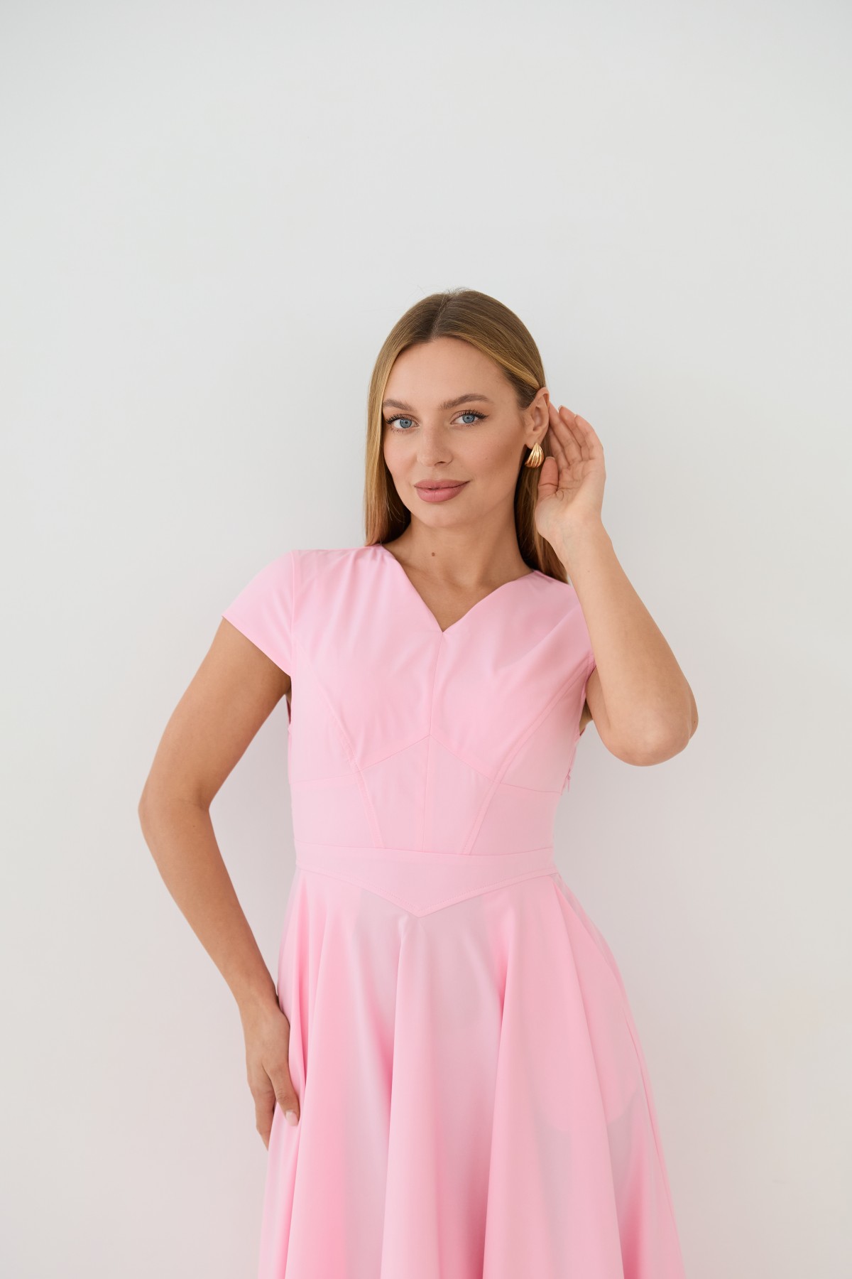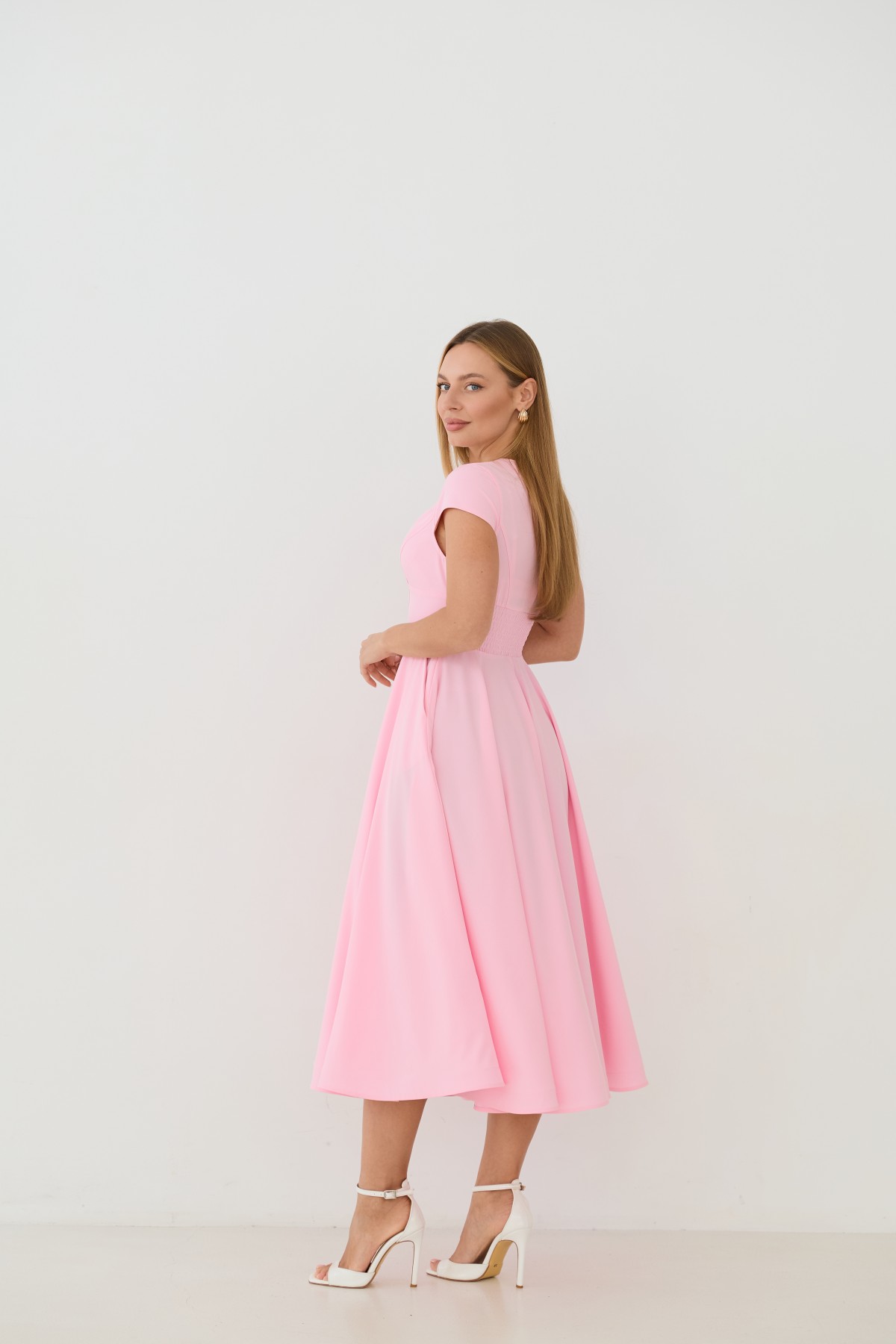 Сукня приталеного силуету, зі спідницею кльош "сонце", у романтичному стилі. Довжина сукні до середини литки. Застібається сукня на блискавку у бічному шві. Короткий рукав формою "крило". Кишені розташовані у підкройному бочці спідниці. Актуальне цього сезону універсальне відмінно підійде як повсякденний одяг, і як варіант для особливих випадків.