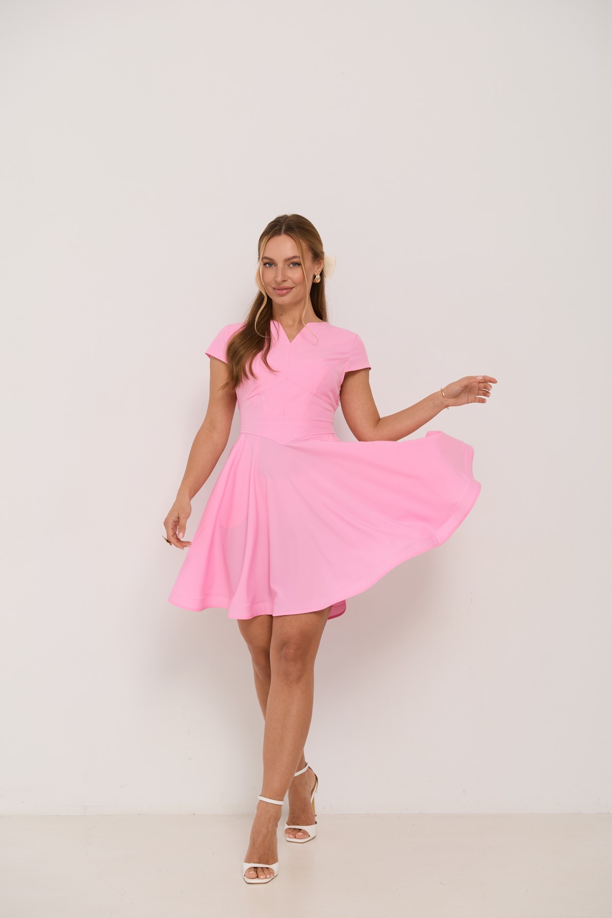Сукня приталеного силуету, зі спідницею кльош "сонце", у романтичному стилі. Довжина сукні вище лінії коліна. Застібається сукня на блискавку у бічному шві. Короткий рукав формою "крило". Кишені розташовані у підкройному бочці спідниці. Актуальне цього сезону універсальне відмінно підійде як повсякденний одяг, і як варіант для особливих випадків.