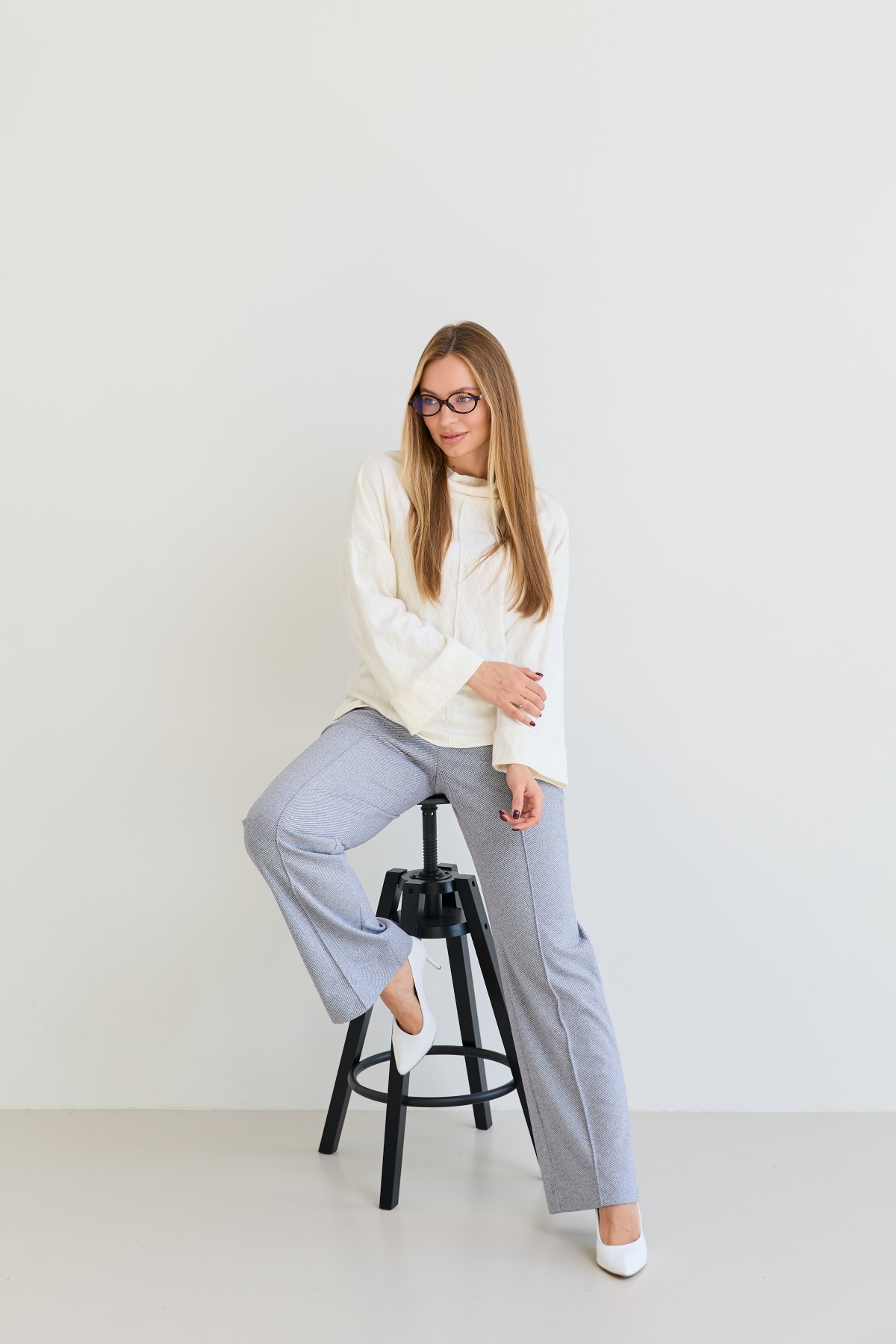 Брюки прямого классического кроя с застроченной стрелкой по центру переднего полотнища. Универсальная длина брюк предусмотрена для носки под каблук, так и под обувь на низком каблуке. На брюках карманы удобно расположены в подрезном бочке.На брюках пояс на резинке.