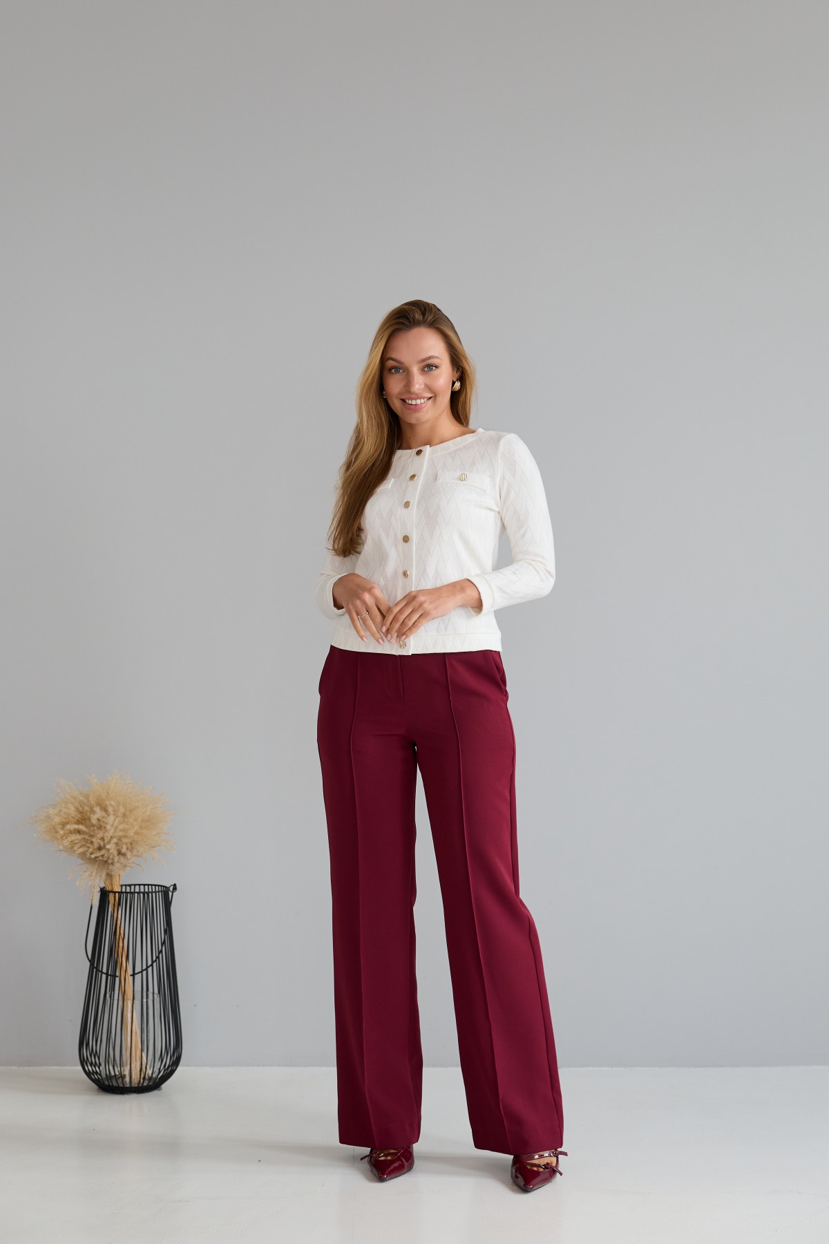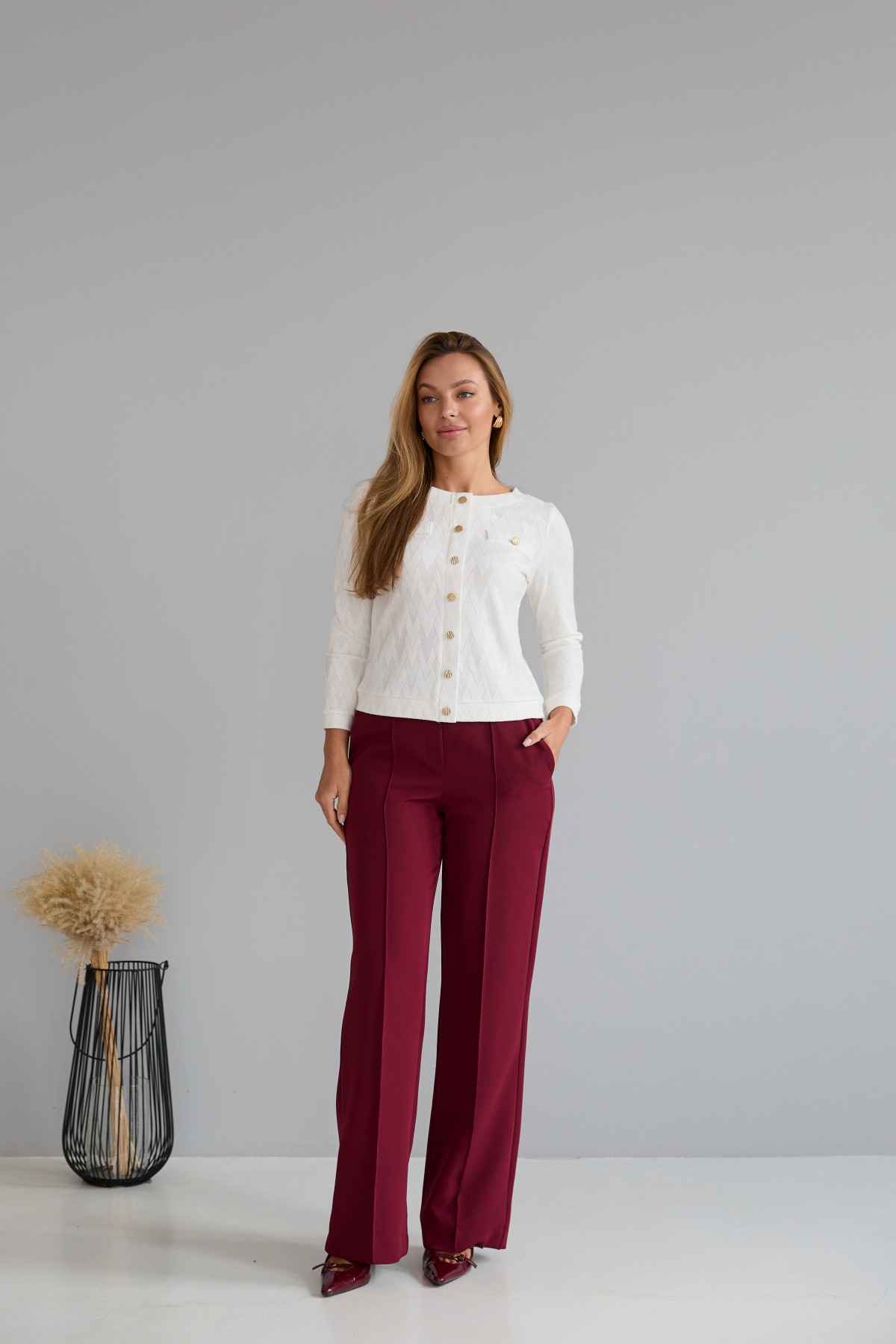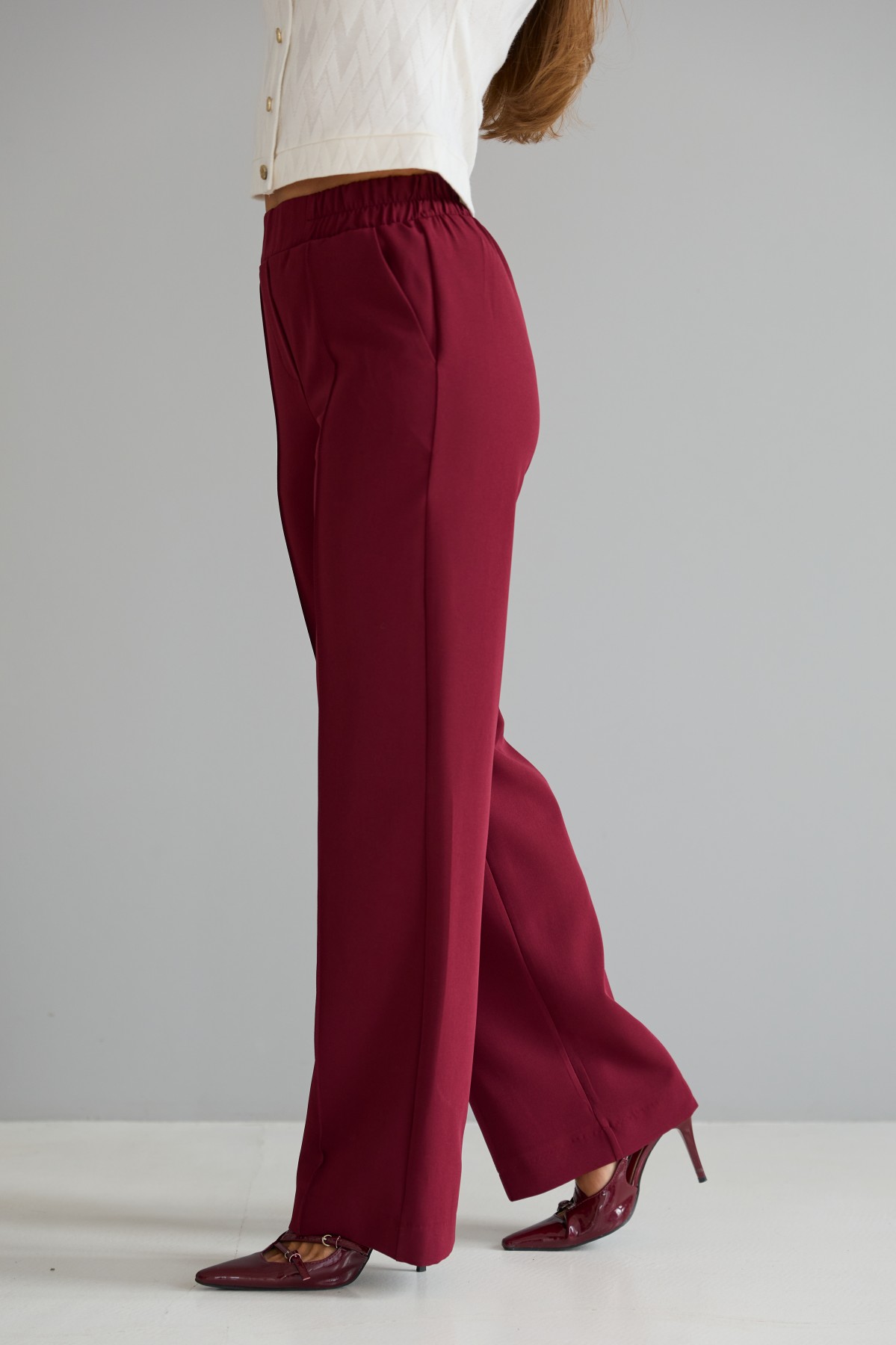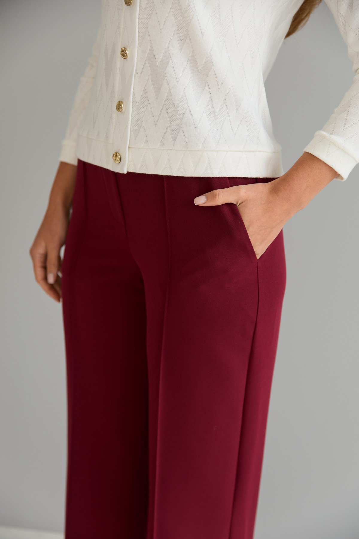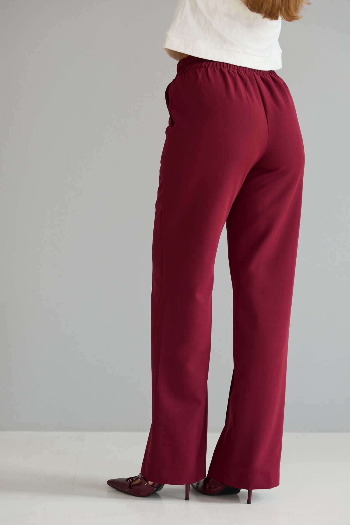 Штани класичного крою із застроченою стрілкою по центру переднього полотнища. На штанах пояс на резинці. Штани чудово поєднують у собі зручність та елегантність. Незважаючи на строгість, їх можна носити як під туфлі на високому підборі, збираючись на ділову зустріч, так і під кеди на прогулянці в міському парку.