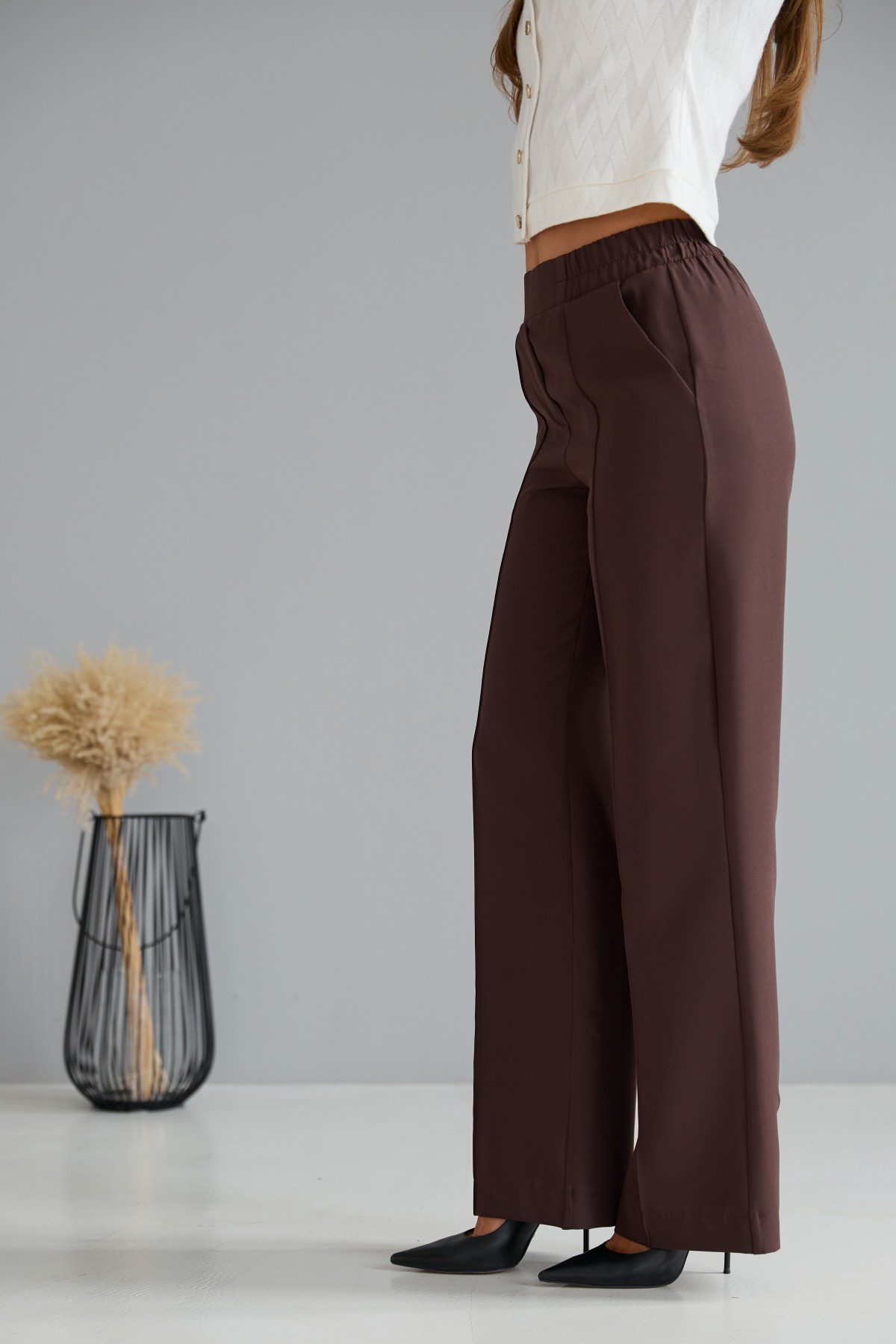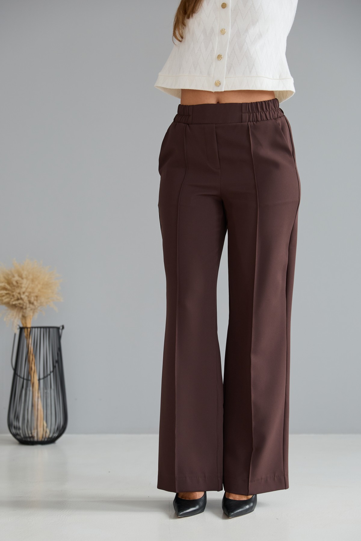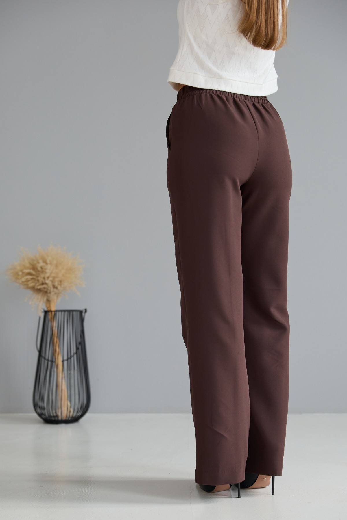 Штани класичного крою із застроченою стрілкою по центру переднього полотнища. На штанах пояс на резинці. Штани чудово поєднують у собі зручність та елегантність. Незважаючи на строгість, їх можна носити як під туфлі на високому підборі, збираючись на ділову зустріч, так і під кеди на прогулянці в міському парку.