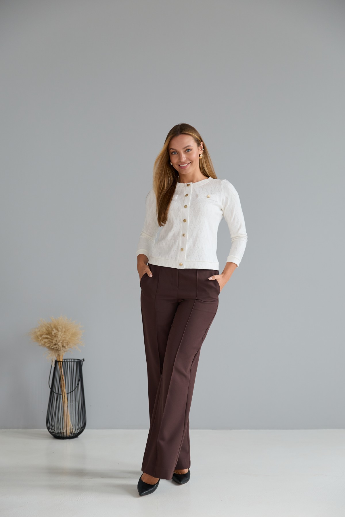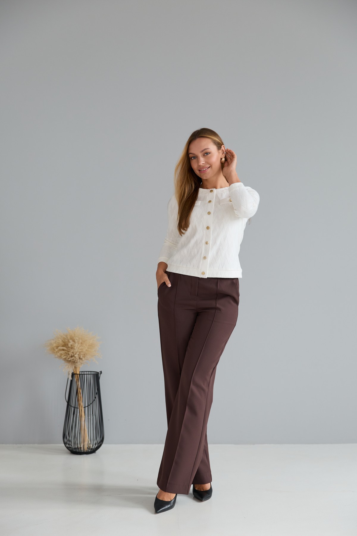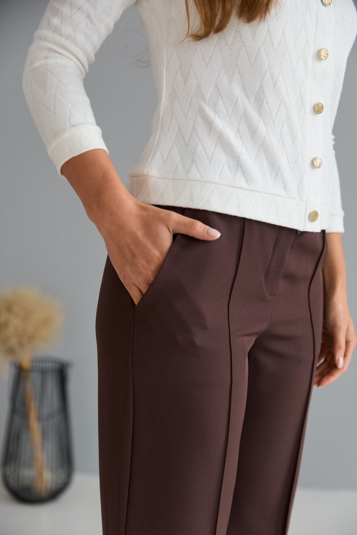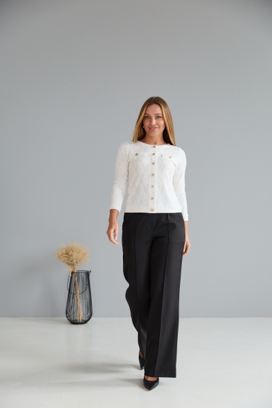 Штани класичного крою із застроченою стрілкою по центру переднього полотнища. На штанах пояс на резинці. Штани чудово поєднують у собі зручність та елегантність. Незважаючи на строгість, їх можна носити як під туфлі на високому підборі, збираючись на ділову зустріч, так і під кеди на прогулянці в міському парку.