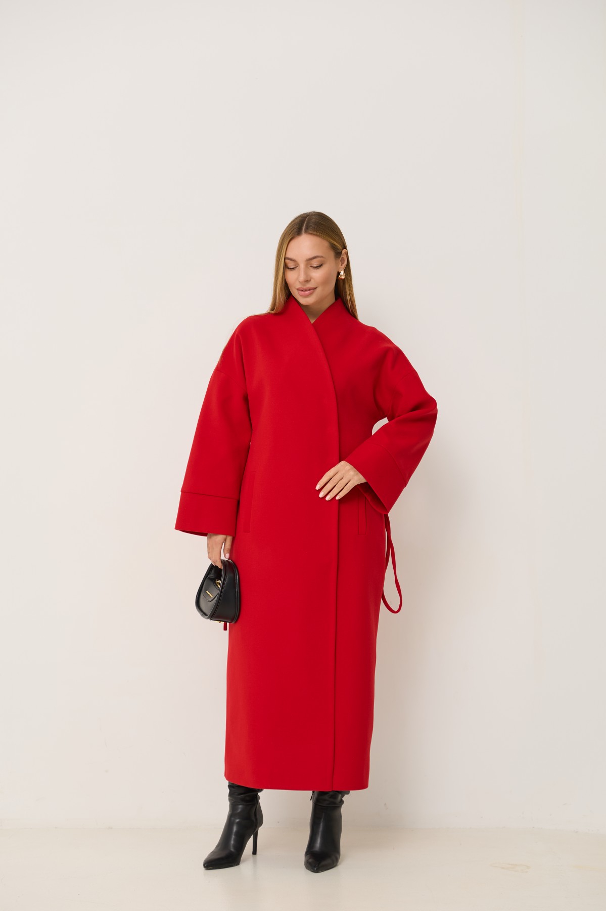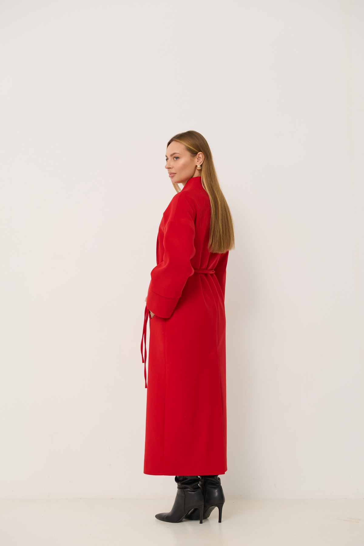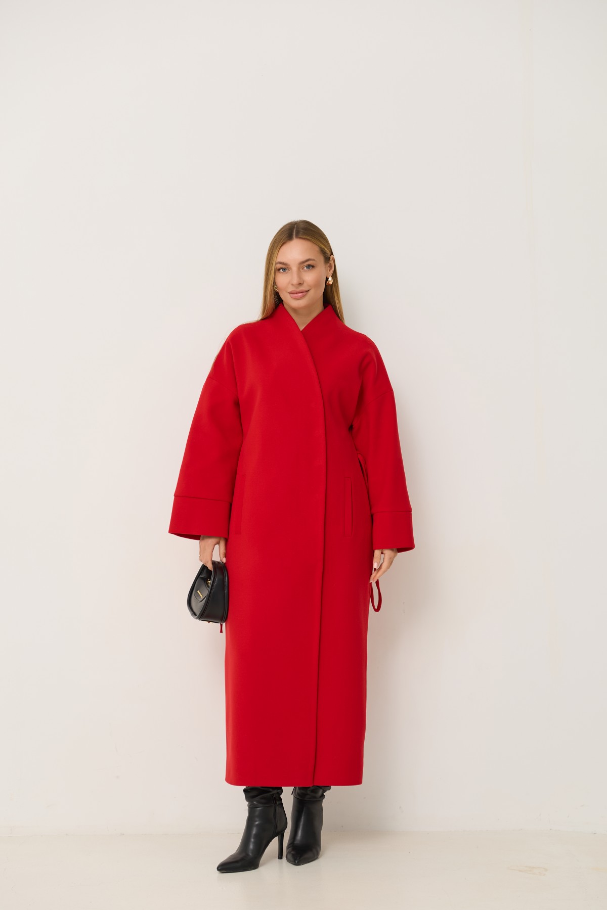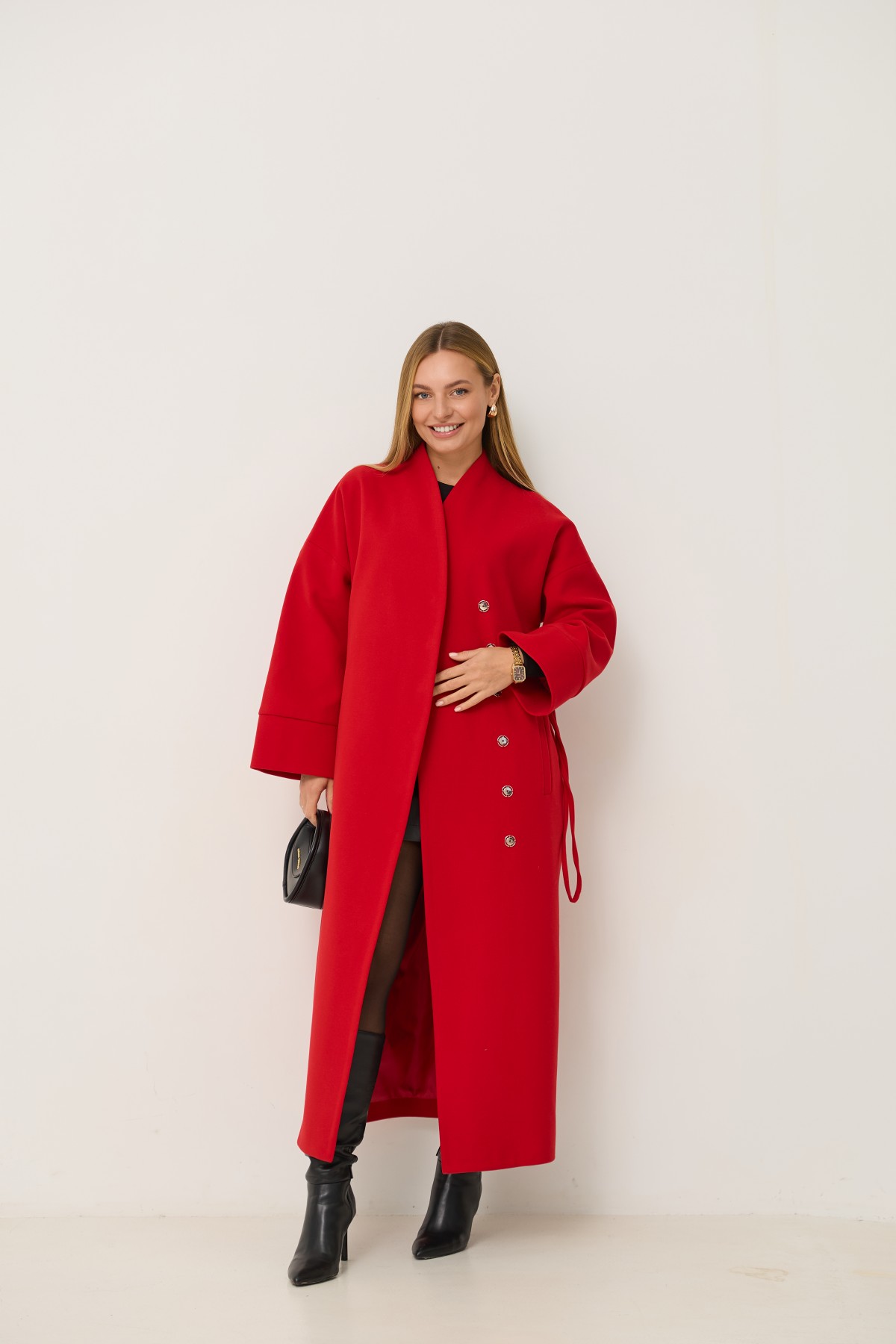 Класичне демісезонне довге пальто прямого сілуету, з цільнокроєною стійкою та спущеною лінією плеча з одношовним рукавом. Довжина пальто - МАКСІ - нижче колін. Застібка на пришивні металеві потайні кнопки. Пояс знімний з основної тканини. Максі-довжинаДовге пальто у стилі кімано. Надягаючи таке пальто, ви відразу створюєте собі модний образ.Кишеня прорізна з листочкою та клапаном.