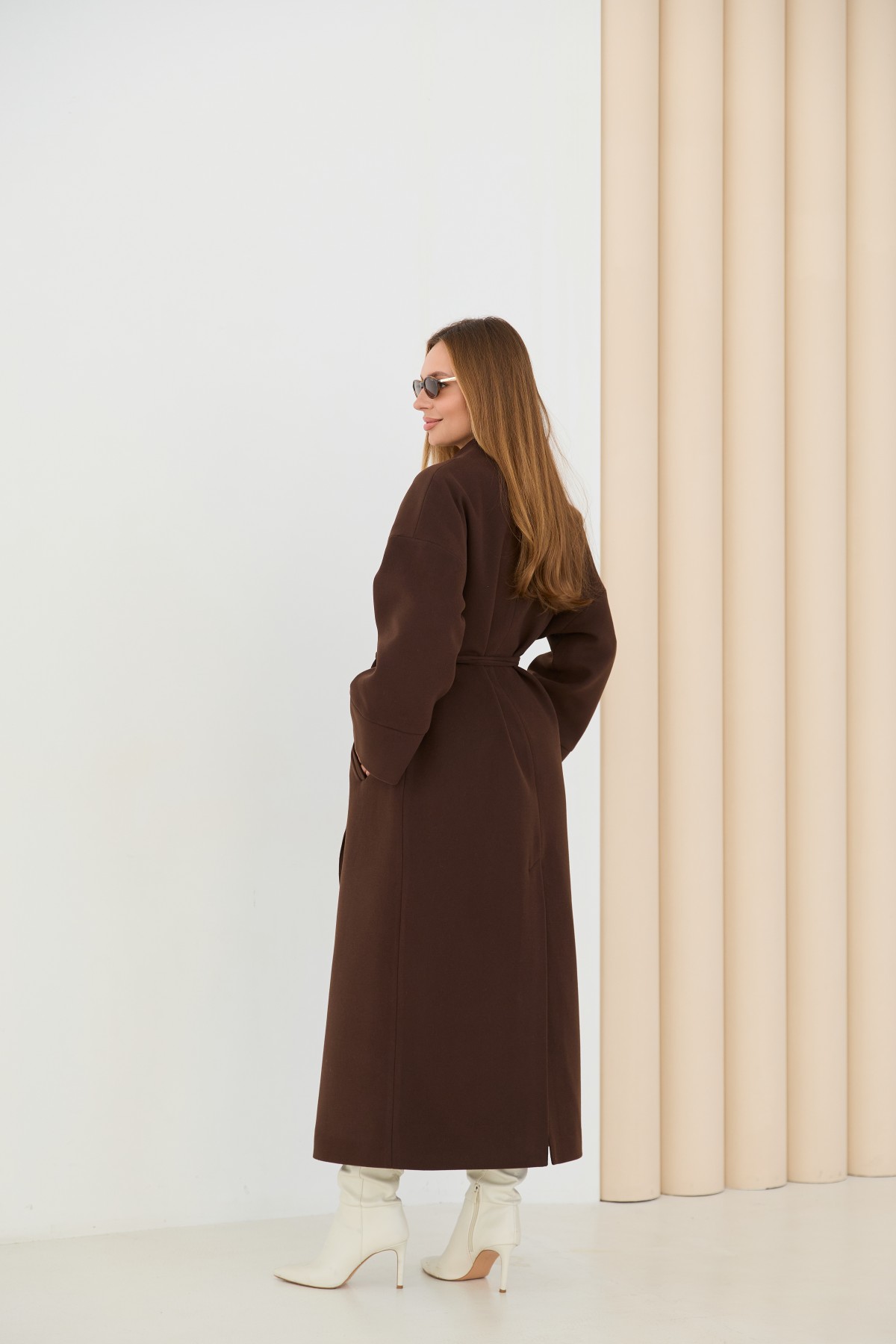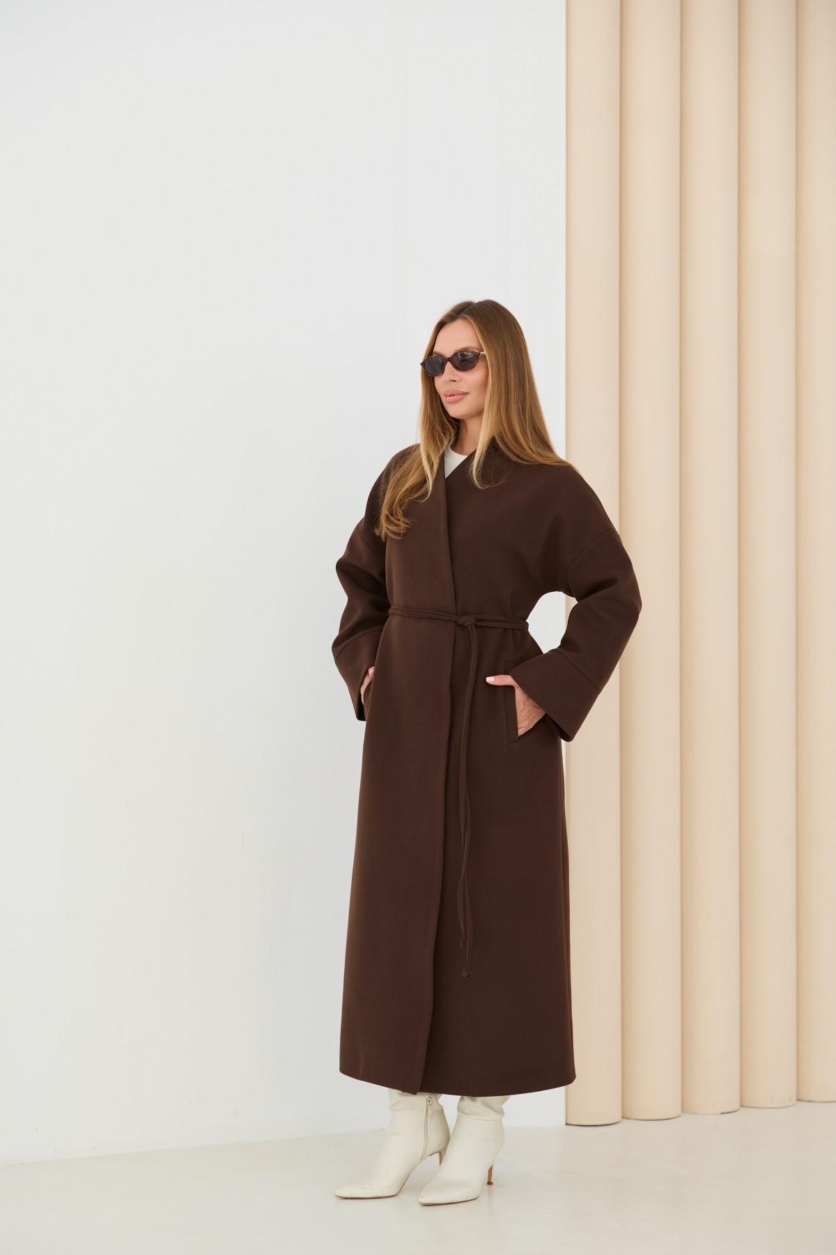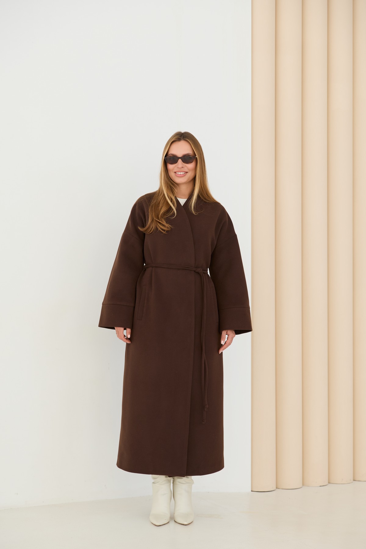 Класичне демісезонне довге пальто прямого сілуету, з цільнокроєною стійкою та спущеною лінією плеча з одношовним рукавом. Довжина пальто - МАКСІ - нижче колін. Застібка на пришивні металеві потайні кнопки. Пояс знімний з основної тканини. Максі-довжинаДовге пальто у стилі кімано. Надягаючи таке пальто, ви відразу створюєте собі модний образ.Кишеня прорізна з листочкою та клапаном.