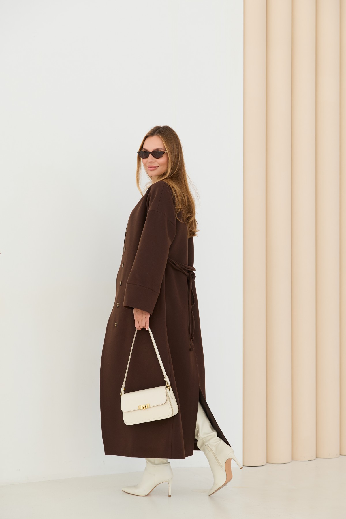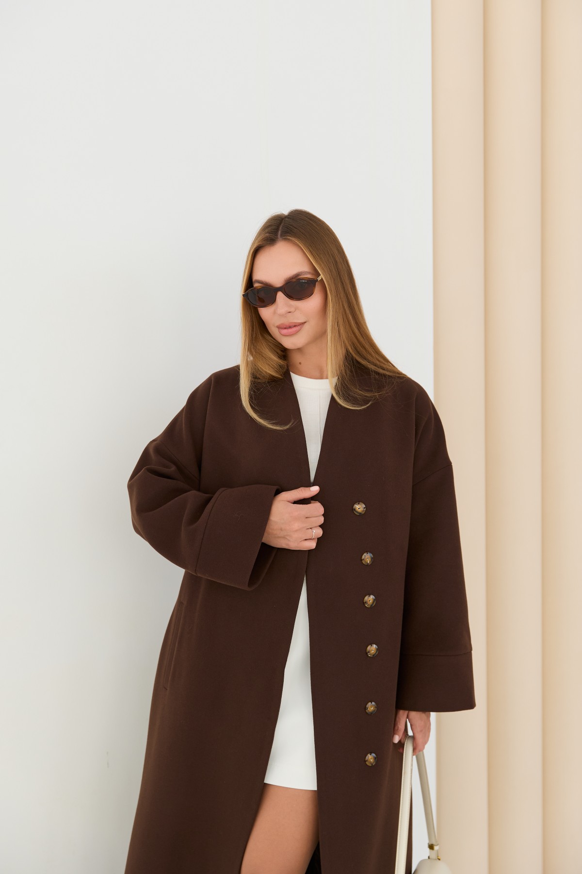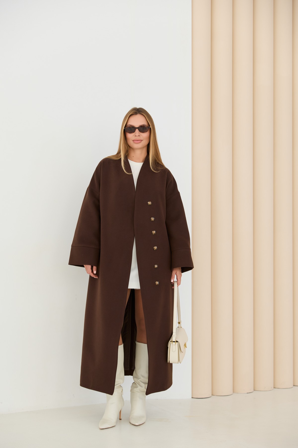 Класичне демісезонне довге пальто прямого сілуету, з цільнокроєною стійкою та спущеною лінією плеча з одношовним рукавом. Довжина пальто - МАКСІ - нижче колін. Застібка на пришивні металеві потайні кнопки. Пояс знімний з основної тканини. Максі-довжинаДовге пальто у стилі кімано. Надягаючи таке пальто, ви відразу створюєте собі модний образ.Кишеня прорізна з листочкою та клапаном.