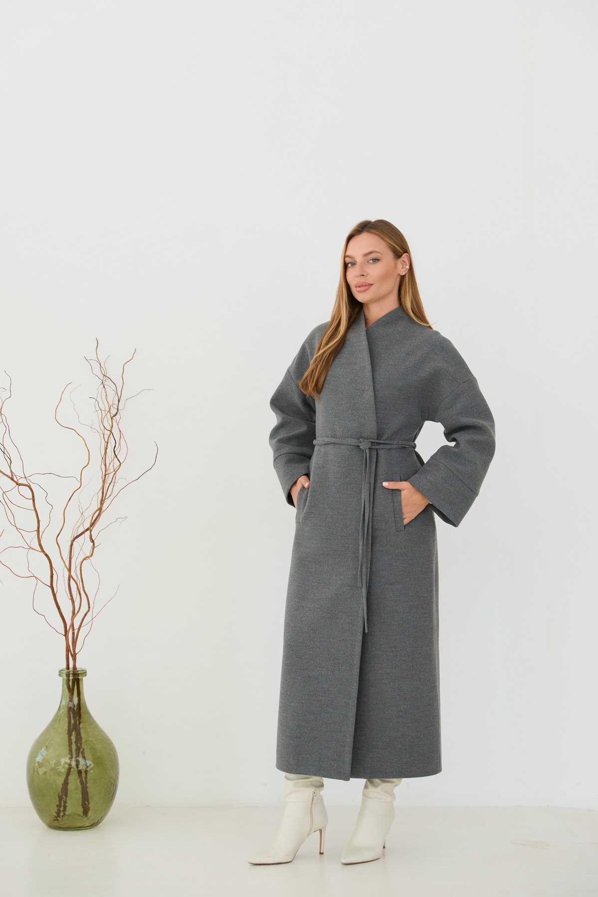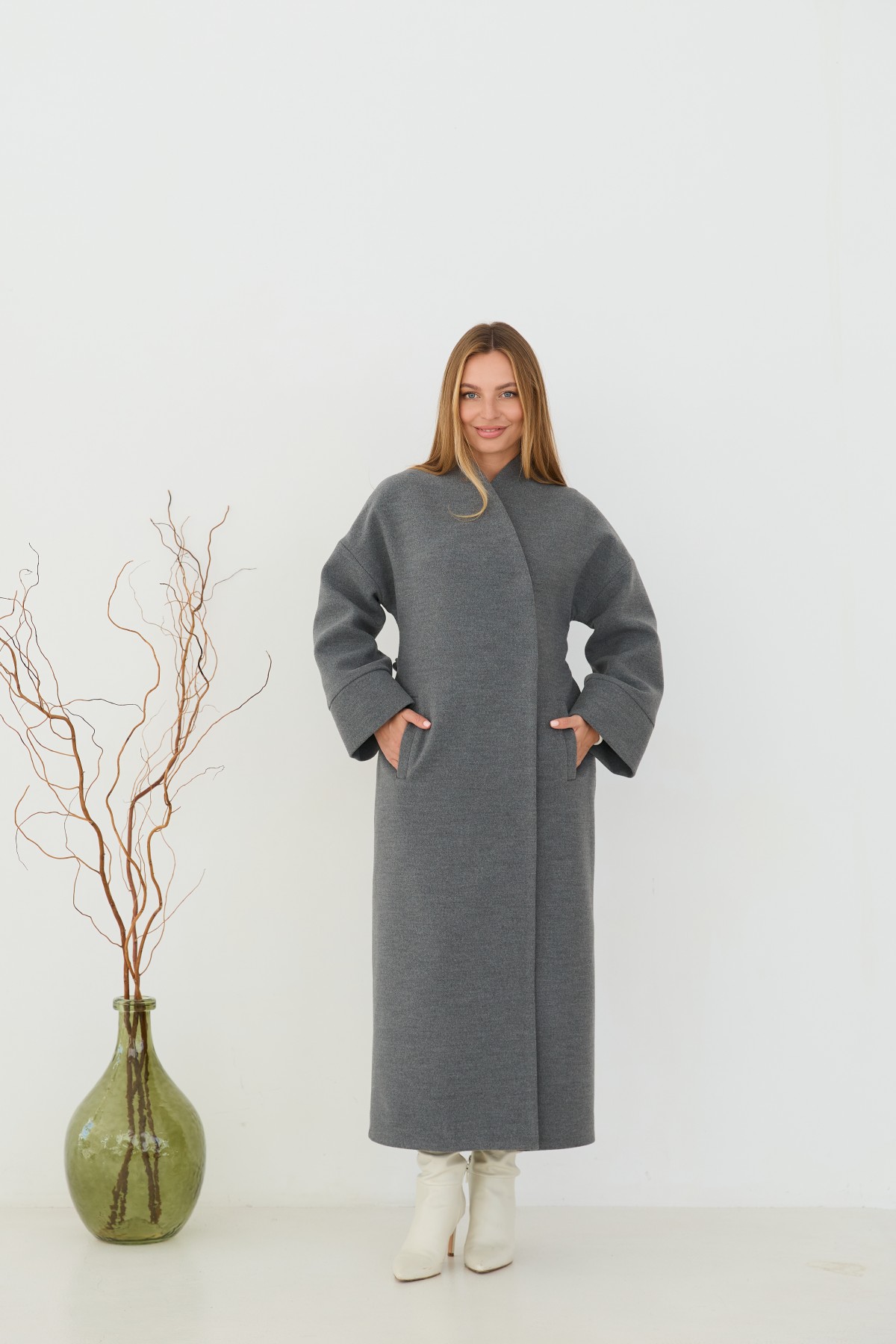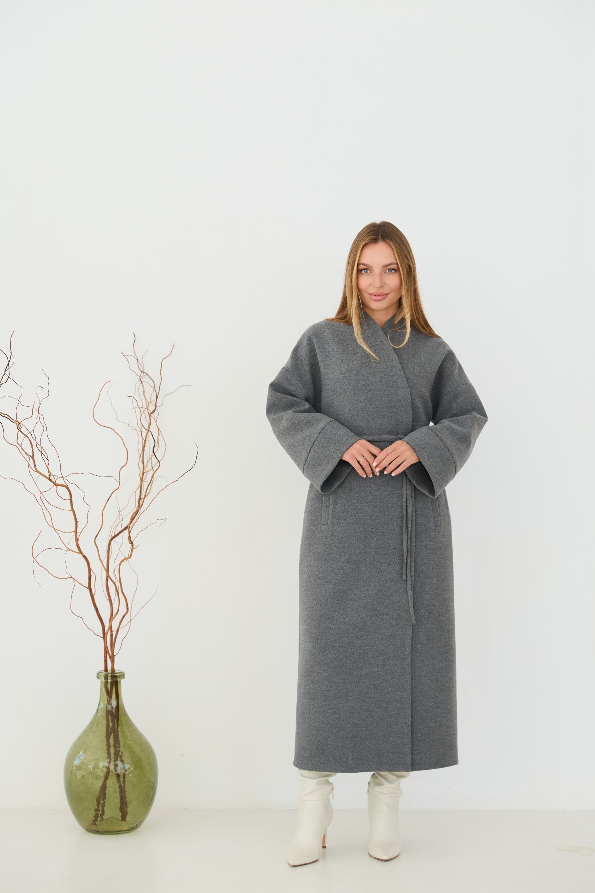 Класичне демісезонне довге пальто прямого сілуету, з цільнокроєною стійкою та спущеною лінією плеча з одношовним рукавом. Довжина пальто - МАКСІ - нижче колін. Застібка на пришивні металеві потайні кнопки. Пояс знімний з основної тканини. Максі-довжинаДовге пальто у стилі кімано. Надягаючи таке пальто, ви відразу створюєте собі модний образ.Кишеня прорізна з листочкою та клапаном.