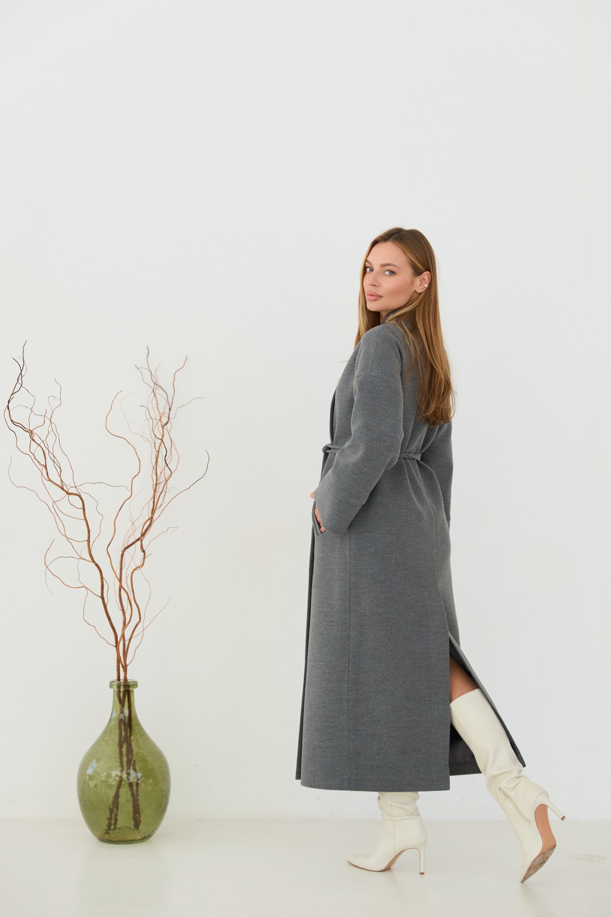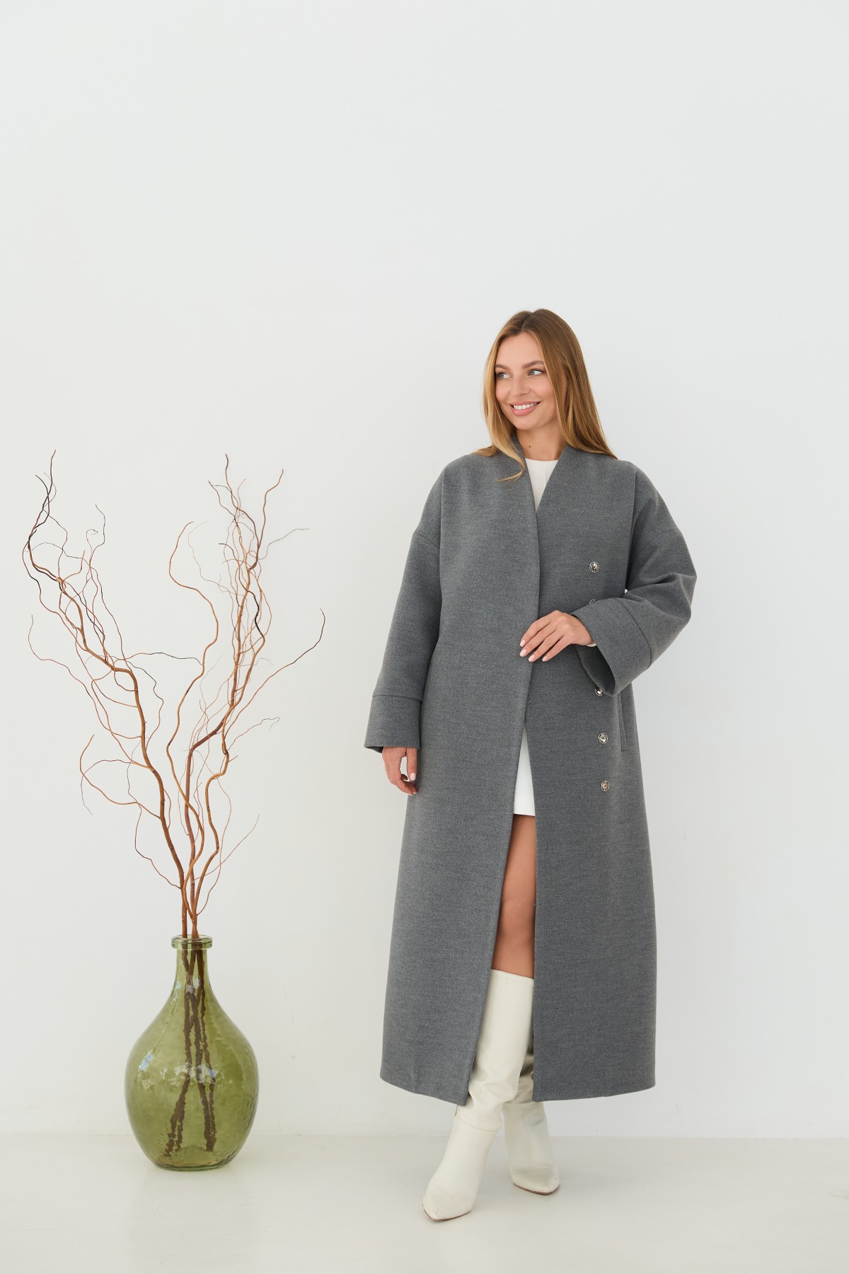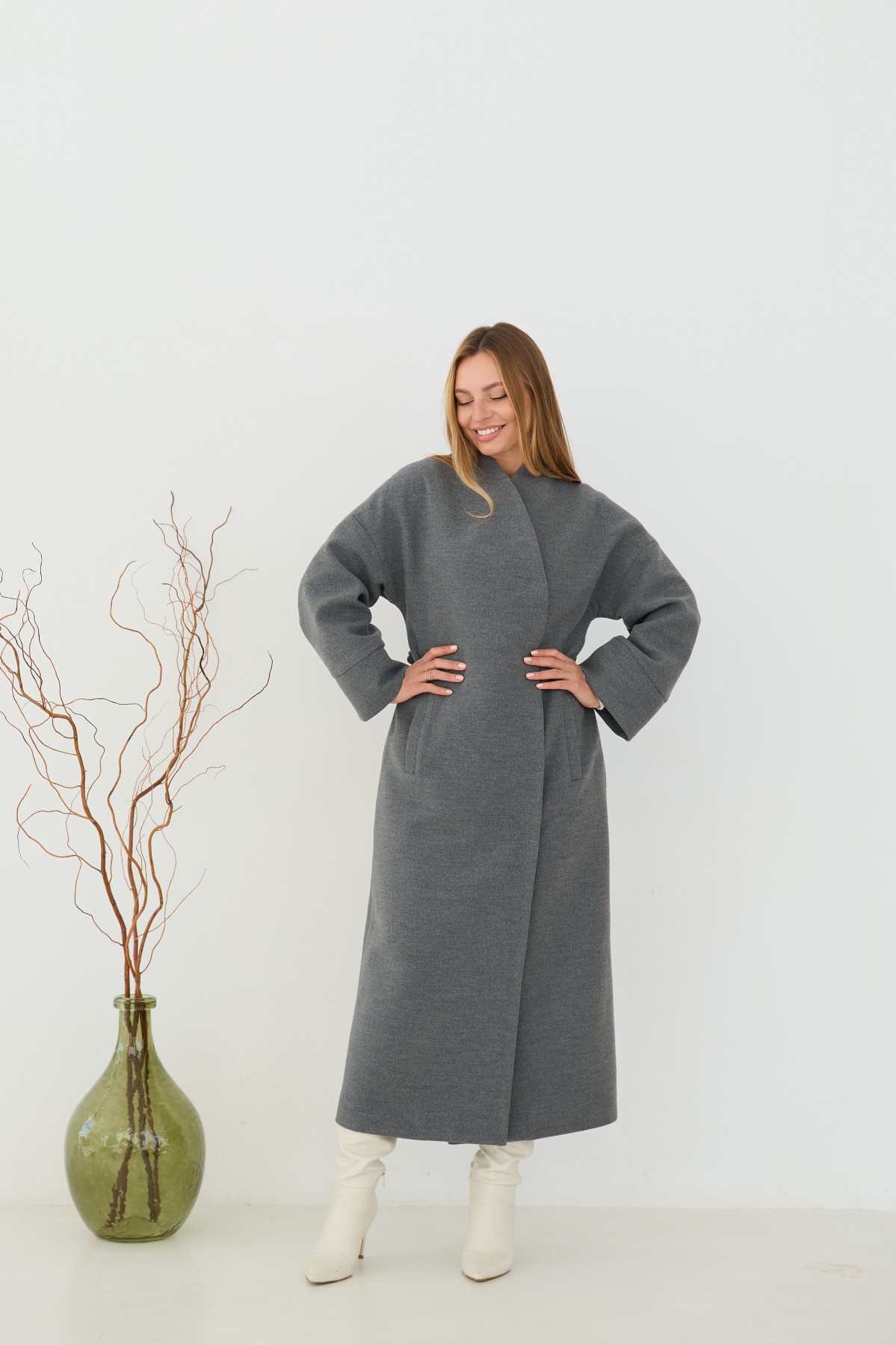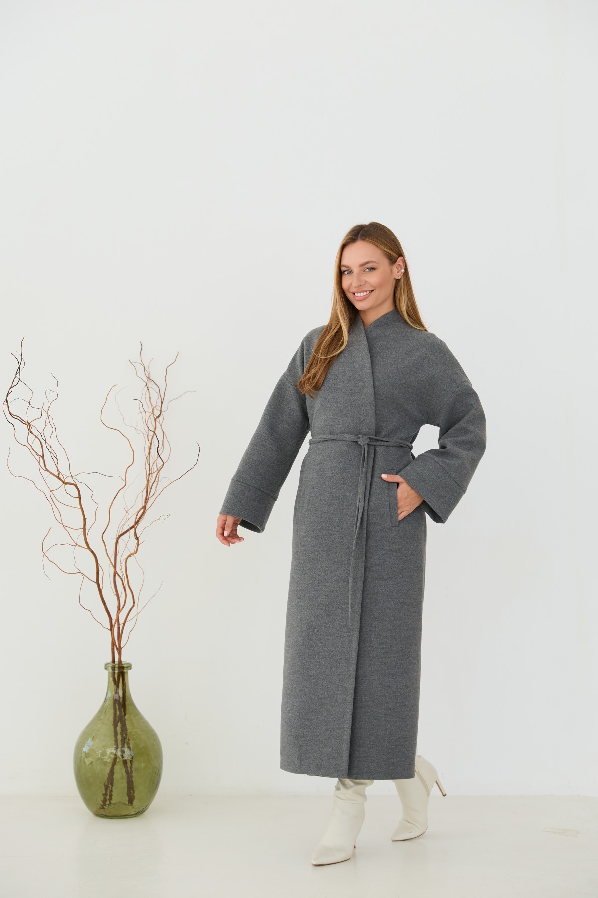 Класичне демісезонне довге пальто прямого сілуету, з цільнокроєною стійкою та спущеною лінією плеча з одношовним рукавом. Довжина пальто - МАКСІ - нижче колін. Застібка на пришивні металеві потайні кнопки. Пояс знімний з основної тканини. Максі-довжинаДовге пальто у стилі кімано. Надягаючи таке пальто, ви відразу створюєте собі модний образ.Кишеня прорізна з листочкою та клапаном.