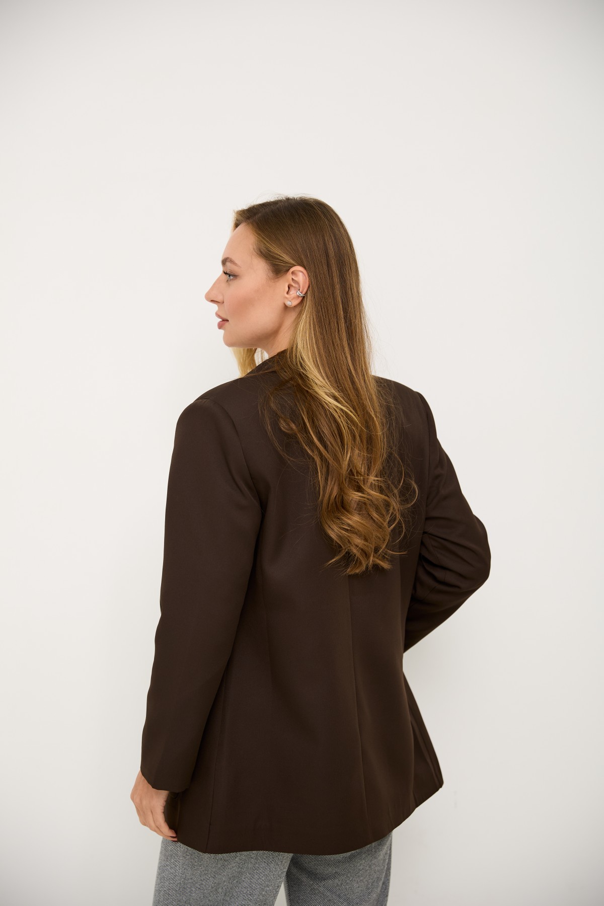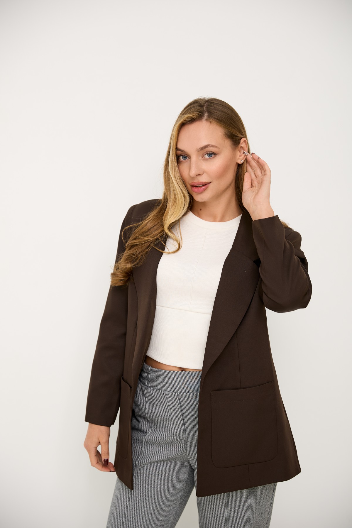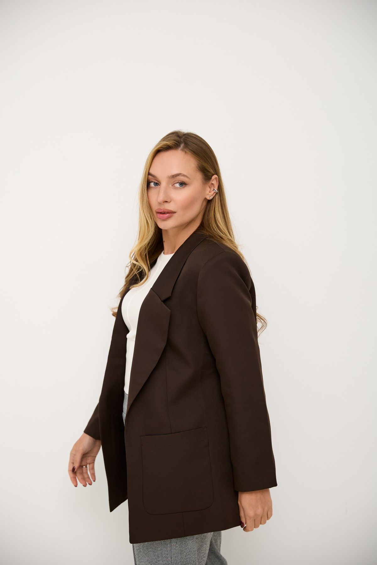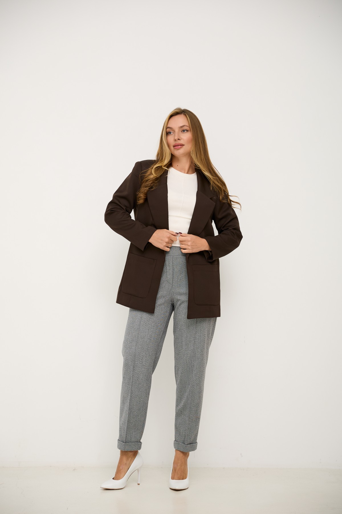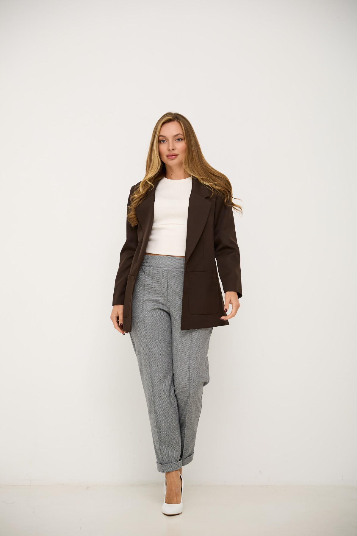 Жіночий стильний молодіжний жакет,виконаний у класичному міському стилі, вільного силуету жакет. Трикотажний жакет довжиною нижче лінії стегон без застібок, з накладними кишенями прямокутної форми та класичної форми коміра – дуже практичний та зручний. Рукав втачний, одношовний, довжиною 7/8 з відворотами. Жакет на принтованной бавовняній підкладці, яка має хороші споживчі якості, а також служить у ролі обробки при відвертанні рукава.