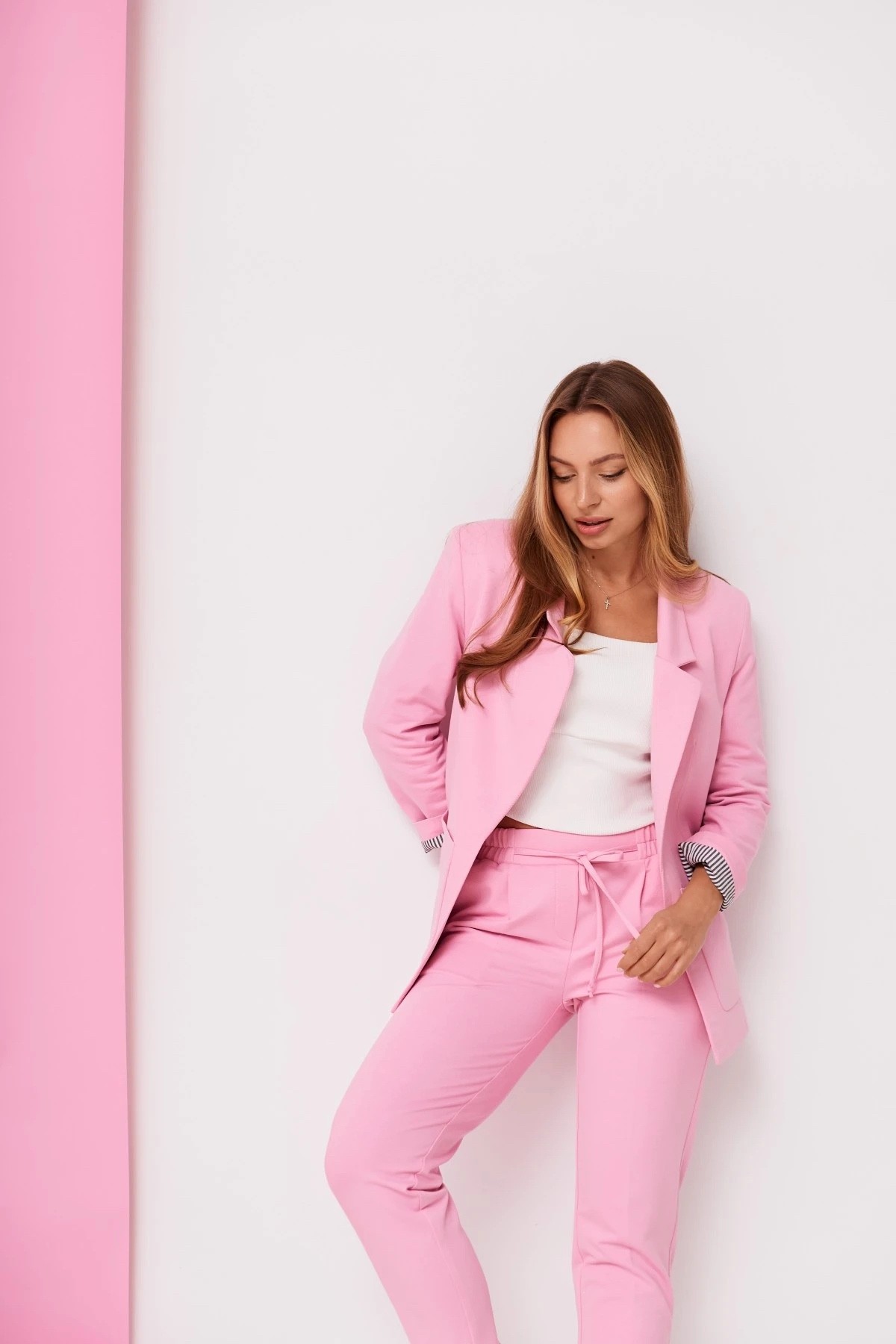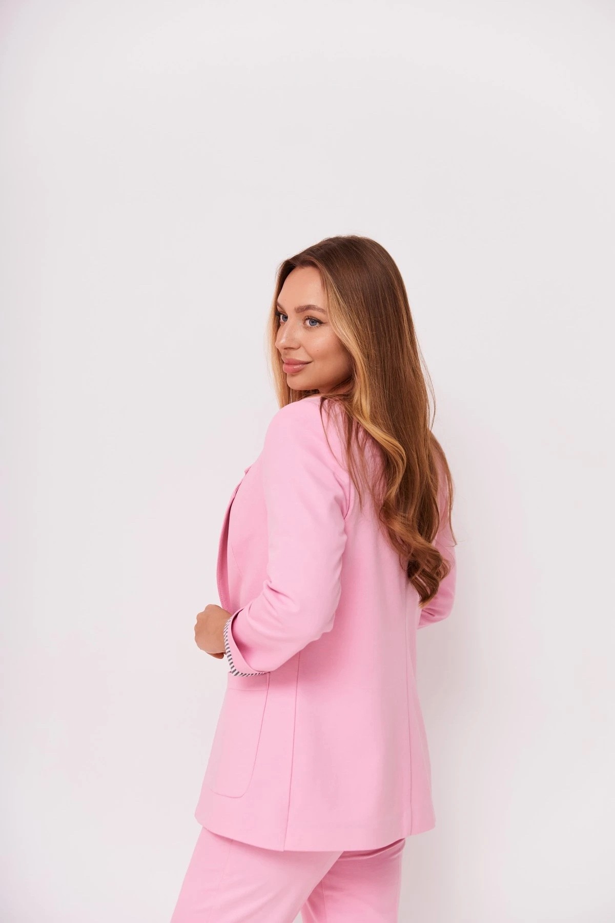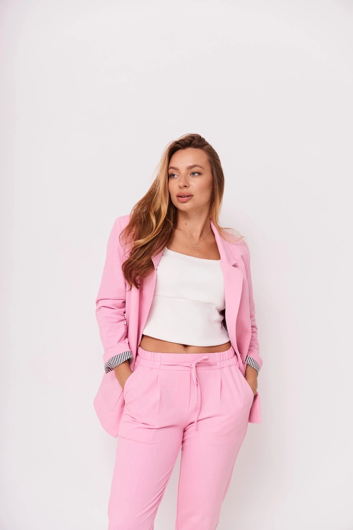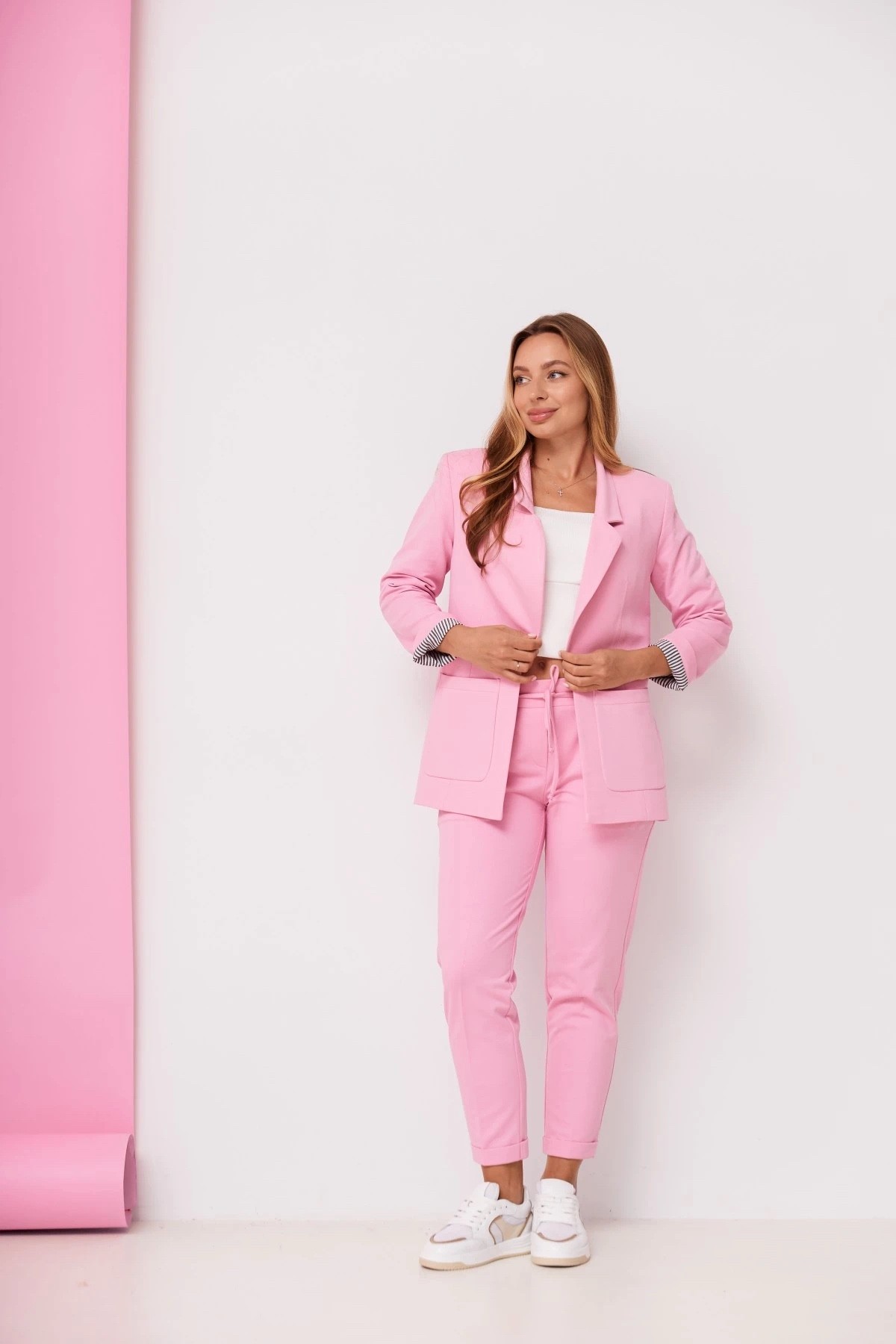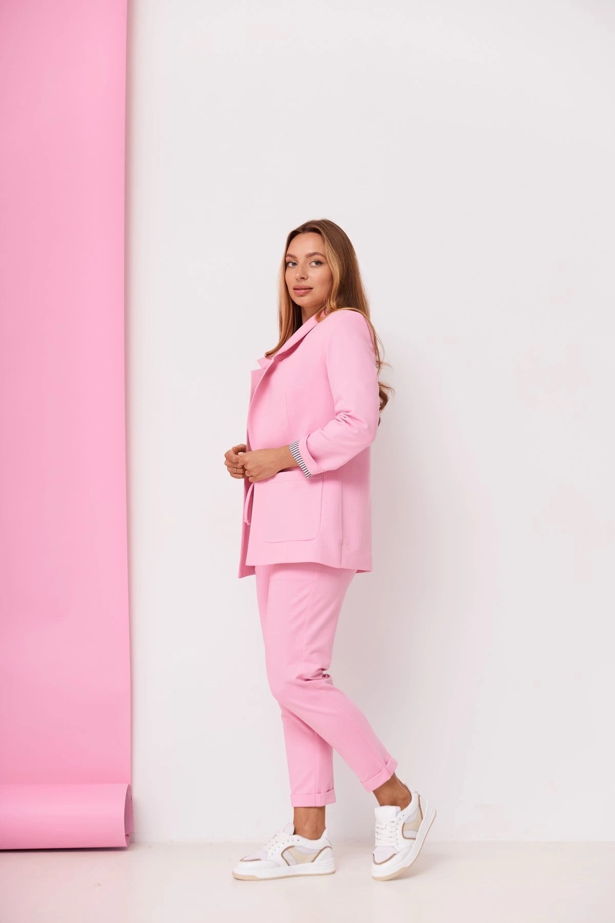 Жіночий стильний молодіжний костюм складається з жакету та штанів, і виконаний у класичному міському стилі, вільного силуету жакет та напівприлеглих штанів із трикотажної двох ниток. Трикотажний жакет довжиною нижче лінії стегон без застібок, з накладними кишенями прямокутної форми та класичної форми коміра – дуже практичний та зручний. Рукав втачний, одношовний, довжиною 7/8 з відворотами. Жакет на принтованной бавовняній підкладці, яка має хороші споживчі якості, а також служить у ролі обробки при відвертанні рукава. Брючки довжиною 7/8, низ з відворотами. У переді та ззаду є стрілка, що надасть необхідну строгість у штанах.