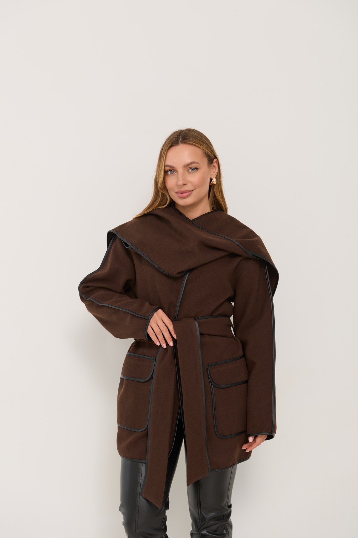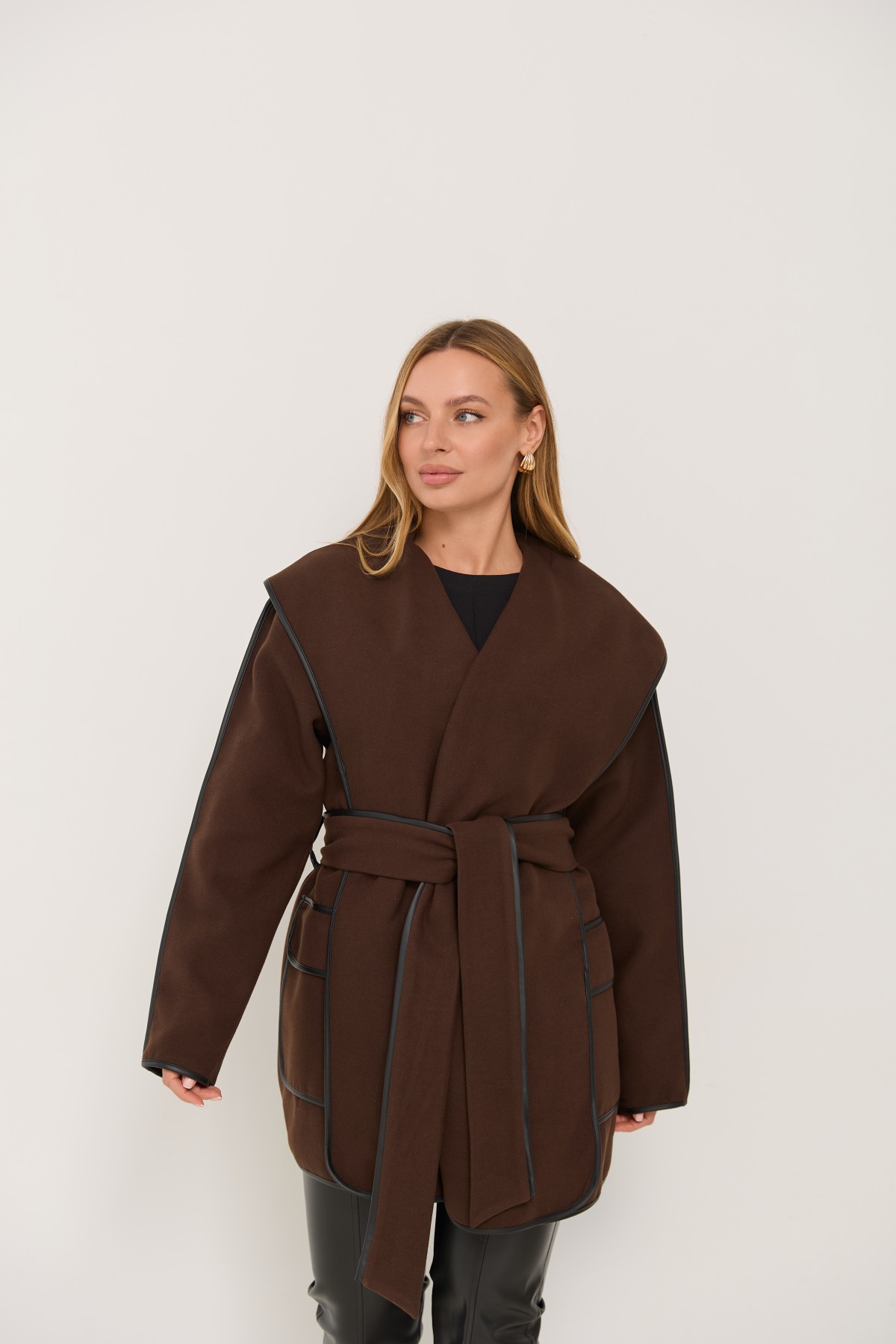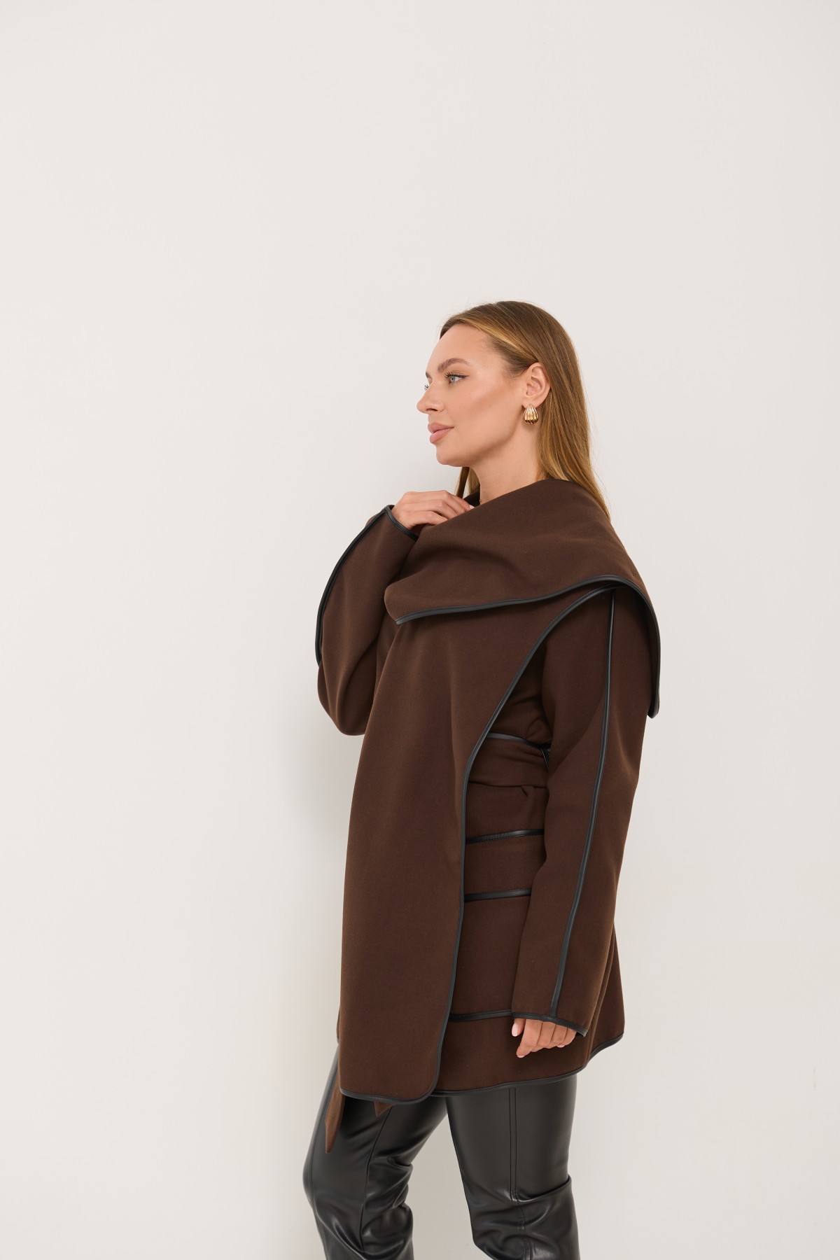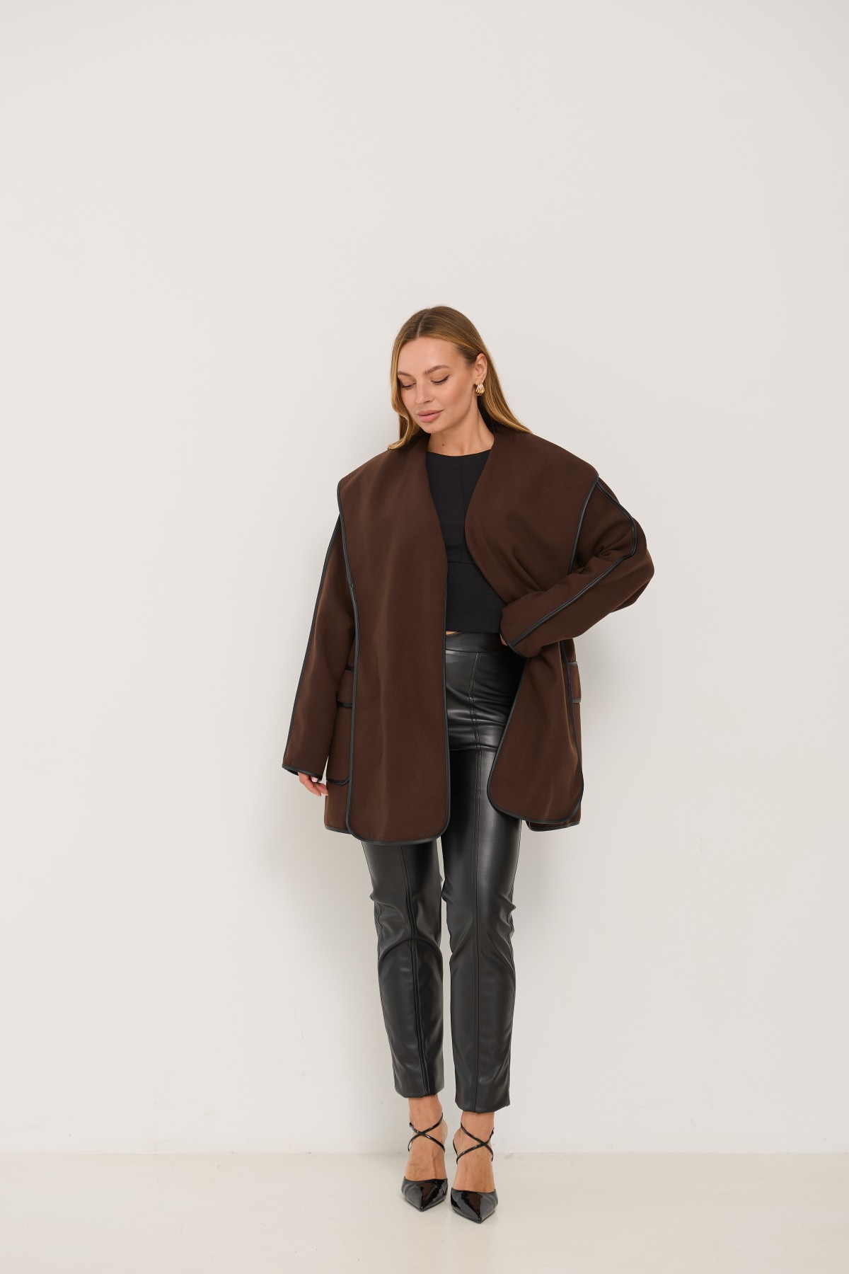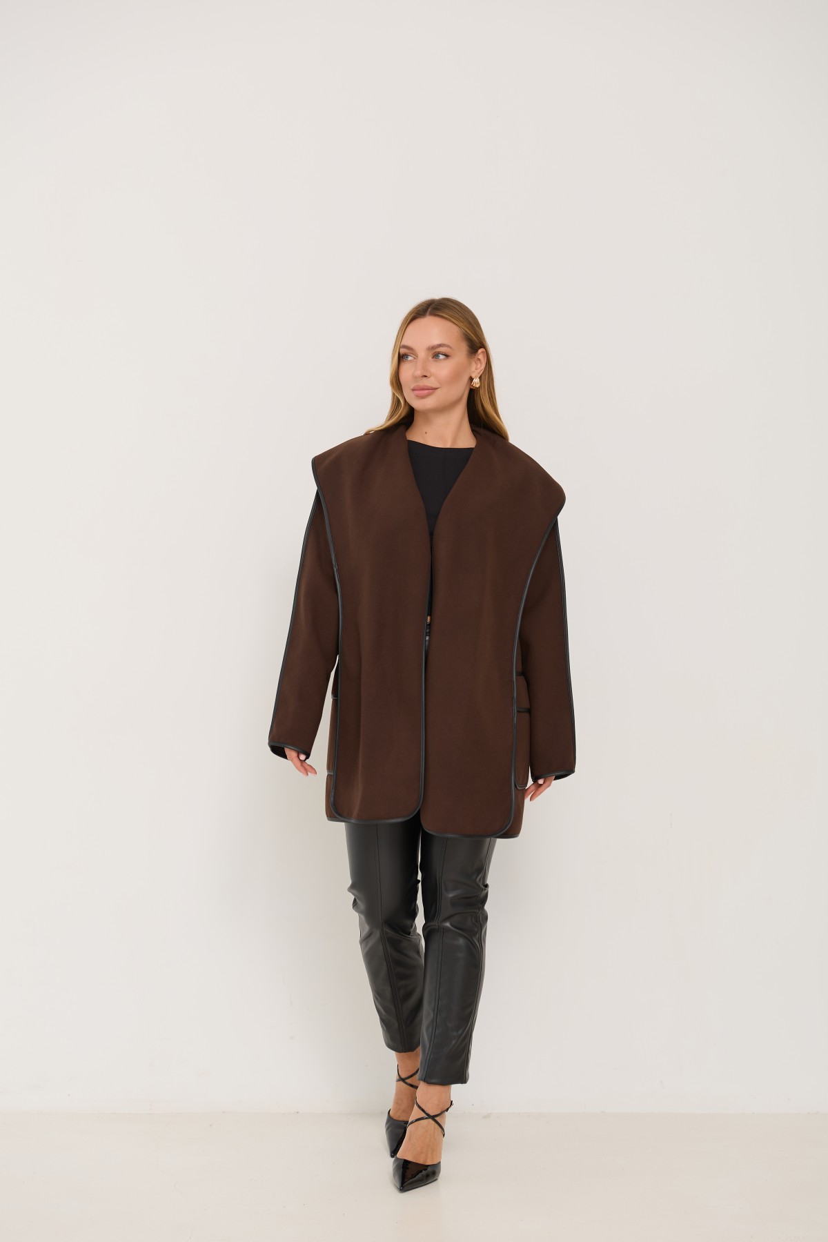 Новинка сезону, пальто без підкладки, декороване бейкою з шкіри еко. Напівприталеного силуету з покроєм "спущене плече і пройм". Довжина пальта трохи вище коліна. Однобортна застібка на пришивних кнопках. Комір-шарф декорований бейкою з еко шкіри. тканини декорований бейкою із еко шкіри.Новинка цього сезону, чудово підходить під одяг вільного крою та під класичний брючний костюм. Елегантно пальто буде виглядати як під ошатне, так і під повсякденне плаття. Його можна носити, як під класичне взуття, так і міксувати із взуттям у спортивному стилі.