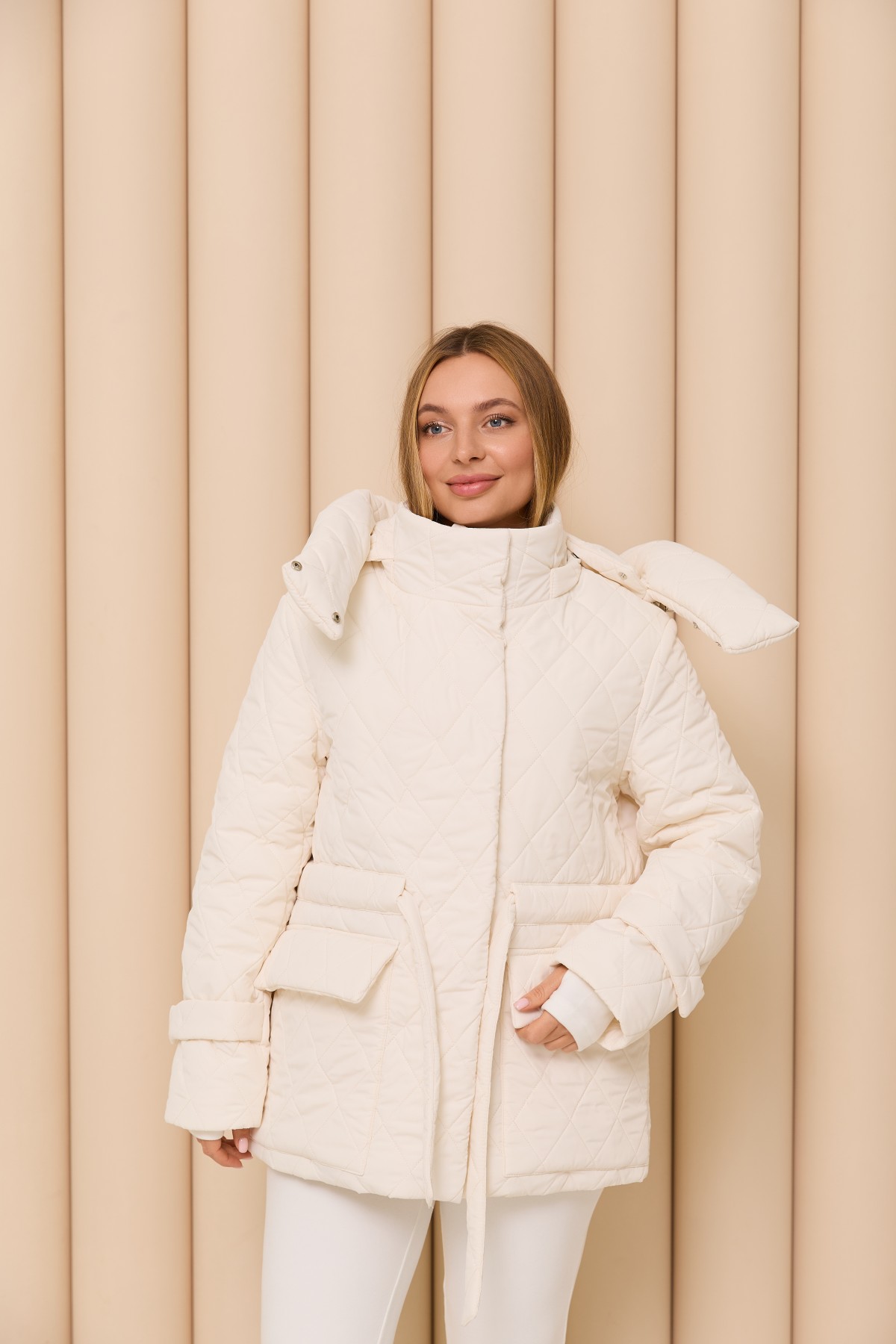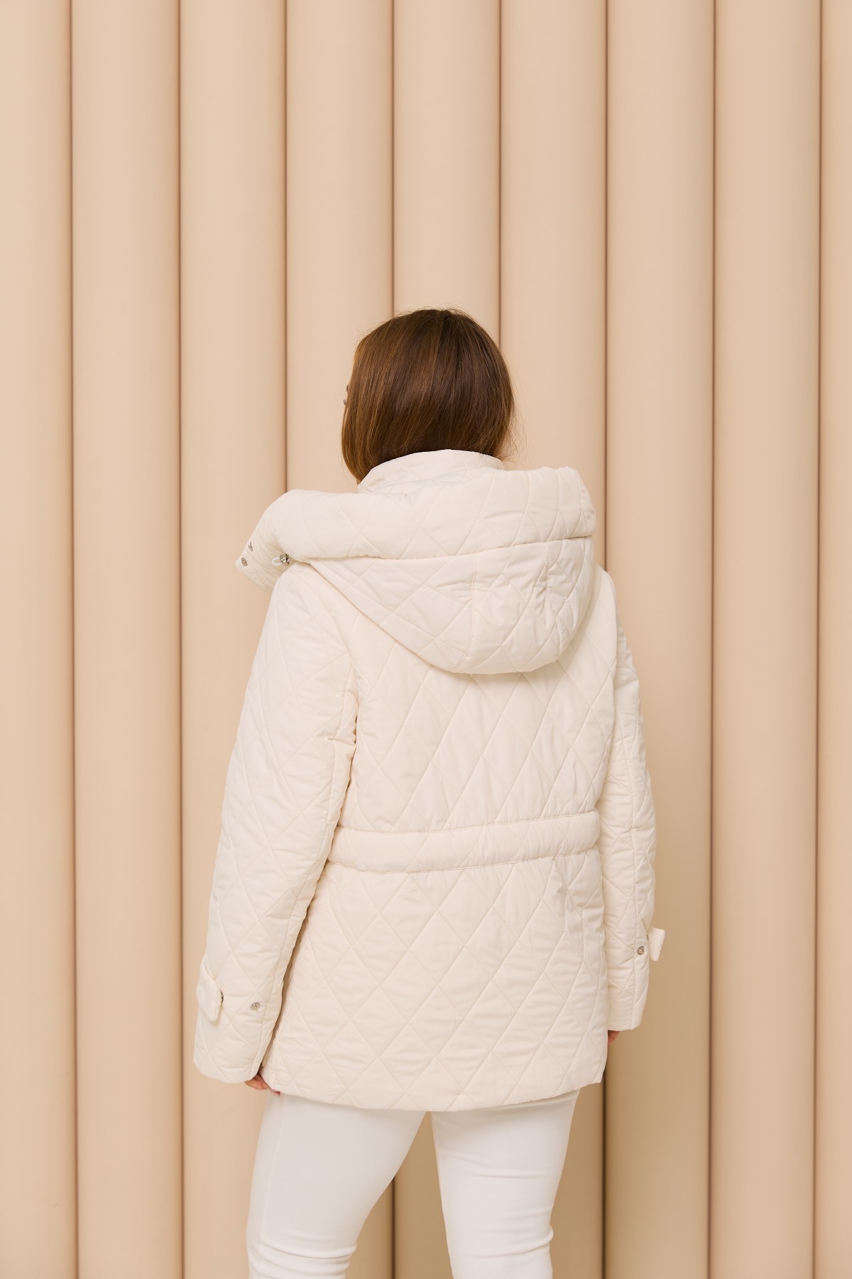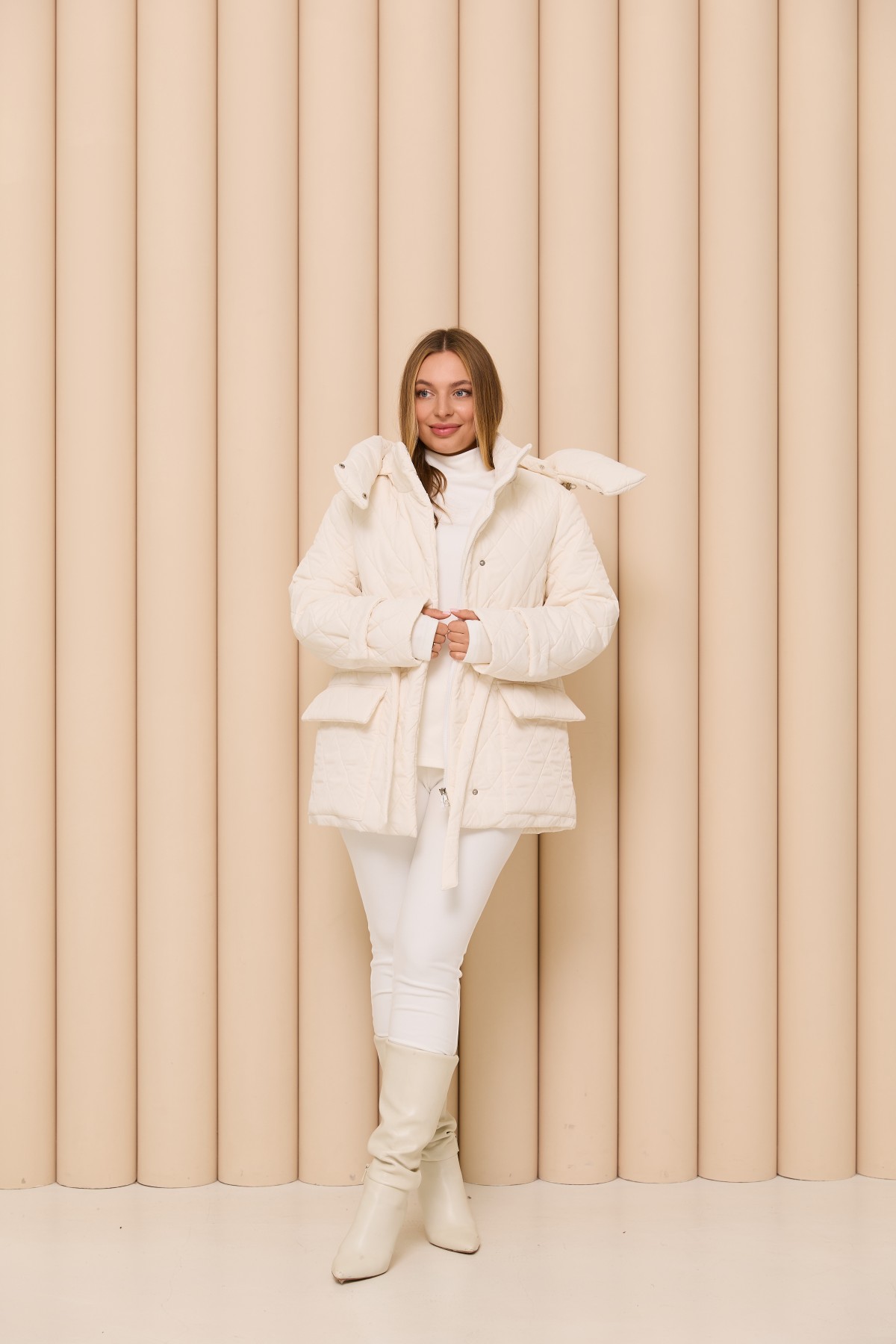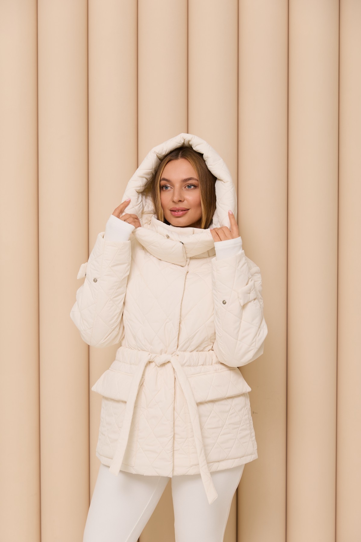 Стильна зимова куртка довжиною до колін, з капюшоном що відстібається на кнопках, та є куліса з фіксаторами для зручності регулювання обєму по переду капюшона. Рукав втачний, двошовний, з патами на кнопках по низу рукавів. Довжина куртки - до колін. Кишені накладні з клапанами. Лінія талії фіксується настрочною кулісою з поясом з основної тканини.зимова куртка відмінно підходить для прогулянки в парку на свіжому повітрі, та для щоденного носіння в умовах міського ритму. Застібка на блискавці, та кнопках.