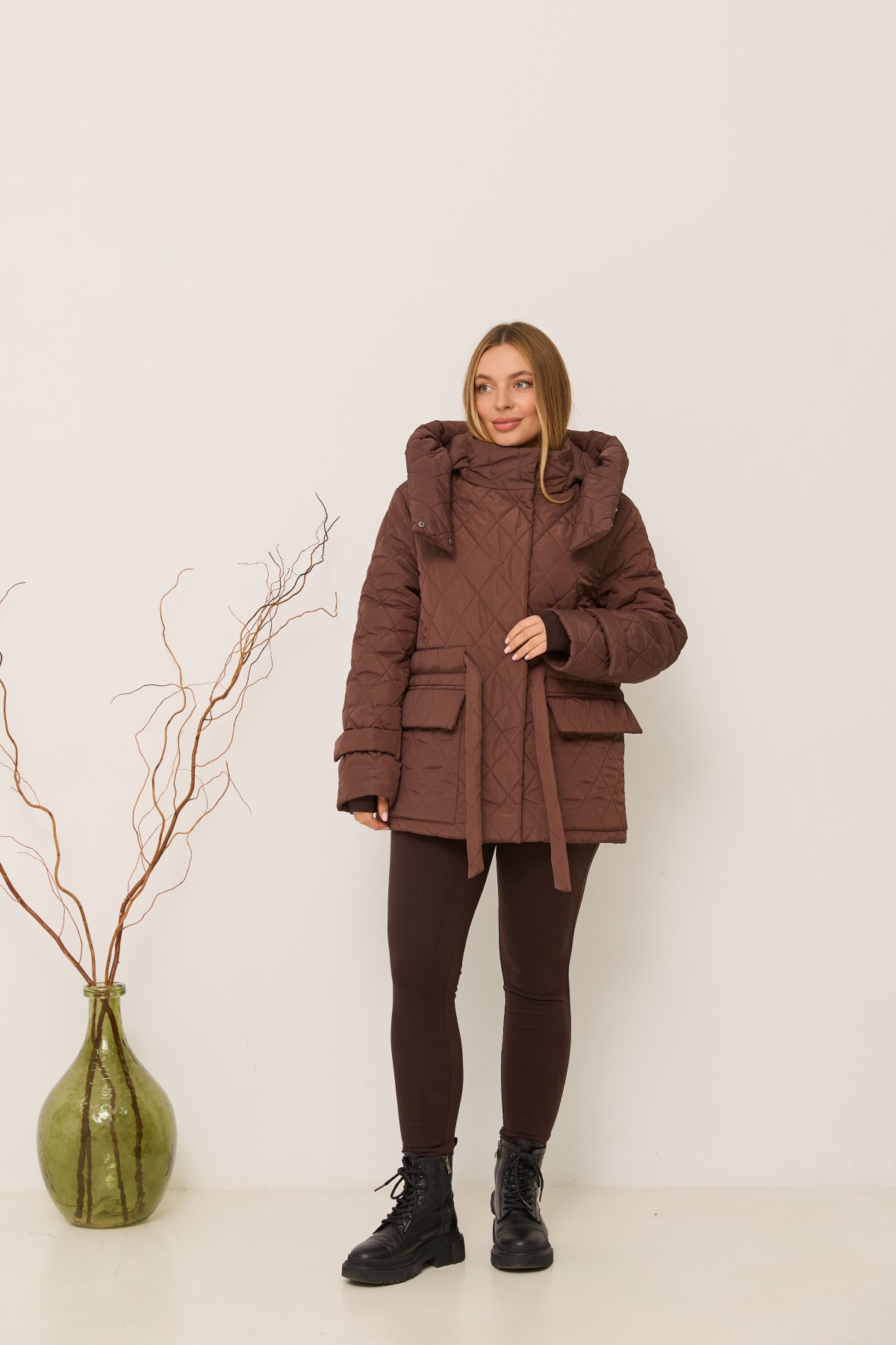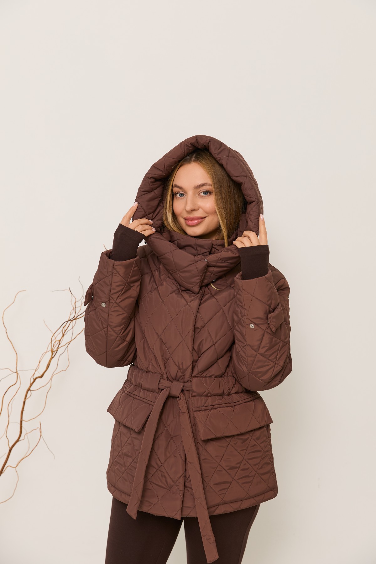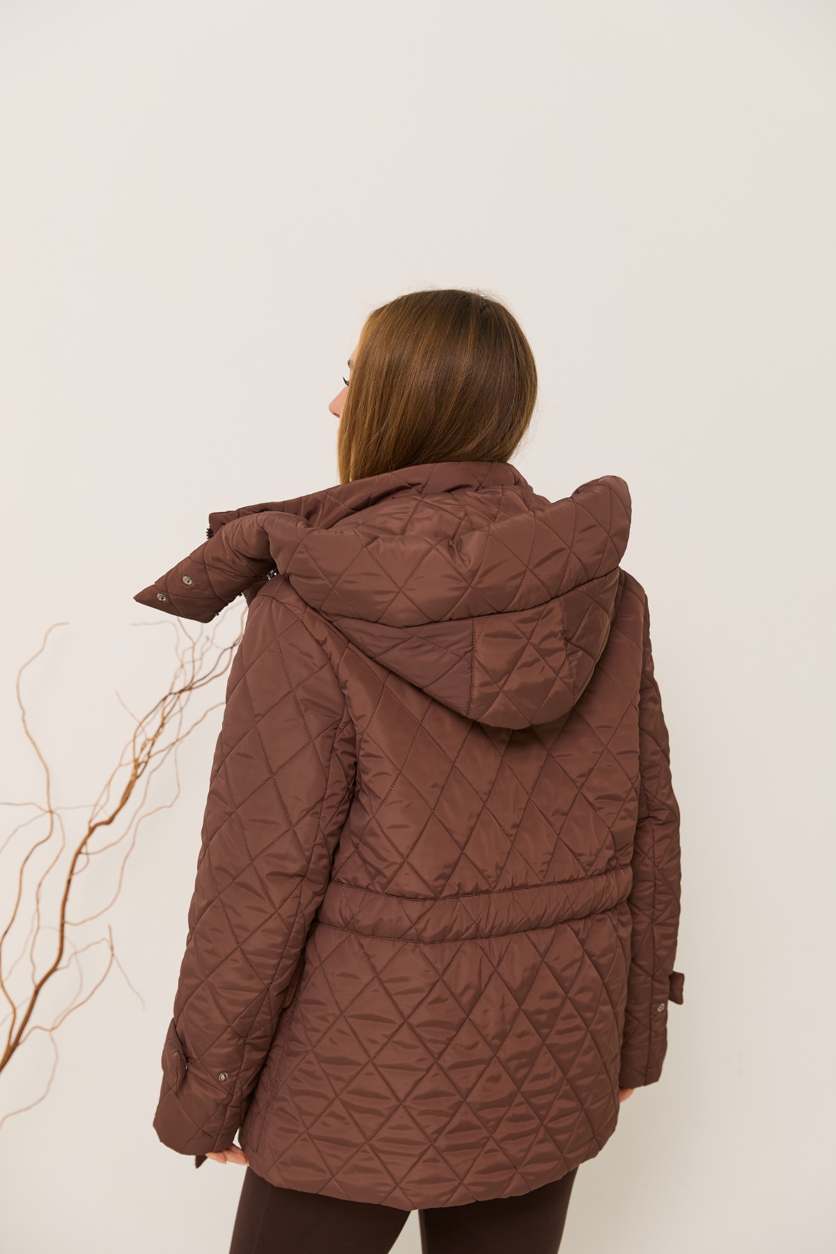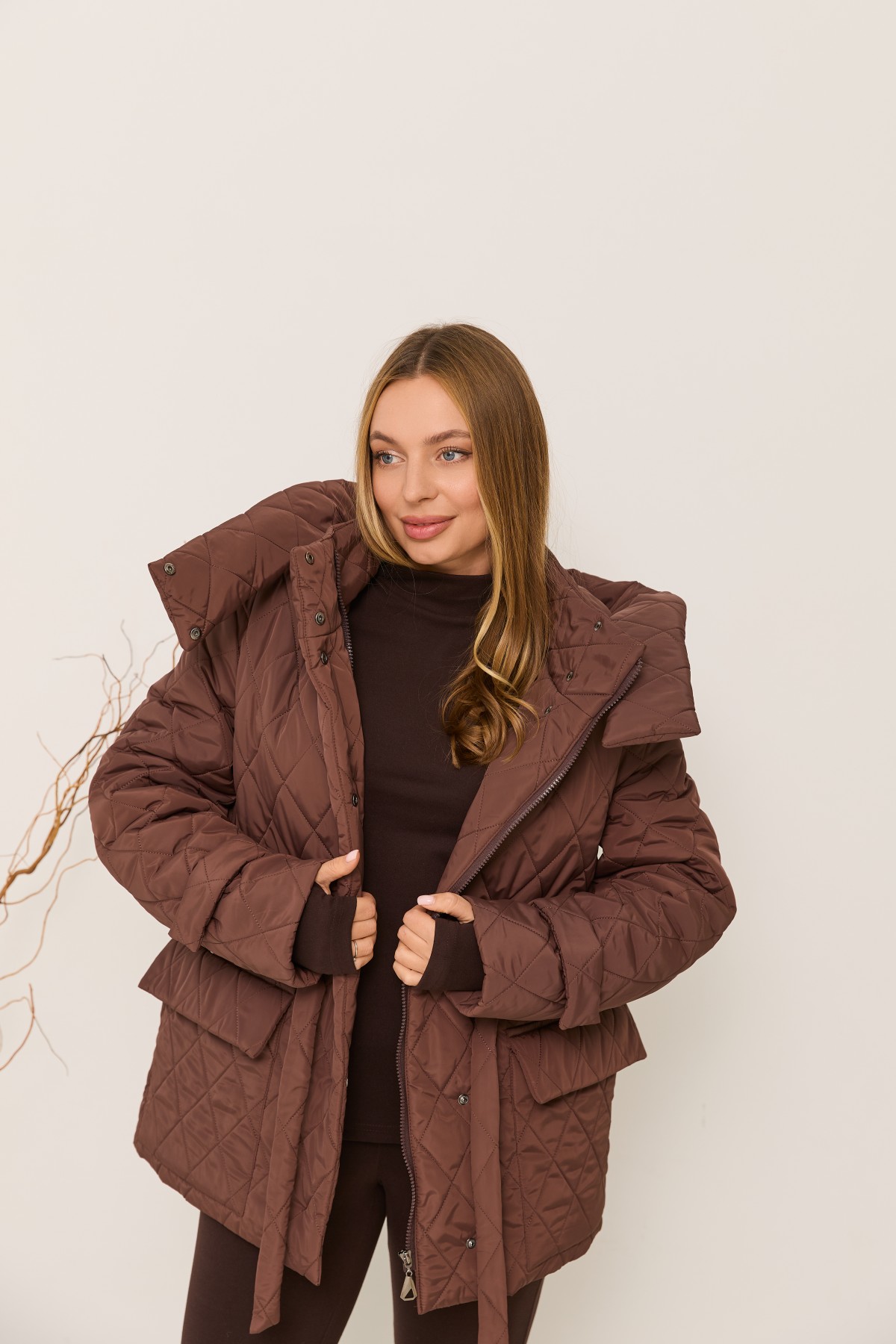 Стильна зимова куртка довжиною до колін, з капюшоном що відстібається на кнопках, та є куліса з фіксаторами для зручності регулювання обєму по переду капюшона. Рукав втачний, двошовний, з патами на кнопках по низу рукавів. Довжина куртки - до колін. Кишені накладні з клапанами. Лінія талії фіксується настрочною кулісою з поясом з основної тканини.зимова куртка відмінно підходить для прогулянки в парку на свіжому повітрі, та для щоденного носіння в умовах міського ритму. Застібка на блискавці, та кнопках.