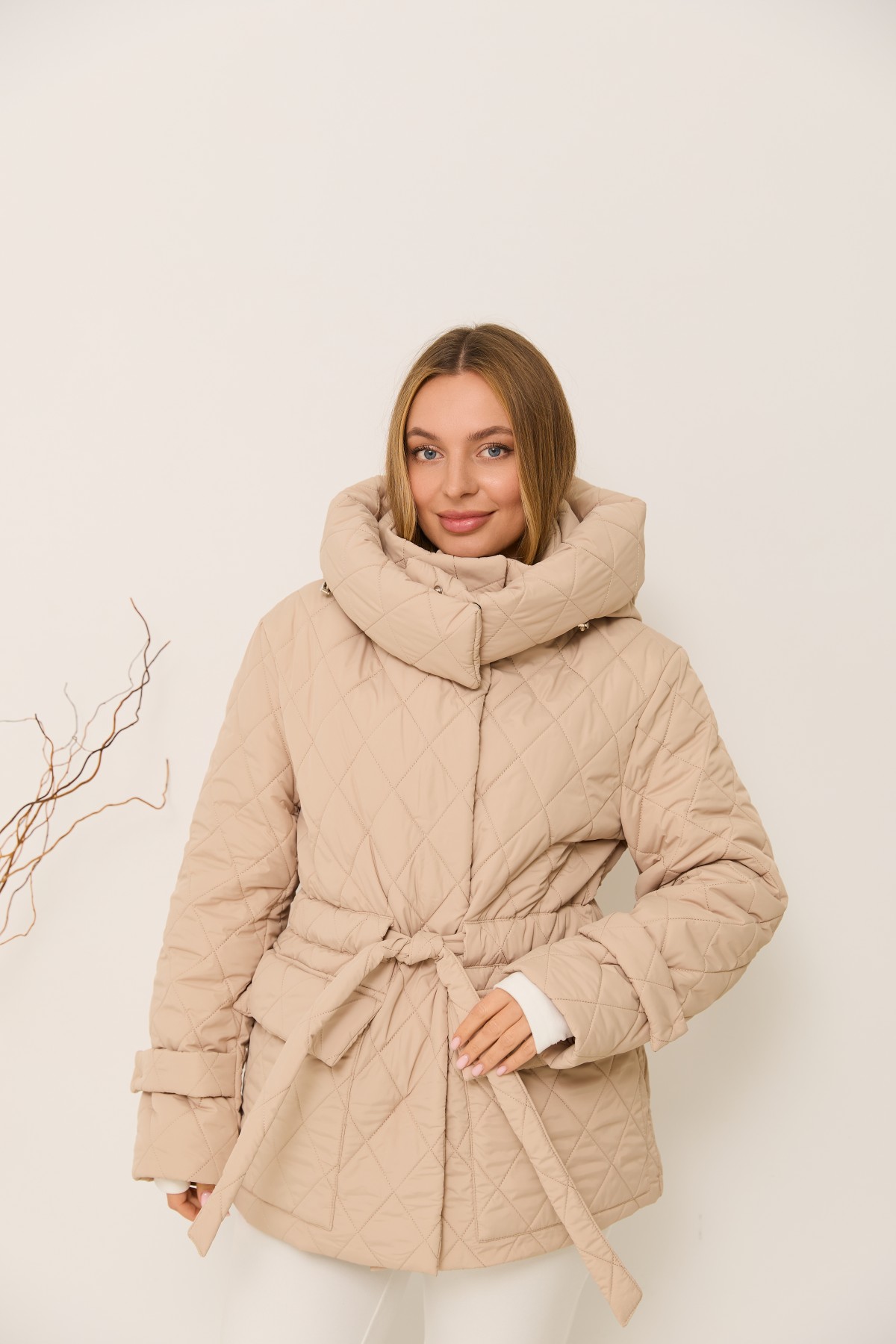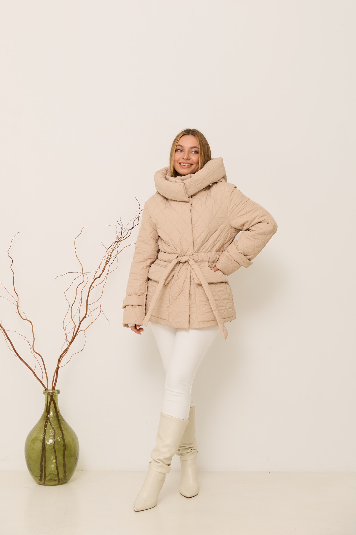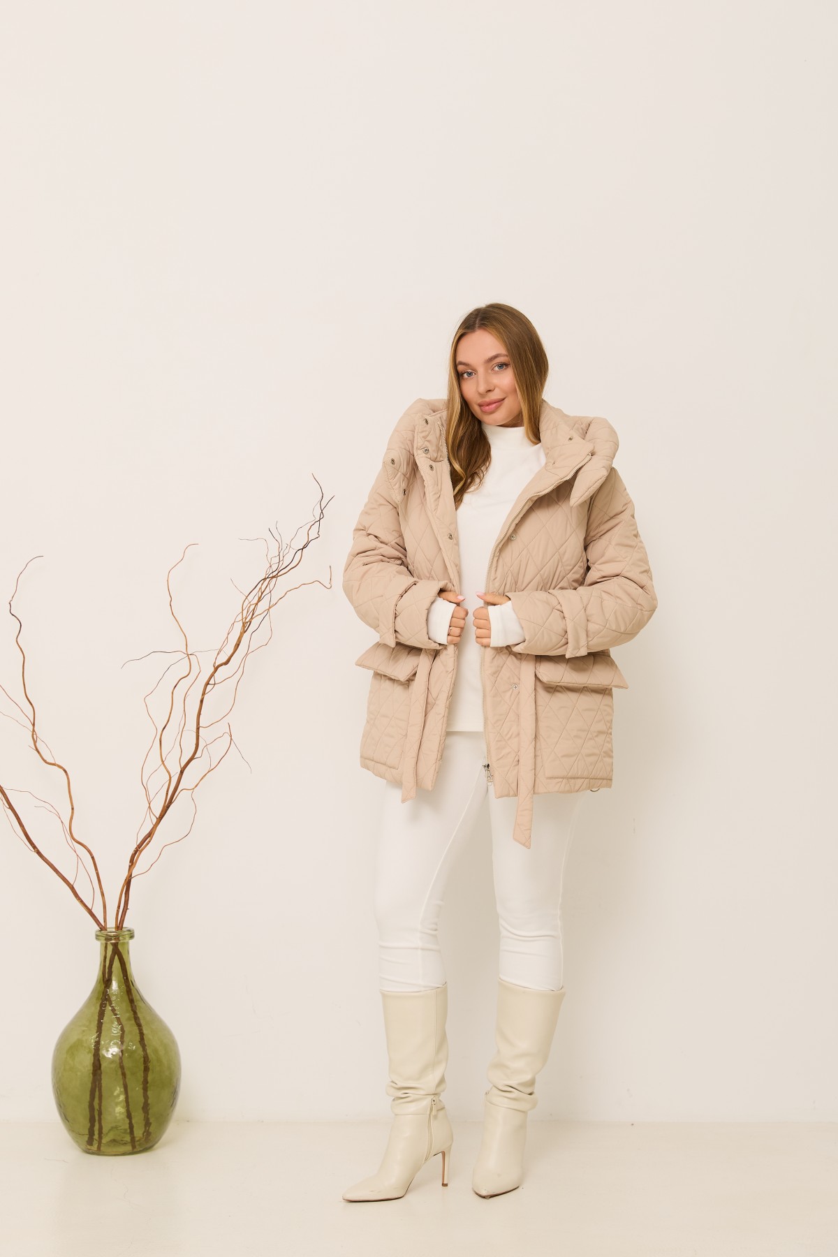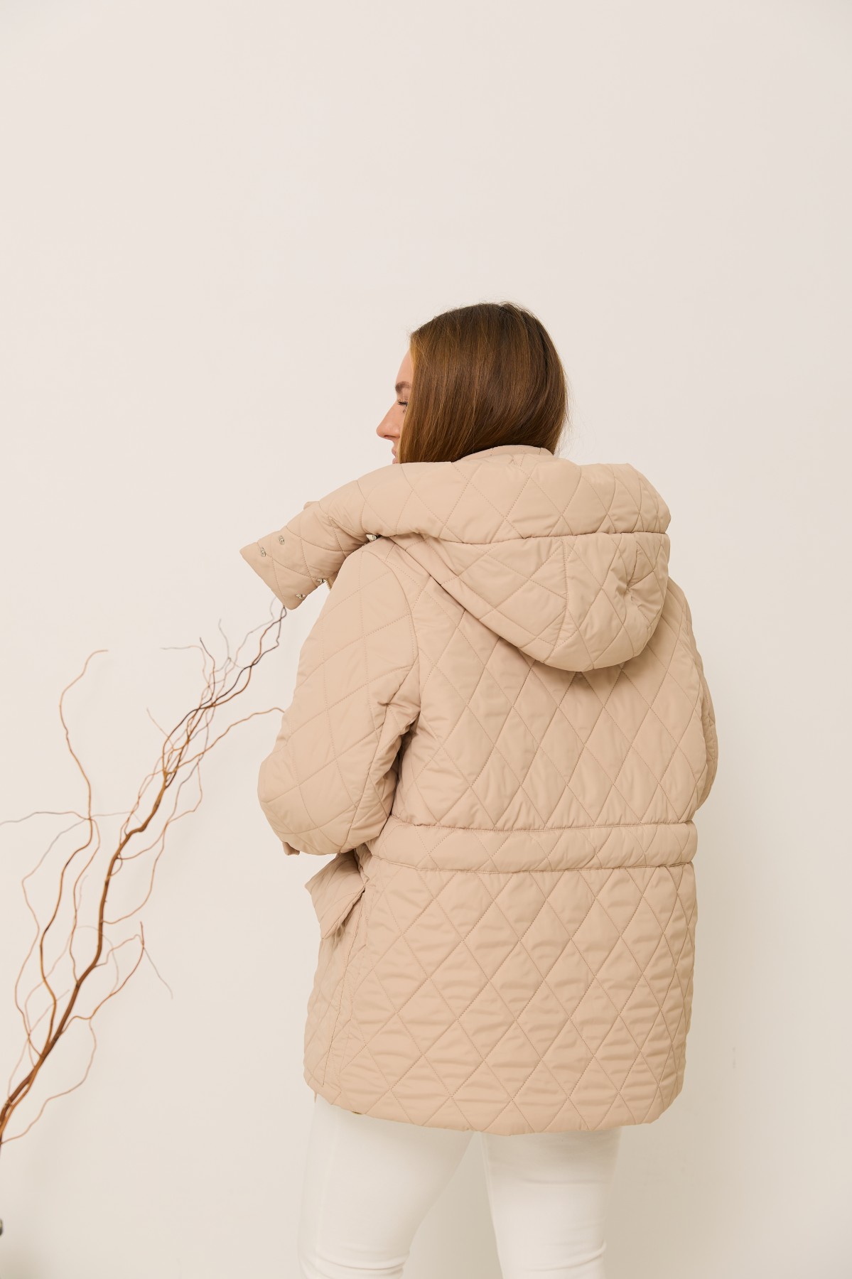 Стильна зимова куртка довжиною до колін, з капюшоном що відстібається на кнопках, та є куліса з фіксаторами для зручності регулювання обєму по переду капюшона. Рукав втачний, двошовний, з патами на кнопках по низу рукавів. Довжина куртки - до колін. Кишені накладні з клапанами. Лінія талії фіксується настрочною кулісою з поясом з основної тканини.зимова куртка відмінно підходить для прогулянки в парку на свіжому повітрі, та для щоденного носіння в умовах міського ритму. Застібка на блискавці, та кнопках.